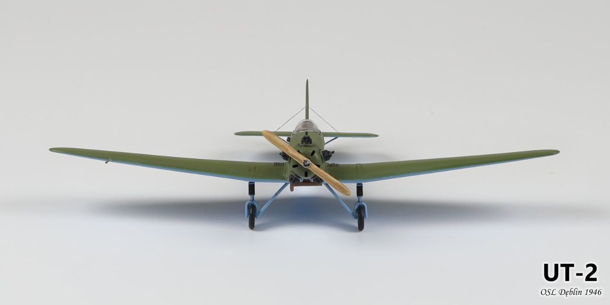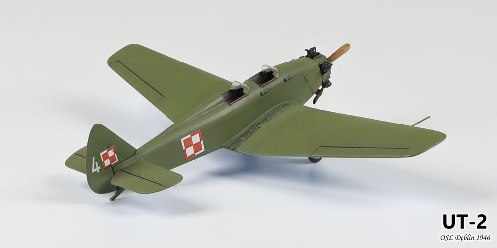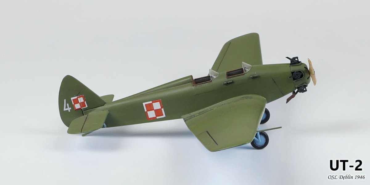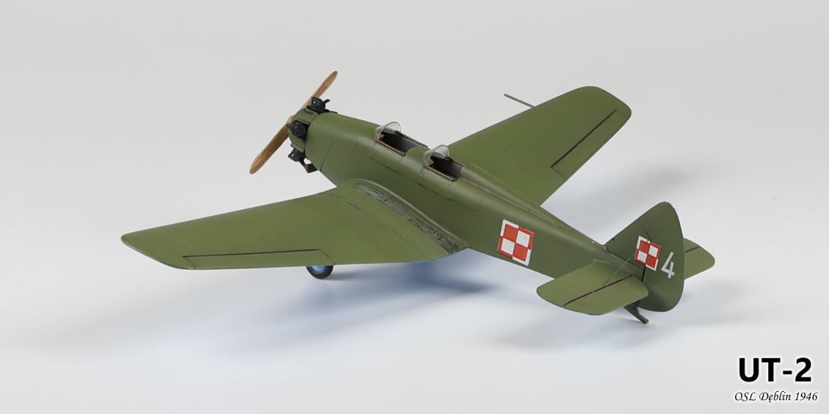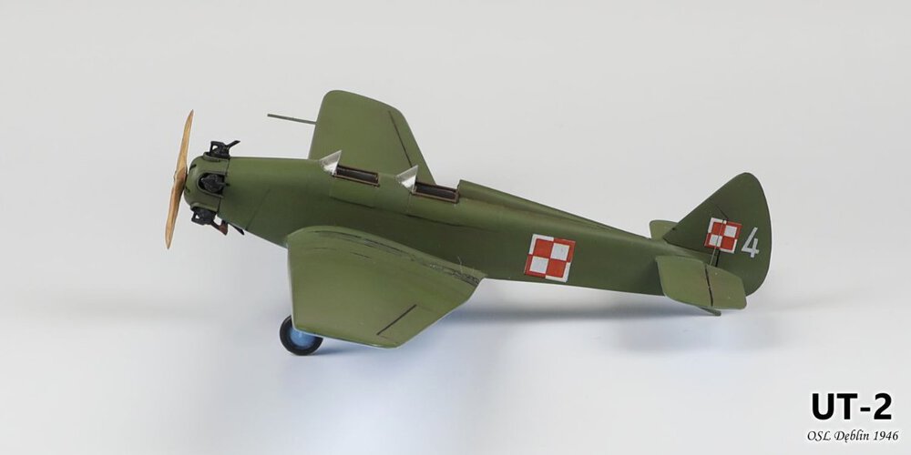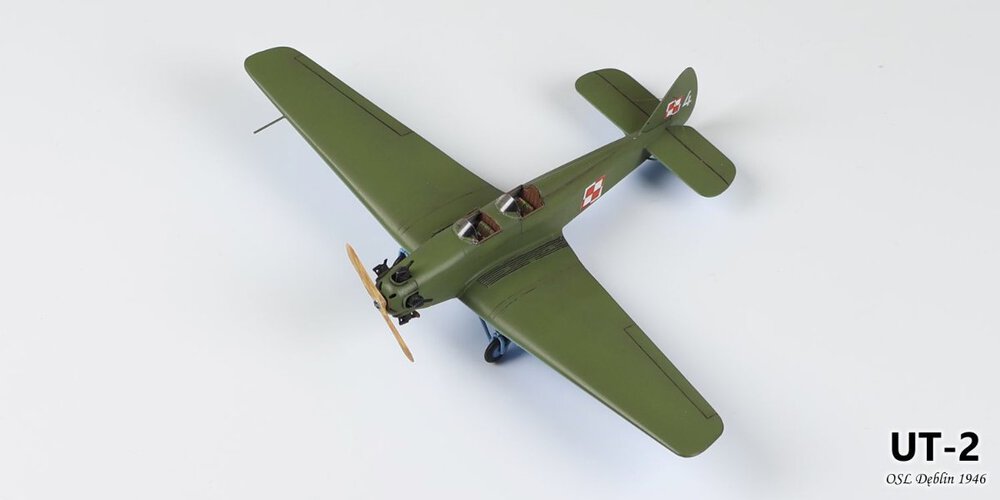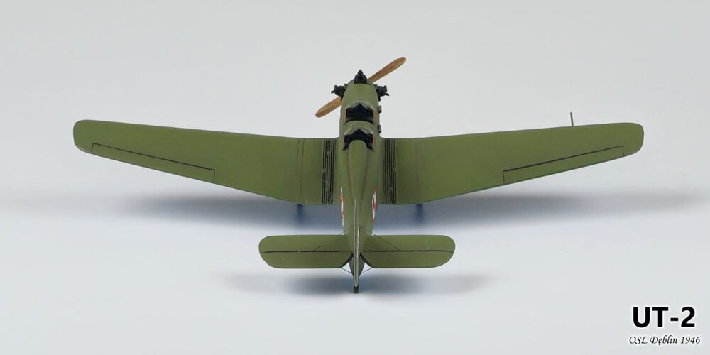 O samolocie: UT-2 to radziecki dwumiejscowy samolot szkolno-treningowy z lat 30. XX wieku. Dolnopłat o stałym podwoziu i drewnianej konstrukcji, wyposażony w silnik gwiazdowy M-11D o mocy 125 KM. Prototyp (znany jako AIR-10), zaprojektowany przez Aleksandra Jakowlewa, oblatano w 1935 r. Produkcja seryjna trwała do 1947 r., obejmując ponad 7200 egzemplarzy. Wersja rozwojowa to UT-2M. O egzemplarzu: Po II wojnie światowej UT-2 stanowił podstawowy samolot do szkolenia pilotów w Oficerskiej Szkole Lotniczej (OSL) w Dęblinie ("Szkołą Orląt"). Już 8 marca 1945 r. przebazowano tam 13 maszyn z Zamościa, a 20 marca rozpoczęto praktyczne szkolenie 3. Eskadry Szkolnej. Używano ich do podstawowego pilotażu – lotów po okręgu, do strefy czy akrobacji niższego stopnia. Malowanie na podstawie TBiU + zdjęć z OSL (inne numer maszyn: 9 czy 12). O modelu: Jaki Amodel jest każdemu, kto zetknął się z "produktem" ten wie Prawdopodobnie dałoby się wykorzystać z modelu więcej elementów "drobnicy", ale mam w planach jeszcze UT-2M z Broplanu a tam dopiero byłyby one problemem. Zdecydowałem sie poćwiczyć troche projektowanie 3D i wykonałem samodzielnie: osłonę silnika, śmigło i podwozie. Zaprojektować to jedno a wydrukować te detale to drugie Po około 2 tygodniach prób udało mi się zaprojektować części tak, że wyglądały podobnie do oryginału a jednocześnie nie rozpadały się pod wpływem spojrzenia Do dorobionych rzeczy dodam: kalki, silnik (wydruk 3D), sporo detali w kabinach, olinowanie, owiewki. Model uzupełnia zbiór samolotów [szkolnych] używanych w Polsce po II Wojnie Światowej. Zapraszam do galerii Części 3D są udostępnione tu: Cults 3D25 punktów