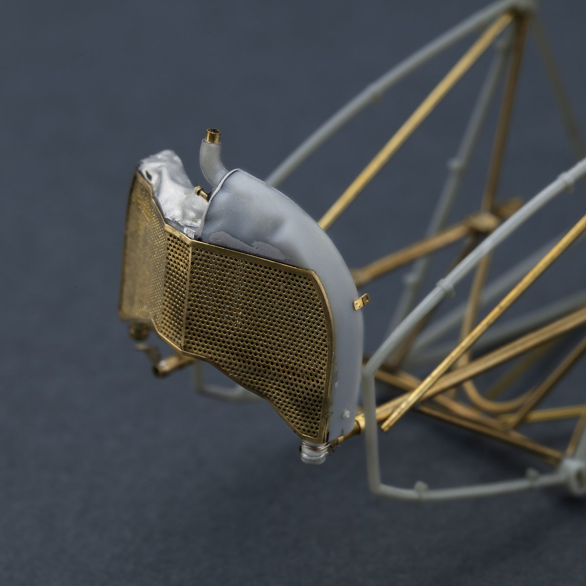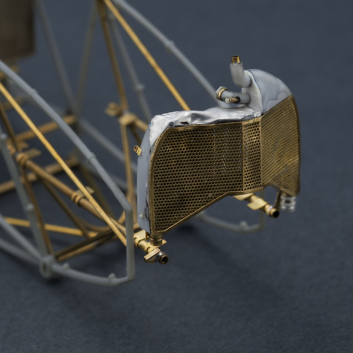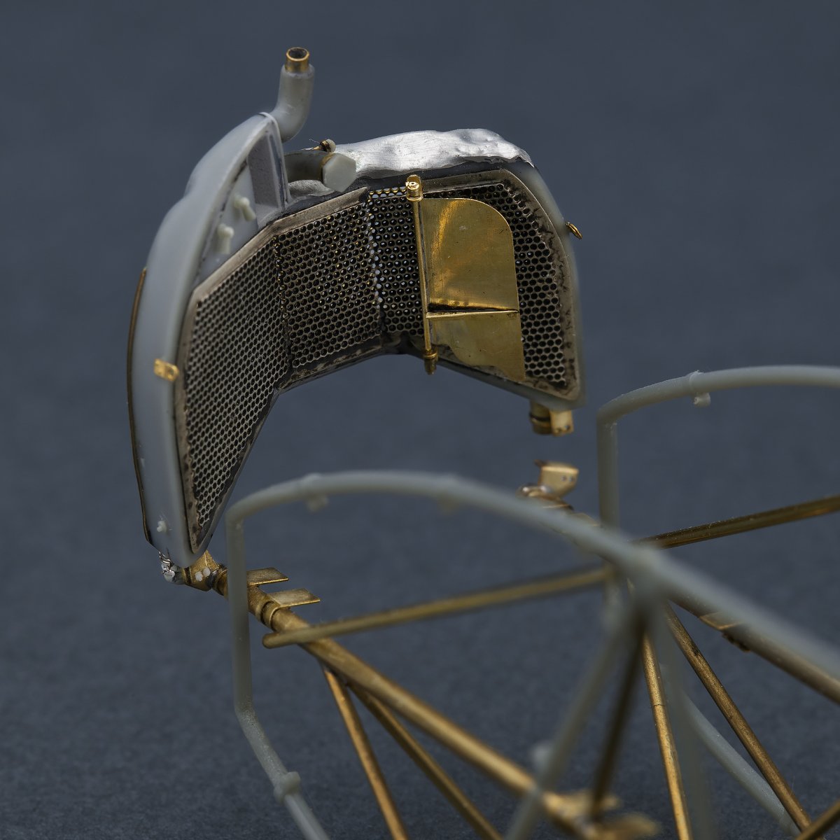 Mały update prac nad Fokkerem. Pojawiło się nieco komplikacji, mianowicie po zaprezentowaniu poprzedniego etapu na anglojęzycznej grupie na FB zwrócono mi uwagę na dość istotny błąd konstrukcyjny, który popełniłem. Nie było rady, przeprowadziłem operację na otwartym sercu Fokkera, ale o tym w następnym poście - mam nadzieję, że już niedługo. Poprzednie zdjęcia konstrukcji muszą zostać zaktualizowane. W międzyczasie natomiast udało mi się wyskrobać kolejny element - chłodnicę. To element dość charakterystyczny dla Fokkera D.VII, a dodatkowo po zestrzeleniu, przymusowym lądowaniu i uszkodzeniu samolotu przez Wusthoffa wymagał malowniczych zabiegów powyginania i uszkodzeń, czyli to, co tygrysy lubią najbardziej. Z części zestawowej została w zasadzie tylko rama - środek praktycznie w całości usunąłem, reszta to zaprojektowane samodzielnie części PE, elementy TaurusModels (śrubki, dźwignie), oraz skracz z rurek Albion Alloys, folii aluminiowej z opakowania po soczewce kontaktowej, kawałków plastiku, drutu oraz masy Tamiya Epoxy Putty Smooth. Z masy Tamiya wykonałem gumową złączkę z rurą, na niej jeden zacisk jest wykonany z blaszki aluminiowej, a drugi wykonałem w formie prowizorycznej polowej naprawy z drutu. W kwestiach merytorycznych jest mała nieścisłość w obszarze mocowania do łoża silnika. Dave Roberts w opisie 382/18 wskazuje, że chłodnica w wyniku uderzenia podczas przymusowego lądowania została nieco uniesiona, co widać po braku spasowania pokryw. Nie wiadomo dokładnie, jaki był zakres uszkodzeń, więc wymyśliłem, że element będzie lekko podniesiony i wyrwany z jednej strony z łoża w wyniku uderzenia. Samo mocowanie w rzeczywistości było bardzo - rzekłbym - filigranowe, a mi zależało mi na maksymalnej wytrzymałości konstrukcji i mocowania tylko w jednym punkcie, dlatego poszedłem na mały kompromis. Być może jeszcze kilka małych drobiazgów będę dopracowywał, ale ogólnie cały element wygląda tak: I po wstępnych przymiarkach do łoża silnika: Wykonałem też sobie kilka zdjęć na białym tle, głównie na potrzeby wykonania późniejszej dokumentacji budowy. Białe tło daje trochę większe i ciekawsze możliwości składu i layoutu graficznego. Przy składaniu dokumentacji do MiGa nieraz żałowałem, że nie robiłem też zdjęć na białym tle, bo ułatwiłoby to kilka rozwiązań graficznych i kompozycyjnych.21 punktów