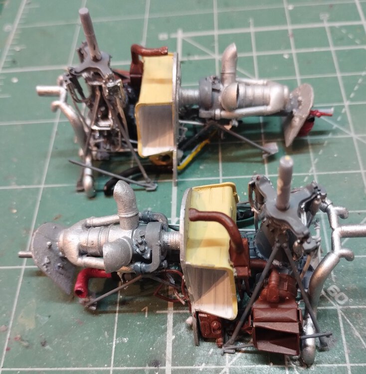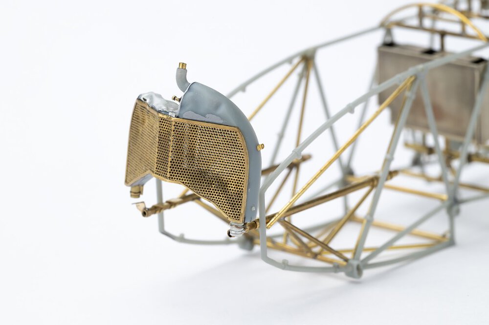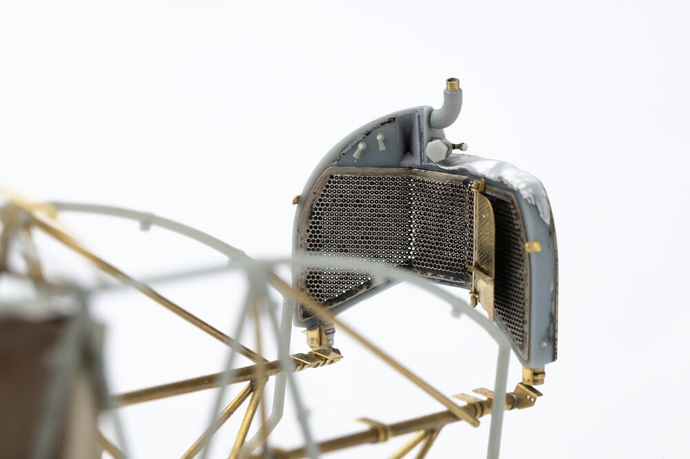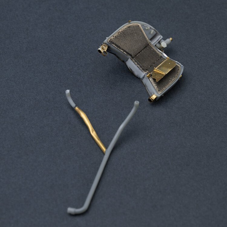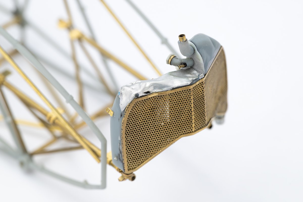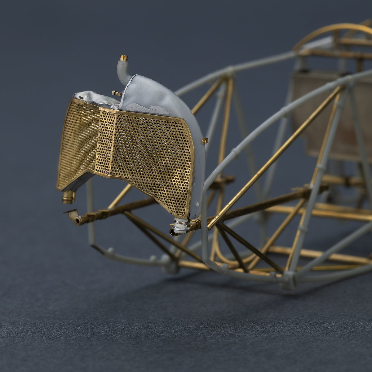 Mały update prac nad Fokkerem. Pojawiło się nieco komplikacji, mianowicie po zaprezentowaniu poprzedniego etapu na anglojęzycznej grupie na FB zwrócono mi uwagę na dość istotny błąd konstrukcyjny, który popełniłem. Nie było rady, przeprowadziłem operację na otwartym sercu Fokkera, ale o tym w następnym poście - mam nadzieję, że już niedługo. Poprzednie zdjęcia konstrukcji muszą zostać zaktualizowane. W międzyczasie natomiast udało mi się wyskrobać kolejny element - chłodnicę. To element dość charakterystyczny dla Fokkera D.VII, a dodatkowo po zestrzeleniu, przymusowym lądowaniu i uszkodzeniu samolotu przez Wusthoffa wymagał malowniczych zabiegów powyginania i uszkodzeń, czyli to, co tygrysy lubią najbardziej. Z części zestawowej została w zasadzie tylko rama - środek praktycznie w całości usunąłem, reszta to zaprojektowane samodzielnie części PE, elementy TaurusModels (śrubki, dźwignie), oraz skracz z rurek Albion Alloys, folii aluminiowej z opakowania po soczewce kontaktowej, kawałków plastiku, drutu oraz masy Tamiya Epoxy Putty Smooth. Z masy Tamiya wykonałem gumową złączkę z rurą, na niej jeden zacisk jest wykonany z blaszki aluminiowej, a drugi wykonałem w formie prowizorycznej polowej naprawy z drutu. W kwestiach merytorycznych jest mała nieścisłość w obszarze mocowania do łoża silnika. Dave Roberts w opisie 382/18 wskazuje, że chłodnica w wyniku uderzenia podczas przymusowego lądowania została nieco uniesiona, co widać po braku spasowania pokryw. Nie wiadomo dokładnie, jaki był zakres uszkodzeń, więc wymyśliłem, że element będzie lekko podniesiony i wyrwany z jednej strony z łoża w wyniku uderzenia. Samo mocowanie w rzeczywistości było bardzo - rzekłbym - filigranowe, a mi zależało mi na maksymalnej wytrzymałości konstrukcji i mocowania tylko w jednym punkcie, dlatego poszedłem na mały kompromis. Być może jeszcze kilka małych drobiazgów będę dopracowywał, ale ogólnie cały element wygląda tak: I po wstępnych przymiarkach do łoża silnika: Wykonałem też sobie kilka zdjęć na białym tle, głównie na potrzeby wykonania późniejszej dokumentacji budowy. Białe tło daje trochę większe i ciekawsze możliwości składu i layoutu graficznego. Przy składaniu dokumentacji do MiGa nieraz żałowałem, że nie robiłem też zdjęć na białym tle, bo ułatwiłoby to kilka rozwiązań graficznych i kompozycyjnych.21 punktów