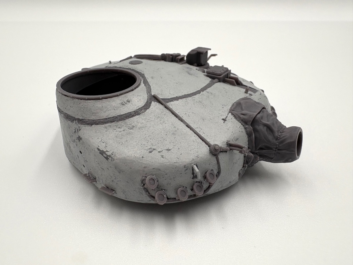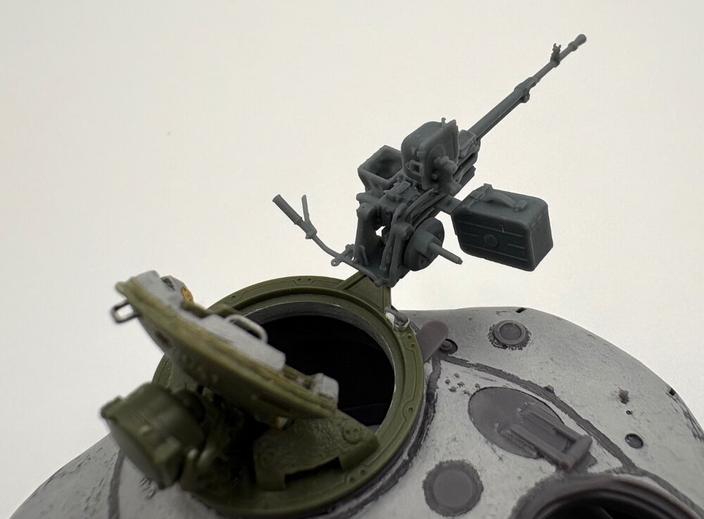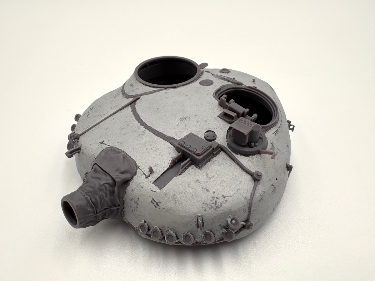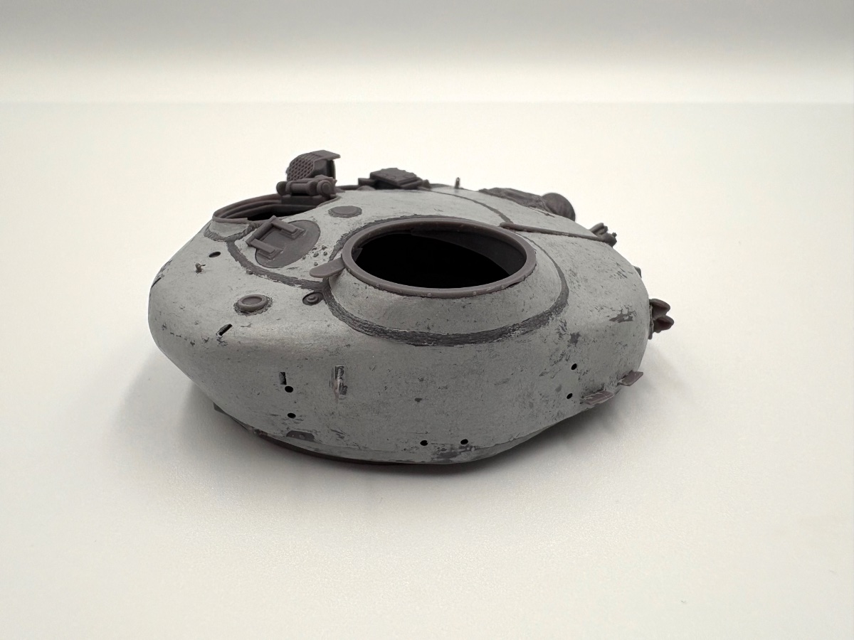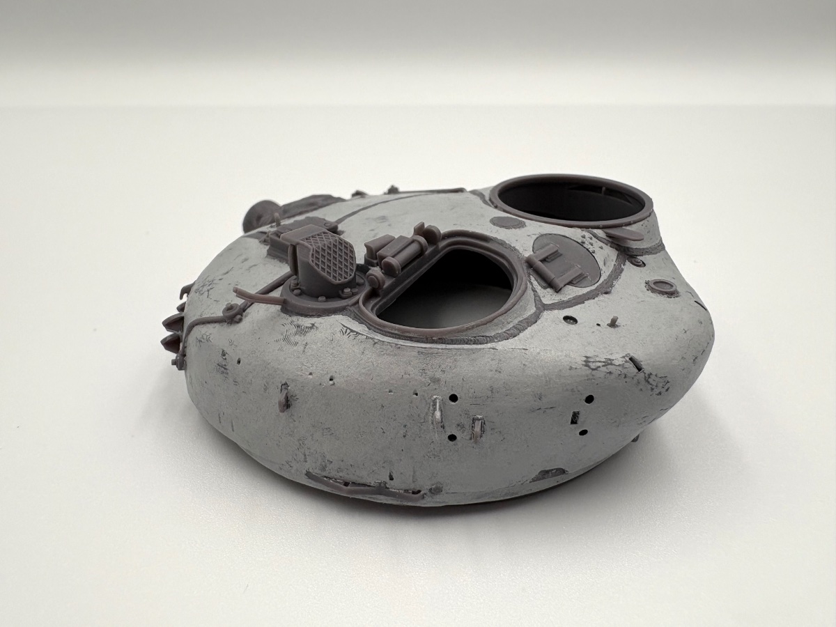 Nadszedł czas wieży… Wieża jest testowym wydrukiem z firmy ACE Project Studio, na który nałożyłem zaś znaną mieszankę kleju i szpachli z pancerza. Więcej o wieży napiszę, w momencie gdy wszystko do niej dopasuje. Tym nie mniej, do włazu dowódcy został dodany 12,7 mm WKM NSWT również z firmy ACE, a na samej obrotnicy dodałem podstawę oraz rygiel. Do samego karabinu pozostało dorobić przewód spustu oraz cięgło hamulca horyzontalnego. Właz działonowego został wzbogacony o imitację przetłoczenia na rancie, pseudofakturę osłony antyradiacyjnej oraz fototrawione spinki pozostałe z zestawu T-72A z trumpetera13 punktów