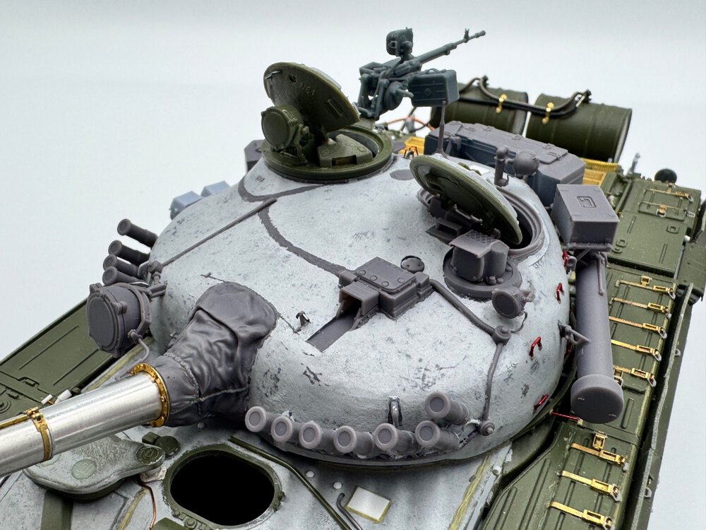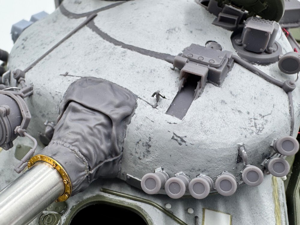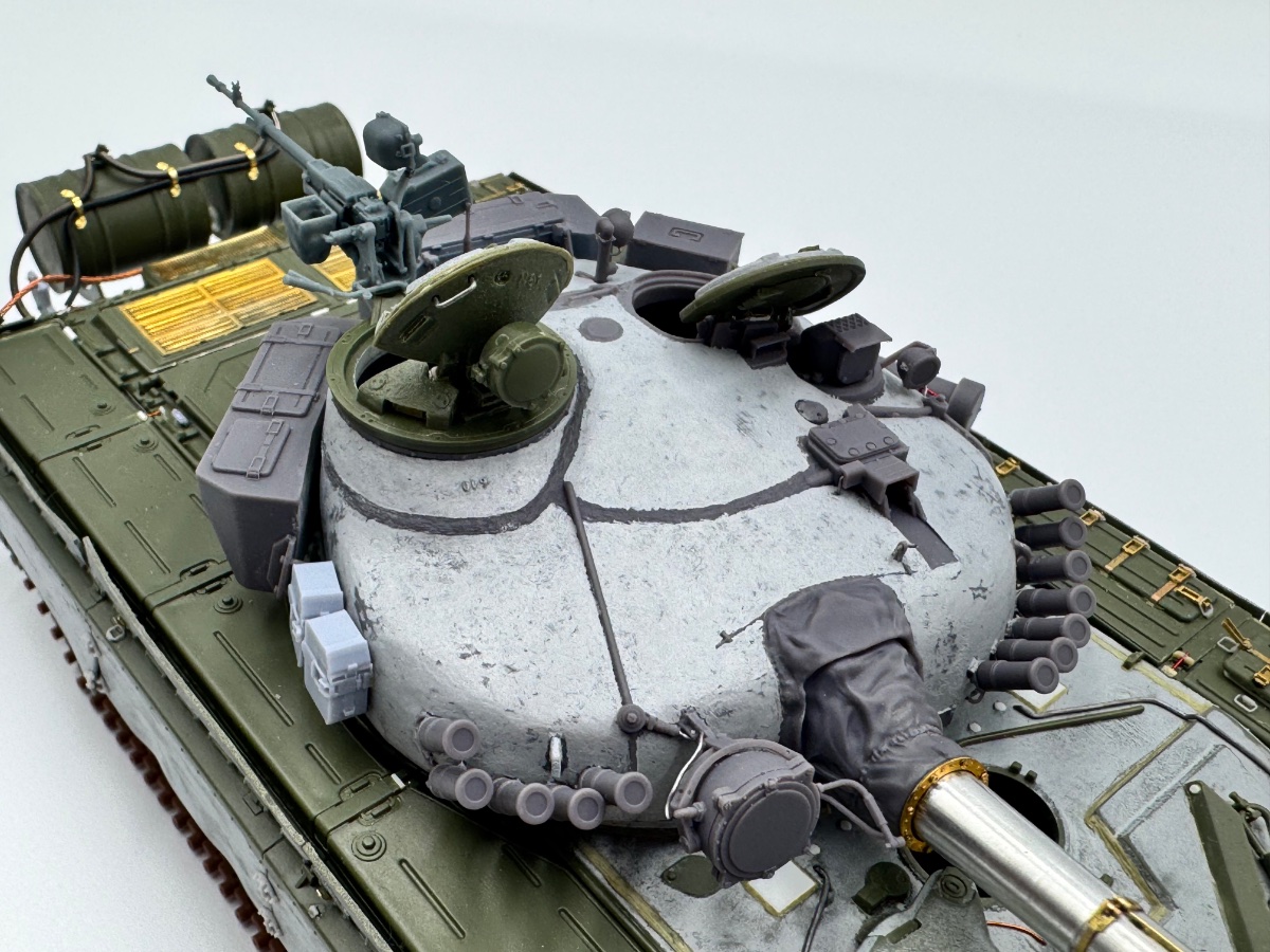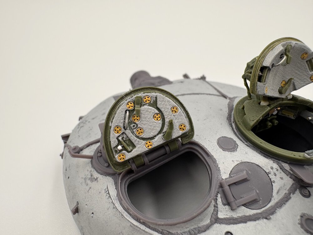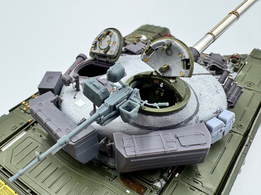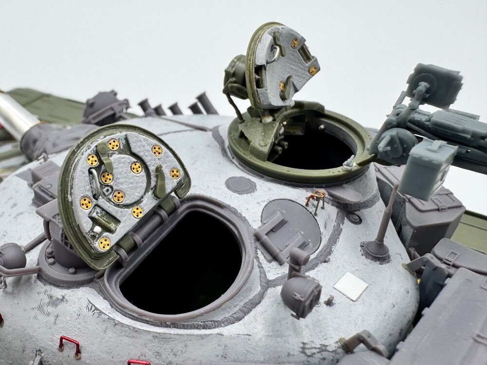 Nadszedł czas wieży… Wieża jest testowym wydrukiem z firmy ACE Project Studio, na który nałożyłem zaś znaną mieszankę kleju i szpachli z pancerza. Więcej o wieży napiszę, w momencie gdy wszystko do niej dopasuje. Tym nie mniej, do włazu dowódcy został dodany 12,7 mm WKM NSWT również z firmy ACE, a na samej obrotnicy dodałem podstawę oraz rygiel. Do samego karabinu pozostało dorobić przewód spustu oraz cięgło hamulca horyzontalnego. Właz działonowego został wzbogacony o imitację przetłoczenia na rancie, pseudofakturę osłony antyradiacyjnej oraz fototrawione spinki pozostałe z zestawu T-72A z trumpetera13 punktów
