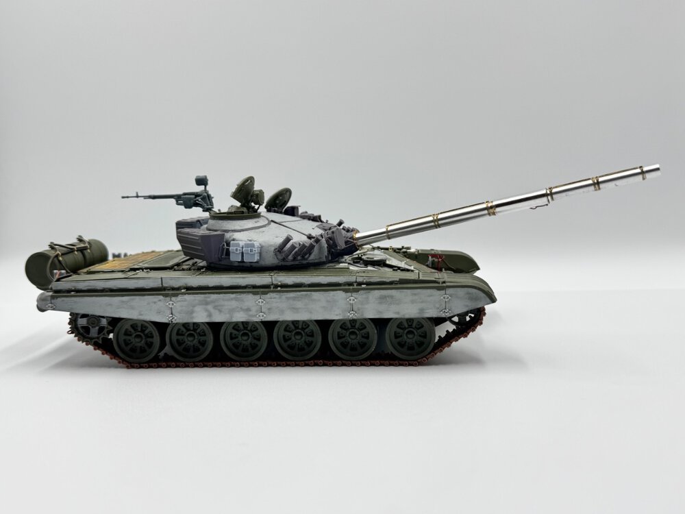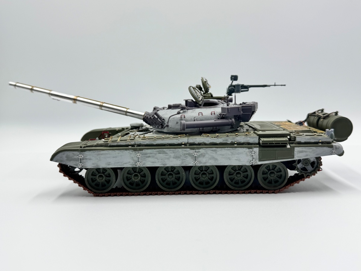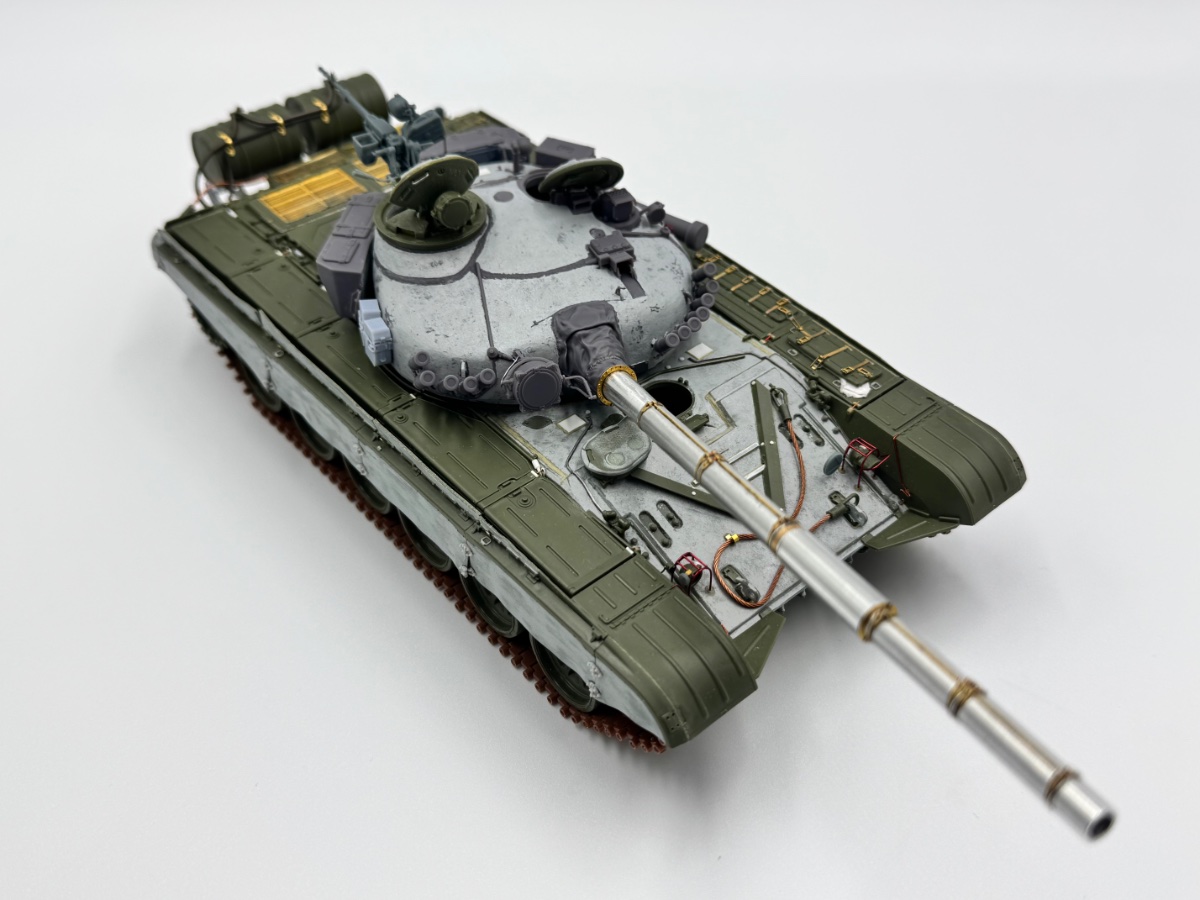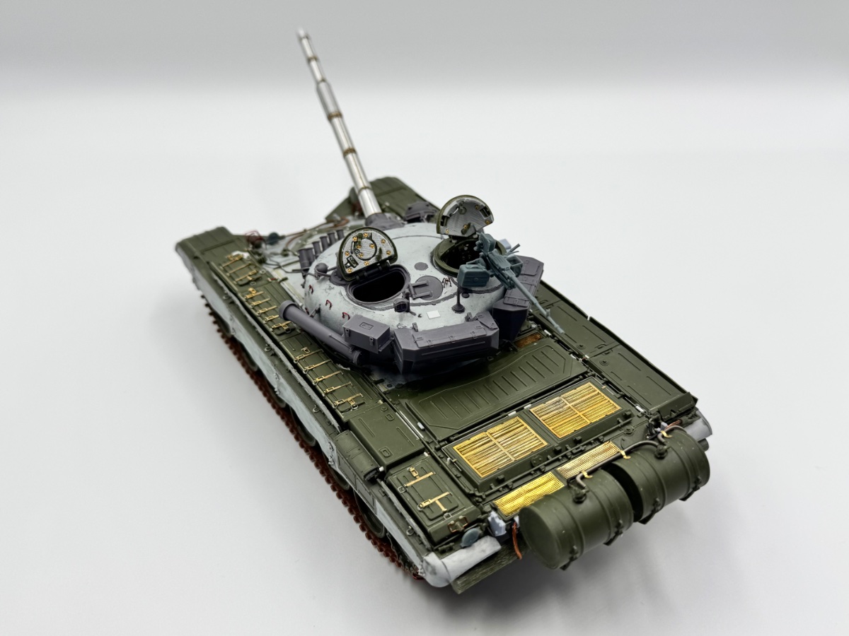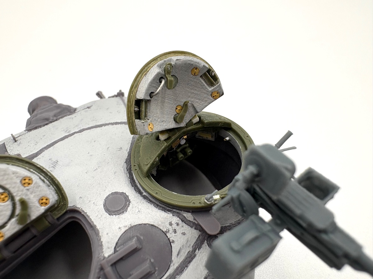 Nadszedł czas wieży… Wieża jest testowym wydrukiem z firmy ACE Project Studio, na który nałożyłem zaś znaną mieszankę kleju i szpachli z pancerza. Więcej o wieży napiszę, w momencie gdy wszystko do niej dopasuje. Tym nie mniej, do włazu dowódcy został dodany 12,7 mm WKM NSWT również z firmy ACE, a na samej obrotnicy dodałem podstawę oraz rygiel. Do samego karabinu pozostało dorobić przewód spustu oraz cięgło hamulca horyzontalnego. Właz działonowego został wzbogacony o imitację przetłoczenia na rancie, pseudofakturę osłony antyradiacyjnej oraz fototrawione spinki pozostałe z zestawu T-72A z trumpetera13 punktów