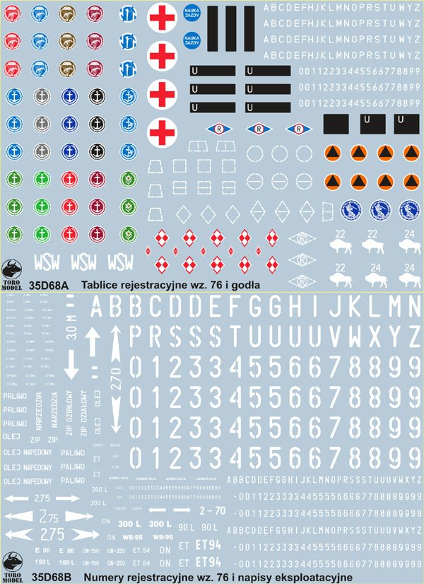 Marcin, w zasadzie wszystko co potrzebujesz do współczesnych T-72 jest w trzech zestawach ToRo w tablicami rejestracyjnymi: 35D11 http://www.toro-model.com.pl/pliki/35d11e.htm 35D12 http://www.toro-model.com.pl/pliki/35d12e.htm 35D13 http://www.toro-model.com.pl/pliki/35d13e.htm A "historyczne" opędzisz tak jak Robert napisał, zestawem 35D68. Nie bardzo widzę sensu wydawania, w chwili obecnej, osobnego zestawu... (no ale może ktoś mnie przekona...) Zapraszam zatem do współpracy Startujemy od minimalnego nakładu 250 arkuszy i kwoty rzędu 4-5tys. zł plus VAT na pokrycie kosztów druku (o kosztach związanych z projektowaniem czy zdobyciem dokumentacji nie wspominając...) Wchodzisz w temat jako sponsor/udziałowiec ?1 punkt
