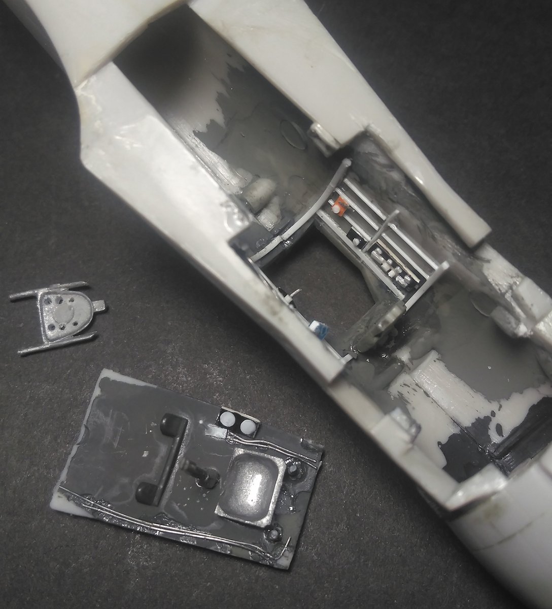 Kadłub można uznać za zakończony. Doszły fartuchy, które co nie co zmodyfikowałem dodając zaczepy blokujące fartuchy w pozycji podniesionej, oraz spinki poszczególnych segmentów fartuchów. Same zaś gumy potraktowałem roztworem kleju mr. Cement S z szpachlą Tamiya Basic. Górne gumowe segmenty, a konkretnie ich gumowe powierzchnie, zostały potraktowane czeską piłką, co w zamiarze miało nadać im strzępiącą się powierzchnie. Na pokrywach silnika dorobiłem brakujące elementy systemu podnoszenia klap do pokonywania przeszkód wodnych. Zamontowałem na sucho instalację paliwową do beczek i w sumie dobrze bo wymagały paru korekt, ale teraz już jest git. No i na sam koniec najważniejsze, rejestracja14 punktów