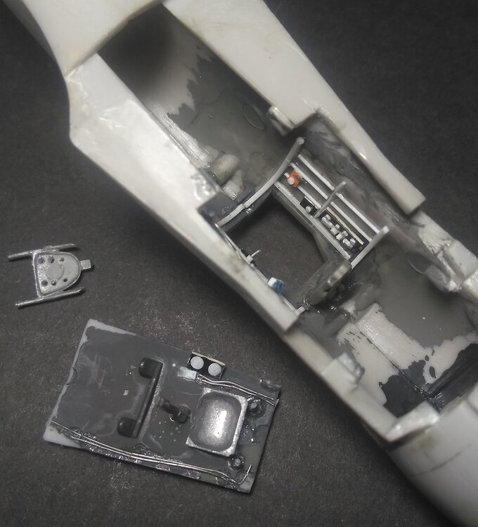 Mały update prac nad Fokkerem. Pojawiło się nieco komplikacji, mianowicie po zaprezentowaniu poprzedniego etapu na anglojęzycznej grupie na FB zwrócono mi uwagę na dość istotny błąd konstrukcyjny, który popełniłem. Nie było rady, przeprowadziłem operację na otwartym sercu Fokkera, ale o tym w następnym poście - mam nadzieję, że już niedługo. Poprzednie zdjęcia konstrukcji muszą zostać zaktualizowane. W międzyczasie natomiast udało mi się wyskrobać kolejny element - chłodnicę. To element dość charakterystyczny dla Fokkera D.VII, a dodatkowo po zestrzeleniu, przymusowym lądowaniu i uszkodzeniu samolotu przez Wusthoffa wymagał malowniczych zabiegów powyginania i uszkodzeń, czyli to, co tygrysy lubią najbardziej. Z części zestawowej została w zasadzie tylko rama - środek praktycznie w całości usunąłem, reszta to zaprojektowane samodzielnie części PE, elementy TaurusModels (śrubki, dźwignie), oraz skracz z rurek Albion Alloys, folii aluminiowej z opakowania po soczewce kontaktowej, kawałków plastiku, drutu oraz masy Tamiya Epoxy Putty Smooth. Z masy Tamiya wykonałem gumową złączkę z rurą, na niej jeden zacisk jest wykonany z blaszki aluminiowej, a drugi wykonałem w formie prowizorycznej polowej naprawy z drutu. W kwestiach merytorycznych jest mała nieścisłość w obszarze mocowania do łoża silnika. Dave Roberts w opisie 382/18 wskazuje, że chłodnica w wyniku uderzenia podczas przymusowego lądowania została nieco uniesiona, co widać po braku spasowania pokryw. Nie wiadomo dokładnie, jaki był zakres uszkodzeń, więc wymyśliłem, że element będzie lekko podniesiony i wyrwany z jednej strony z łoża w wyniku uderzenia. Samo mocowanie w rzeczywistości było bardzo - rzekłbym - filigranowe, a mi zależało mi na maksymalnej wytrzymałości konstrukcji i mocowania tylko w jednym punkcie, dlatego poszedłem na mały kompromis. Być może jeszcze kilka małych drobiazgów będę dopracowywał, ale ogólnie cały element wygląda tak: I po wstępnych przymiarkach do łoża silnika: Wykonałem też sobie kilka zdjęć na białym tle, głównie na potrzeby wykonania późniejszej dokumentacji budowy. Białe tło daje trochę większe i ciekawsze możliwości składu i layoutu graficznego. Przy składaniu dokumentacji do MiGa nieraz żałowałem, że nie robiłem też zdjęć na białym tle, bo ułatwiłoby to kilka rozwiązań graficznych i kompozycyjnych.21 punktów