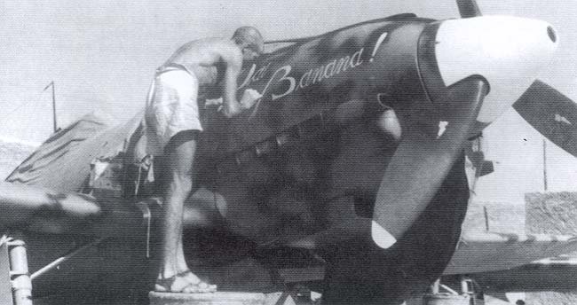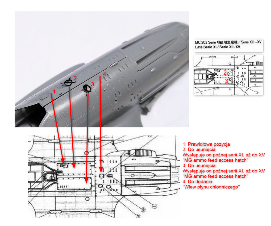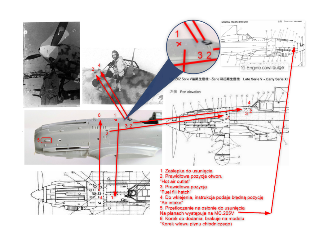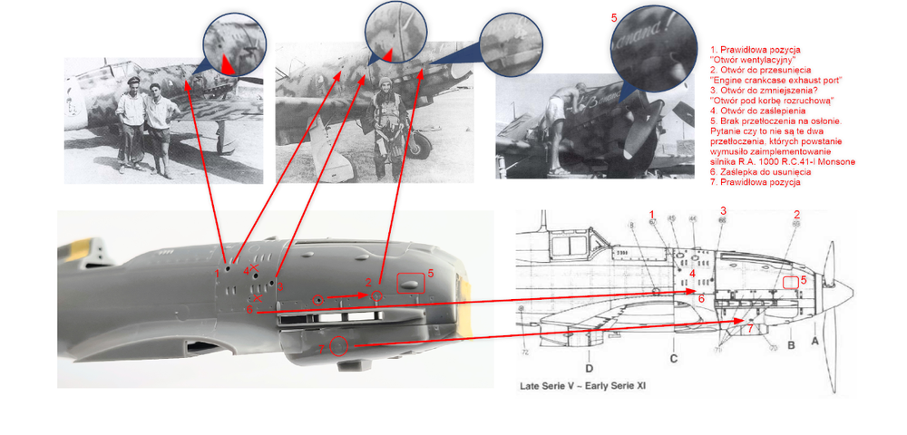 Cześć, Chyba mogę uznać etap przeglądania planów i wpatrywania się w zdjęcia za zakończony. "Leniwych", @jachud3, @barszczo, @mig zapraszam do komentowania, jeśli coś przegapiłem to dawać teraz lub po położeniu podkładu zamilknąć na wieki Największe wątpliwości mam odnośnie usunięcia przetłoczeń "bąbli" na przodzie osłony silnika (ozn. numerem 5). Przychylam się do wersji, że ten konkretny egzemplarz tych przetłoczeń nie miał. W innym wypadku to przetłoczenie musiałoby wypadać na napisie "Banana". Dostępne zdjęcia natomiast nie pokazują deformacji liter w tym miejscu. Jeśli dobrze to rozumiem, to są dwa przetłoczenia, które doszły na skutek wprowadzenia silnika rodzimej produkcji R.A. 1000 R.C.41-I, ergo że ten samolot był wyposażony w DB601? Najlepsze zdjęcie tego fragmentu, jakie udało mi się znaleźć. I na koniec dla chętnych dalsze losy naszego bohatera: Po wybuchu II wojny światowej 155 eskadra zostaje przeniesiona na Sardynię, na lotnisko Monseratto. Enio zostaje skierowany na wykonywanie misji rozpoznania morskiego. Wilgoć i zimno w otwartej kabienie CR.32, źle odbijają się na jego zdrowiu. Po leczeniu i powrocie do oddziału zostaje przydzielony pod dowództwo kapitana Giuseppe Cenniego, do 239-go dywizjonu, 97-ej grupy bombowców nurkujących, zasiada za sterami Junkersa Ju87. W czasie tego 8- misięcznego epizodu, 29 czerwca 1941 zalicza trafienie bombą niszczyciela HMAS Waterhen (Royal Australian Navy), statek doznaje ciężkich uszkodzeń i nie jest w stanie samodzielnie kontynuować rejsu. Następnego dnia jego odział znajduje holowaną jednostkę i ponawia atak, na tyle skutecznie, że niszczyciel tonie. Niestety sam Tarantola zostaje zestrzelony w tym dniu, a po wyskoczeniu z samolotu spędza 18 godzin w morzu zanim zostaje podjęty przez łodź latającą CANT Z.501 Gabbiano. Zdjęcie pamiątkowe z załogą CANT Z.501 Po powrocie do jednostki składa prośbę o przeniesienie do jednostki myśliwskiej, i taką też zgodę uzyskuje. 4 listopada 1941 roku trafia do 151 dywizjonu, 20 grupy pod dowództwem kapitana Furio Niclota Doglio, stacjonującej na lotnisku Martuba w Libii, a następnie w Sidi Rezegh w okolicach Tobruku. 19 listopada 1941 lotnisko zostaje zaatakowane przez nalot bombowców Bristol Blenheim, 18 stacjonujących na lotnisku Fiatów G.50 zostaje zniszczonych. Tarantoli udaje się wystartować swoim samolotem pod nalotem bombowym i wrócić do Martuby. Na tym samym samolocie 5 grudnia 1941 odnosi swoje 2 zwycięstwo, mierząc się z Curtissem P-40. Pod koniec grudnia 1941 jego grupa zostaje przeniesiona na teren Włoch do Raggio Calabria, gdzie zostaje przebrojona w Macchi C.202 Folgore, a 151 eskadra zostaje przenisiona do 51 Skrzydła. Od 1942 zaczyna latać na swoim "Falgore" częto jako skrzydłowy kapitana Furio Niclota Doglio. Od czerwca 1942 jego grupa zostaje przeniesiona na Sycylię na lotnisko Ponte Olivo, skąd mają przeprowadzać ataki na Maltę.... Na następny wpis postaram się wrzucić zdjęcia z postępu pracy.2 punkty