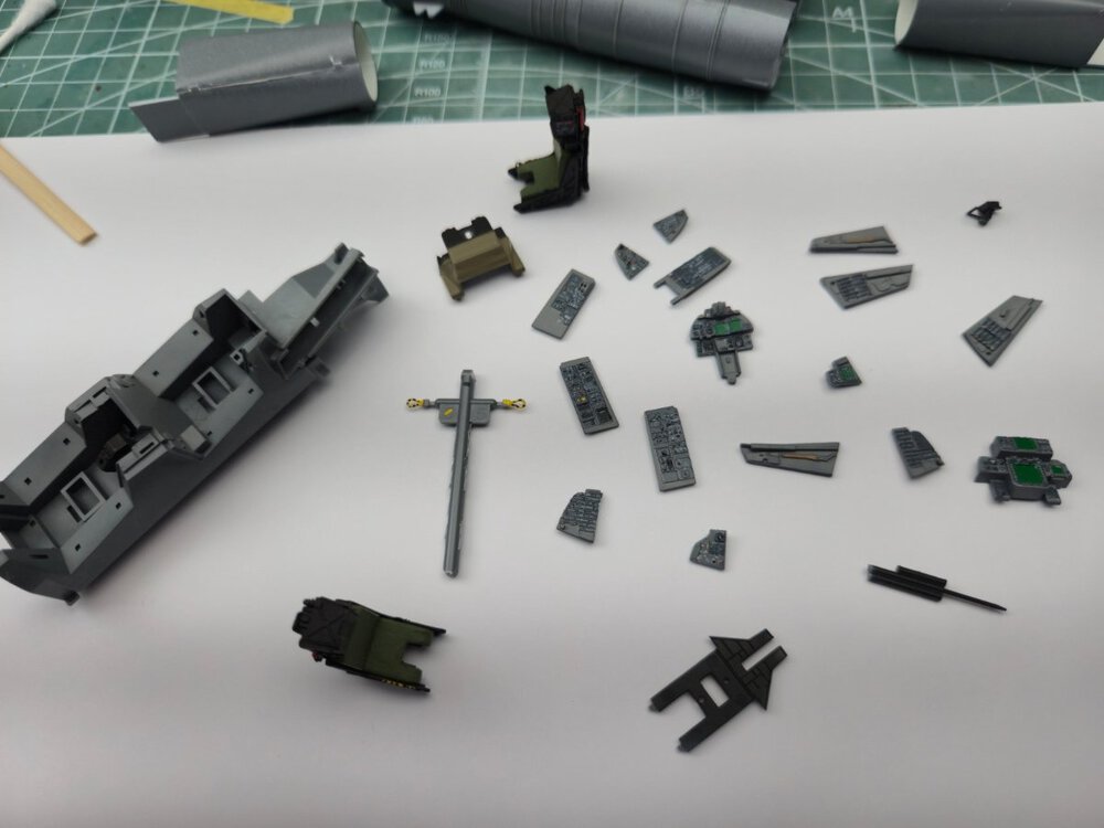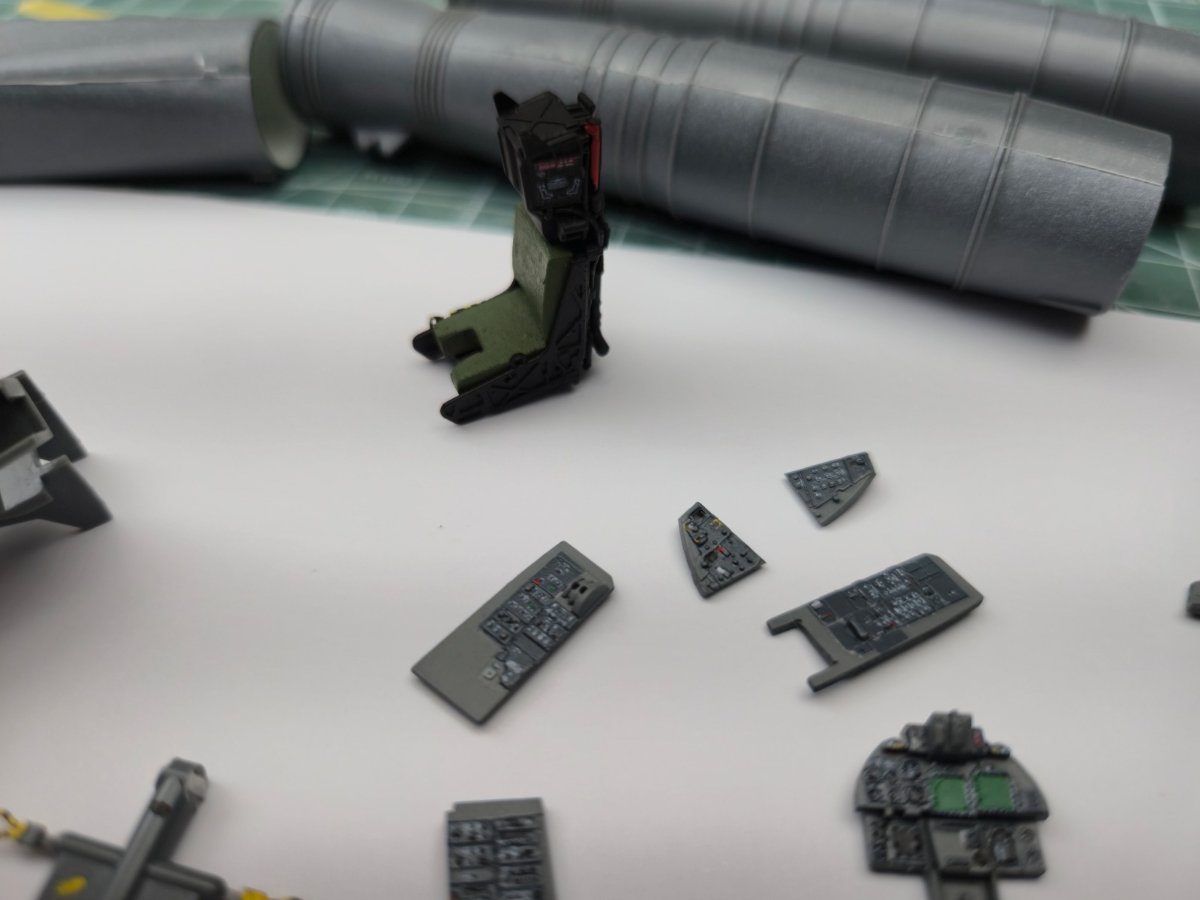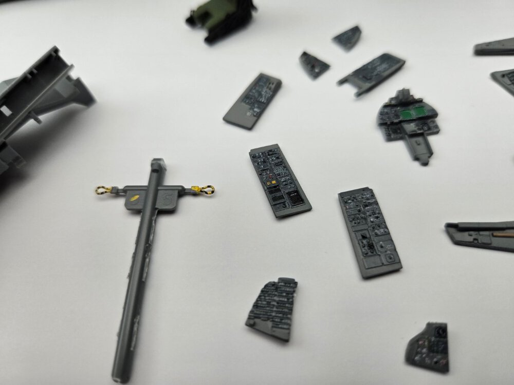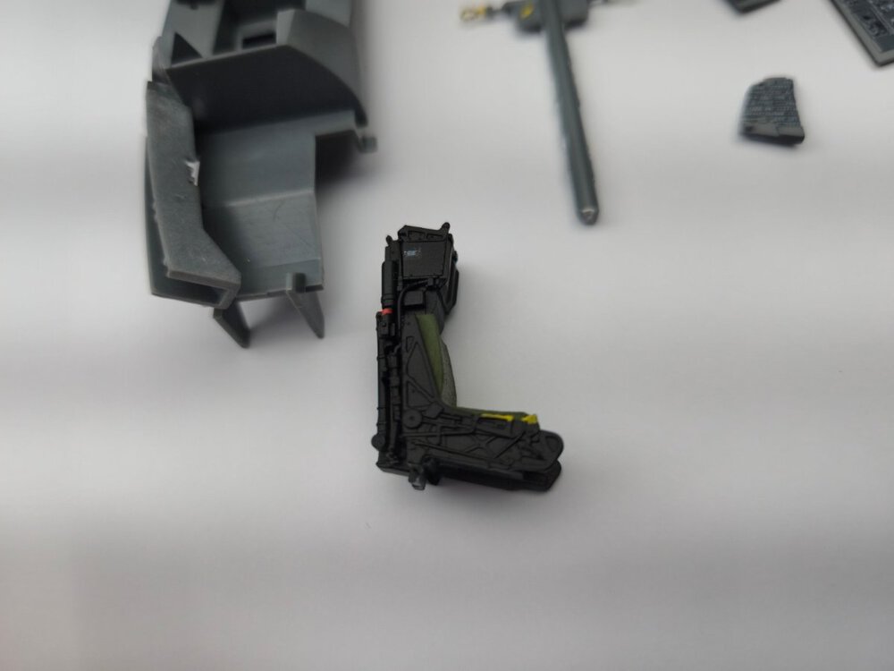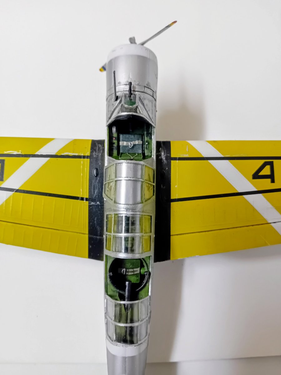 W końcu zamknąłem kadłub. Nie mogłem sobie odmówić aby złożyć na sucho go ze skrzydłami, wiatrochronem no i oczywiście eduardowskim łożem silnika dedykowanym do ichniego konika w wersji D. Jak widać da radę to spasować. Wnętrze kadłuba skrywa armowe części z plastiku, ichniejsze wydruki 3D oraz tablicę przyrządów od Yahu. Od siebie dodałem jedynie kilka drucików ołowianych imitujących instalację elektryczną.7 punktów