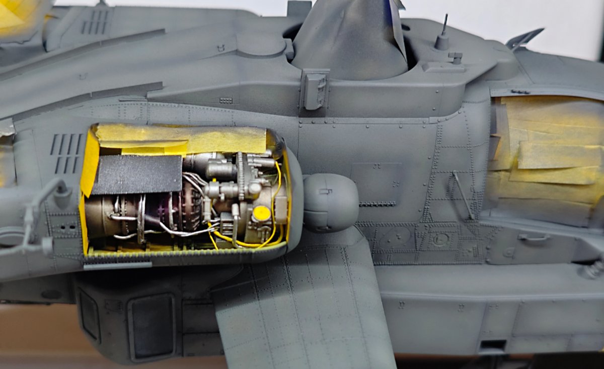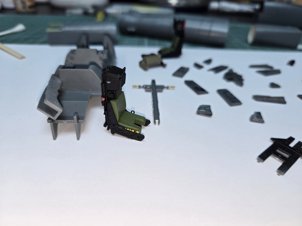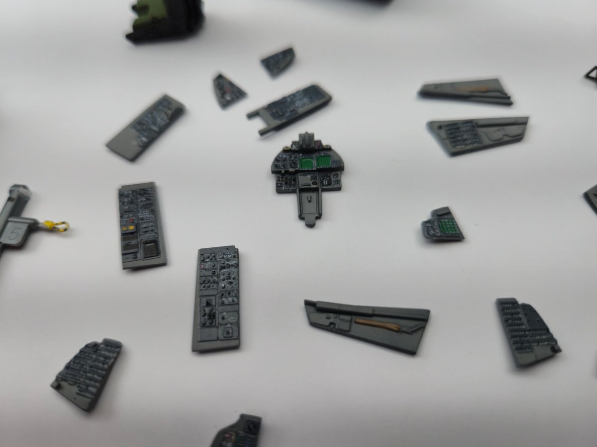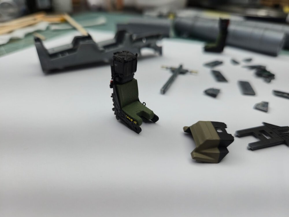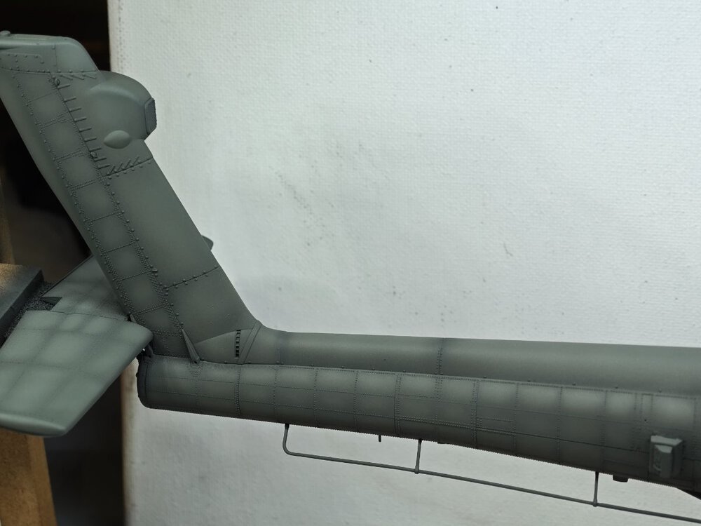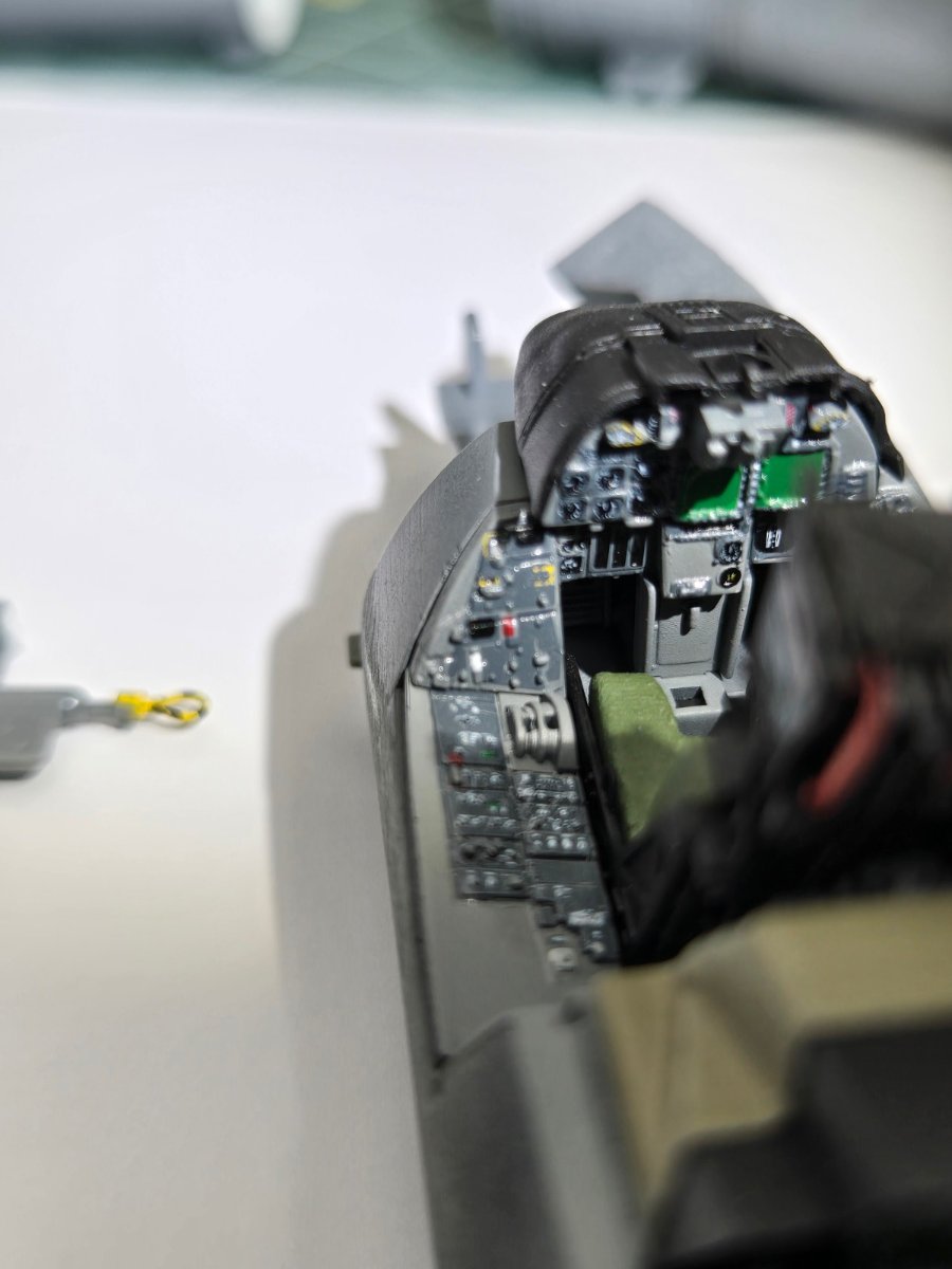 W końcu zamknąłem kadłub. Nie mogłem sobie odmówić aby złożyć na sucho go ze skrzydłami, wiatrochronem no i oczywiście eduardowskim łożem silnika dedykowanym do ichniego konika w wersji D. Jak widać da radę to spasować. Wnętrze kadłuba skrywa armowe części z plastiku, ichniejsze wydruki 3D oraz tablicę przyrządów od Yahu. Od siebie dodałem jedynie kilka drucików ołowianych imitujących instalację elektryczną.7 punktów