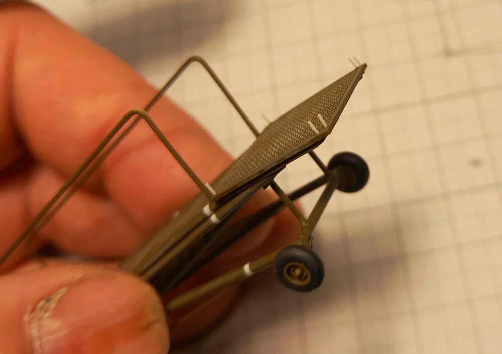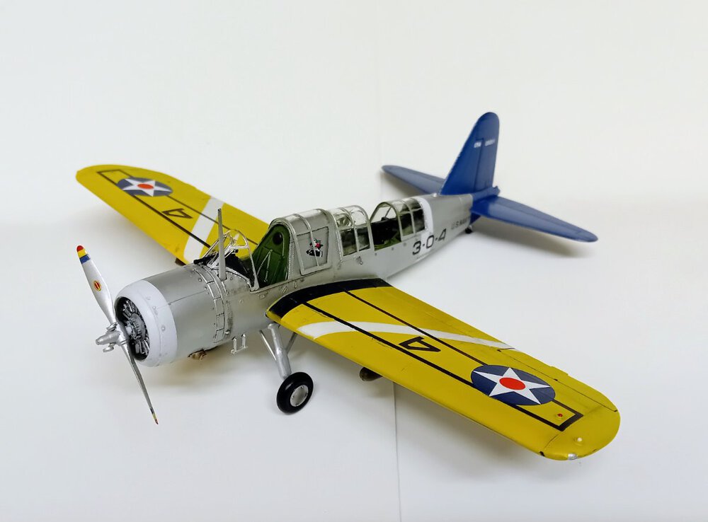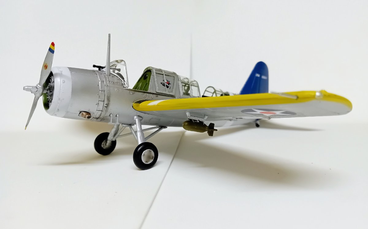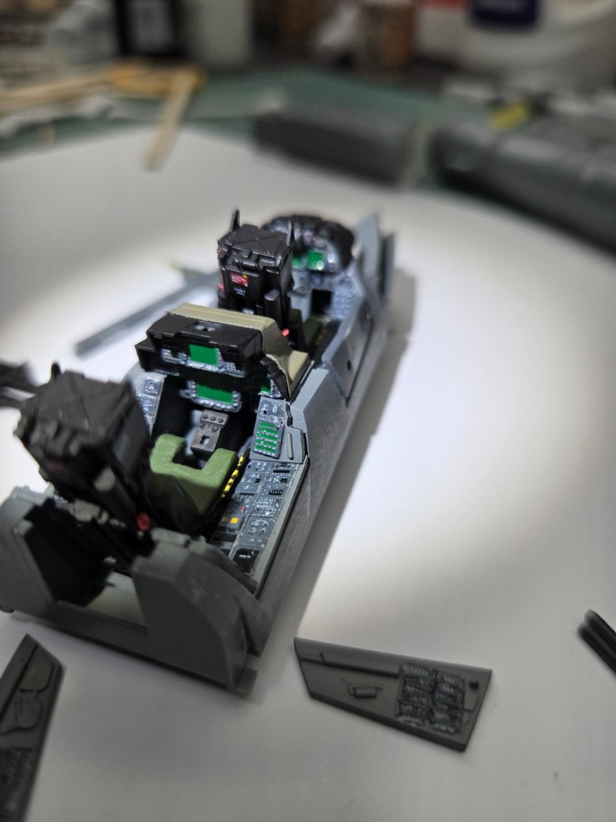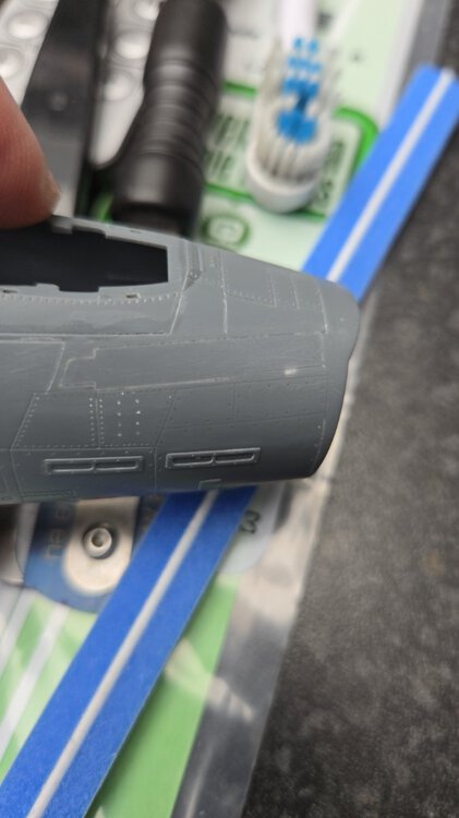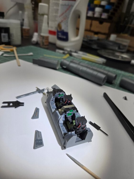 W końcu zamknąłem kadłub. Nie mogłem sobie odmówić aby złożyć na sucho go ze skrzydłami, wiatrochronem no i oczywiście eduardowskim łożem silnika dedykowanym do ichniego konika w wersji D. Jak widać da radę to spasować. Wnętrze kadłuba skrywa armowe części z plastiku, ichniejsze wydruki 3D oraz tablicę przyrządów od Yahu. Od siebie dodałem jedynie kilka drucików ołowianych imitujących instalację elektryczną.7 punktów