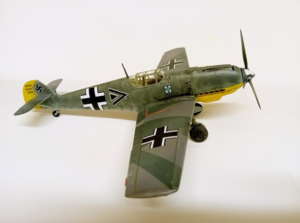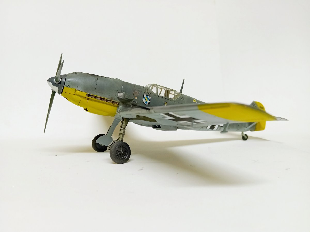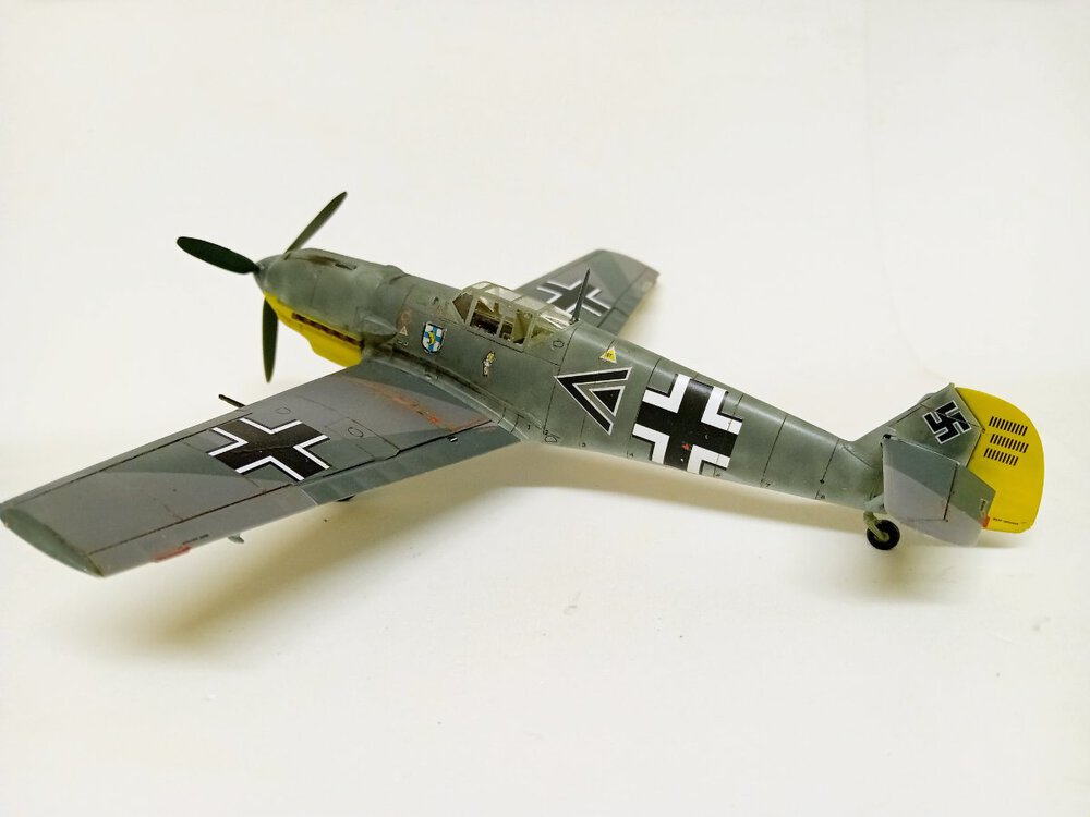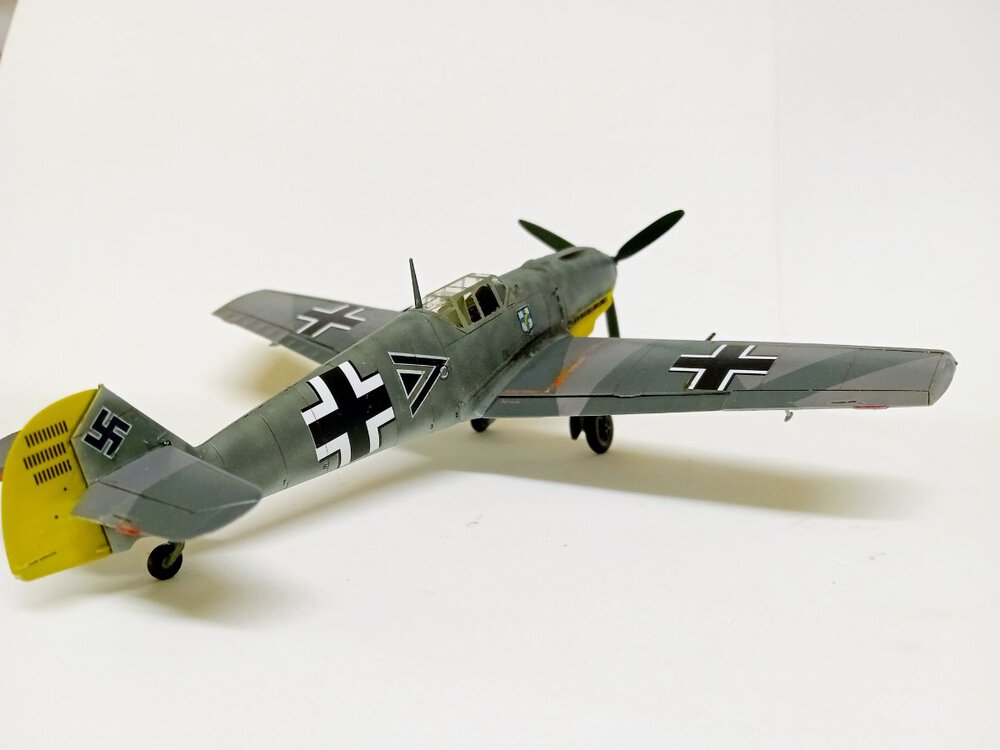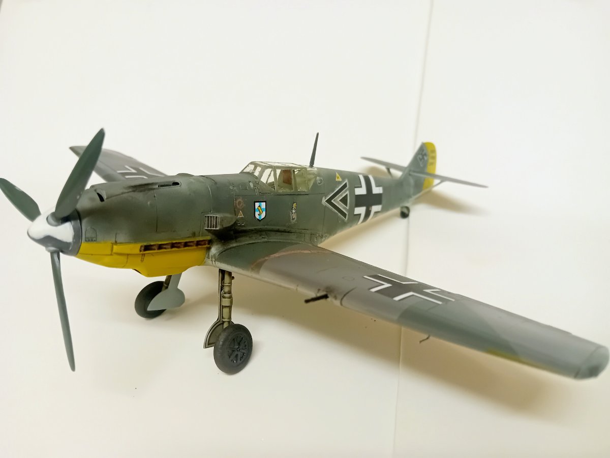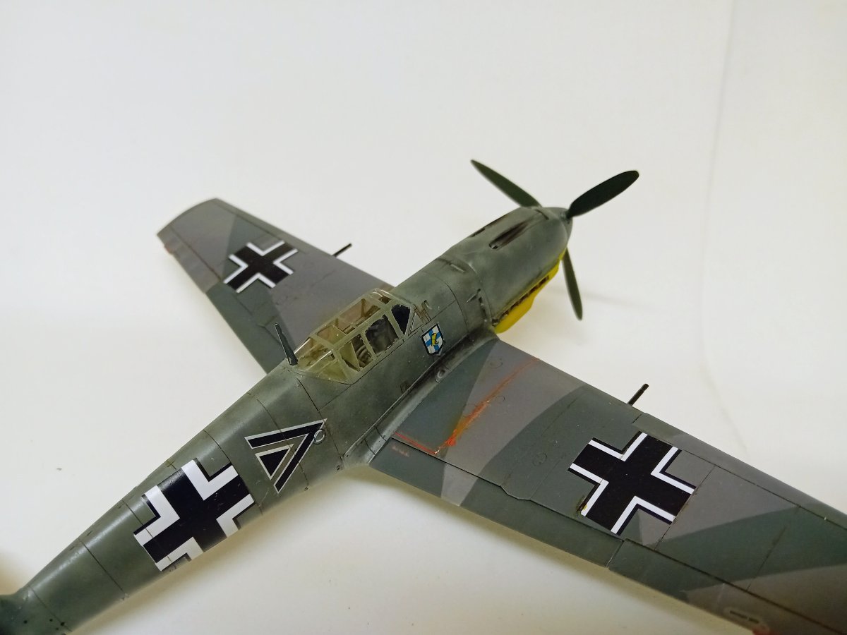 Hasegawa, która niemal przez całą budowę robiła na mnie dobre wrażenie. Humor zważył mi się, gdy wziąłem do ręki kalkomanie, część popękana, reszta wyglądała jak ''idź stąd i nie wracaj ''. Co mogłem - wymieniłem, co nie mogłem wymienić - ratowałem. Nałożyć dało się ostatecznie wszystko. Jednak po dwóch dniach linie na skrzydłach zaczęły się srebrzyć jak włosy Wiedźmina, a godła jednostki postrzepiły się na krawędziach. Na szczęście te ostatnie udało się jeszcze zdobyć i wymienić. Lepiej z nimi już nie będzie, lekcja przed kolejnym takim modelem. Użycie oryginalnych kalkomanii w kiepskim stanie to ostateczność, nawet jeśli wszytkie te płyny, lakiery pomogą, to gwarancji sukcesu nie ma. Zaskakująco (w końcu to Hasegawa)dużo problemów nastręczył montaż podwozia, po części dlatego, że ustalenie prawidłowego kąta zaklinowania podwozia w tym samolocie jest dość trudne, jednocześnie jeszcze trzeba się starać utrzymać symetrię. Ciepło wspominam pod tym względem model Eduarda, tam to rozwiązano doskonale. Ale teraz miałem w ręku trzydziestoletnią Hasegawę, do tego z wrażeniem , że golenie są za długie. Jakoś w końcu to ustawiłem. Malowanie zrobiłem farbami RLM74/75/76 Mr Hobby (Aquos).9 punktów