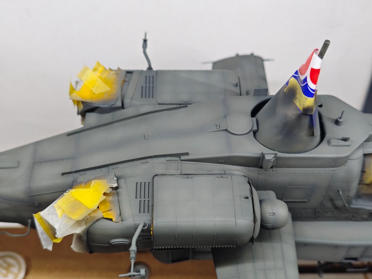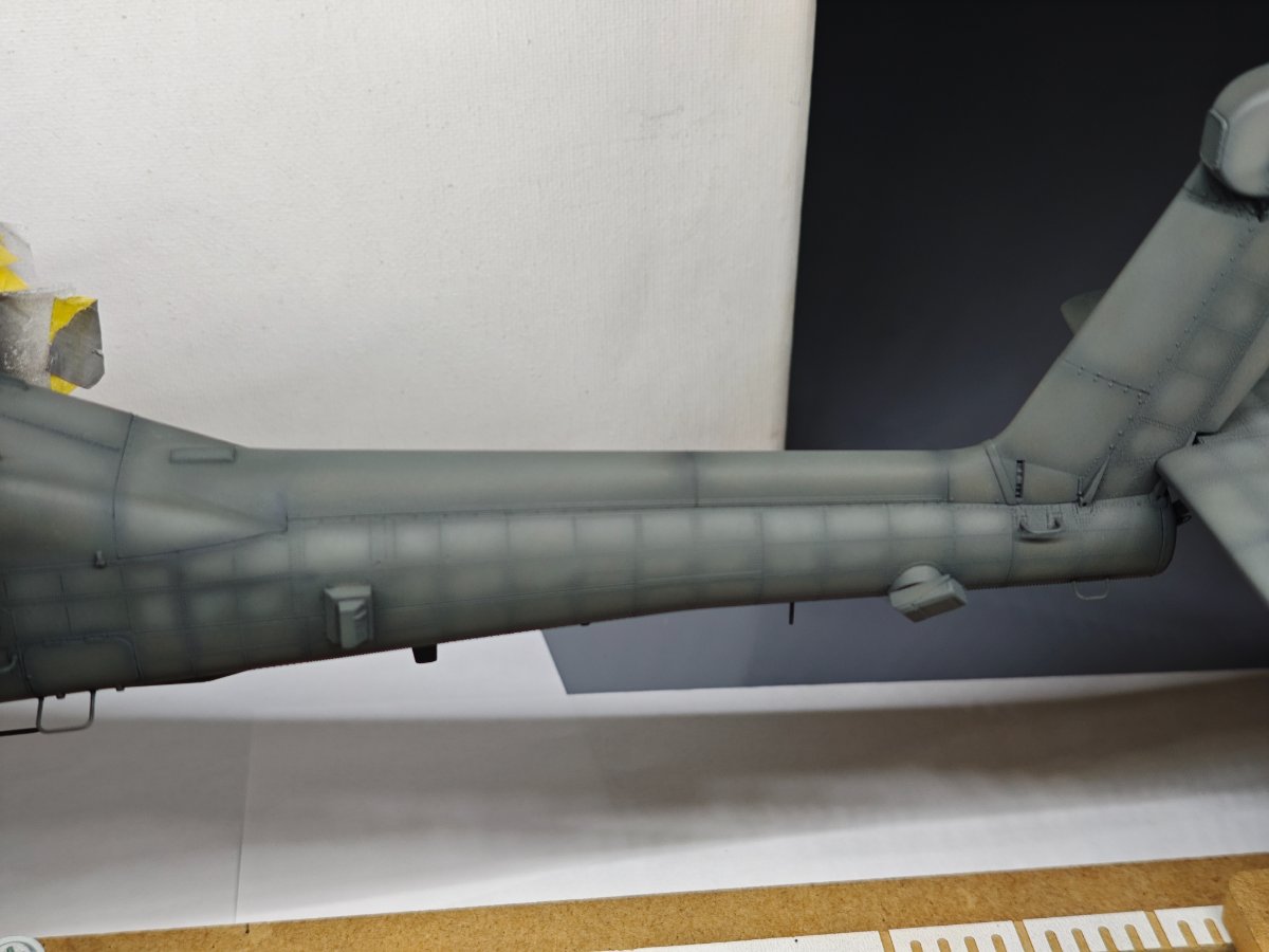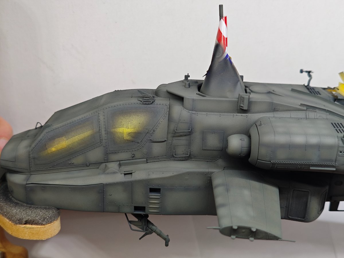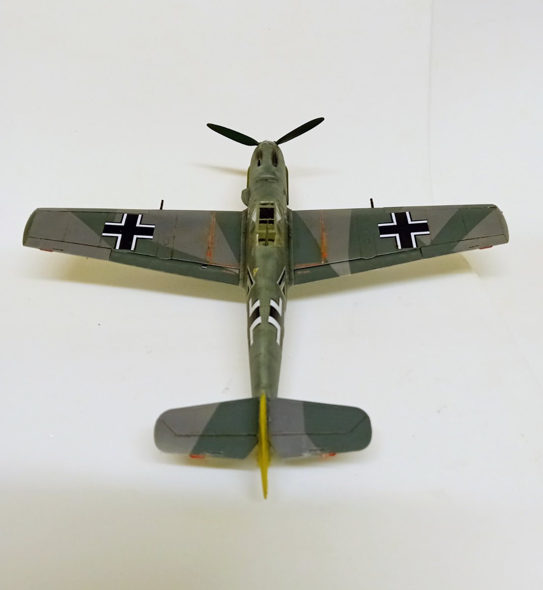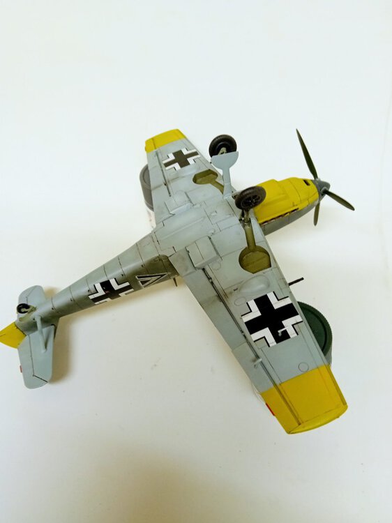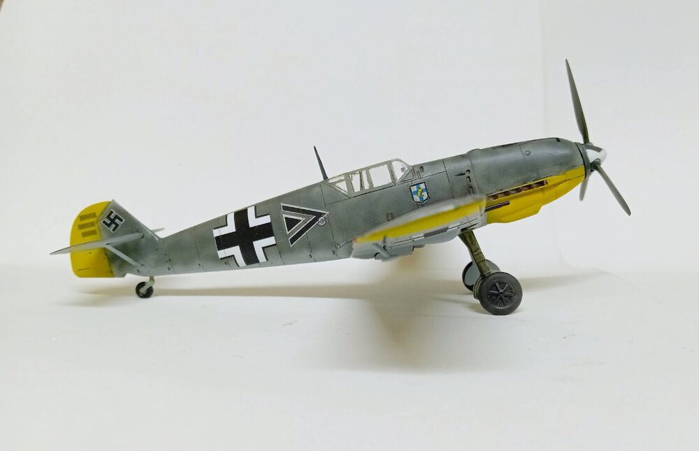 Hasegawa, która niemal przez całą budowę robiła na mnie dobre wrażenie. Humor zważył mi się, gdy wziąłem do ręki kalkomanie, część popękana, reszta wyglądała jak ''idź stąd i nie wracaj ''. Co mogłem - wymieniłem, co nie mogłem wymienić - ratowałem. Nałożyć dało się ostatecznie wszystko. Jednak po dwóch dniach linie na skrzydłach zaczęły się srebrzyć jak włosy Wiedźmina, a godła jednostki postrzepiły się na krawędziach. Na szczęście te ostatnie udało się jeszcze zdobyć i wymienić. Lepiej z nimi już nie będzie, lekcja przed kolejnym takim modelem. Użycie oryginalnych kalkomanii w kiepskim stanie to ostateczność, nawet jeśli wszytkie te płyny, lakiery pomogą, to gwarancji sukcesu nie ma. Zaskakująco (w końcu to Hasegawa)dużo problemów nastręczył montaż podwozia, po części dlatego, że ustalenie prawidłowego kąta zaklinowania podwozia w tym samolocie jest dość trudne, jednocześnie jeszcze trzeba się starać utrzymać symetrię. Ciepło wspominam pod tym względem model Eduarda, tam to rozwiązano doskonale. Ale teraz miałem w ręku trzydziestoletnią Hasegawę, do tego z wrażeniem , że golenie są za długie. Jakoś w końcu to ustawiłem. Malowanie zrobiłem farbami RLM74/75/76 Mr Hobby (Aquos).9 punktów