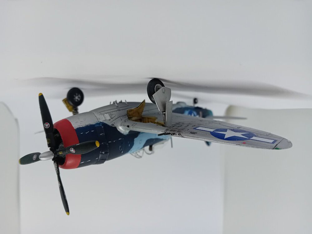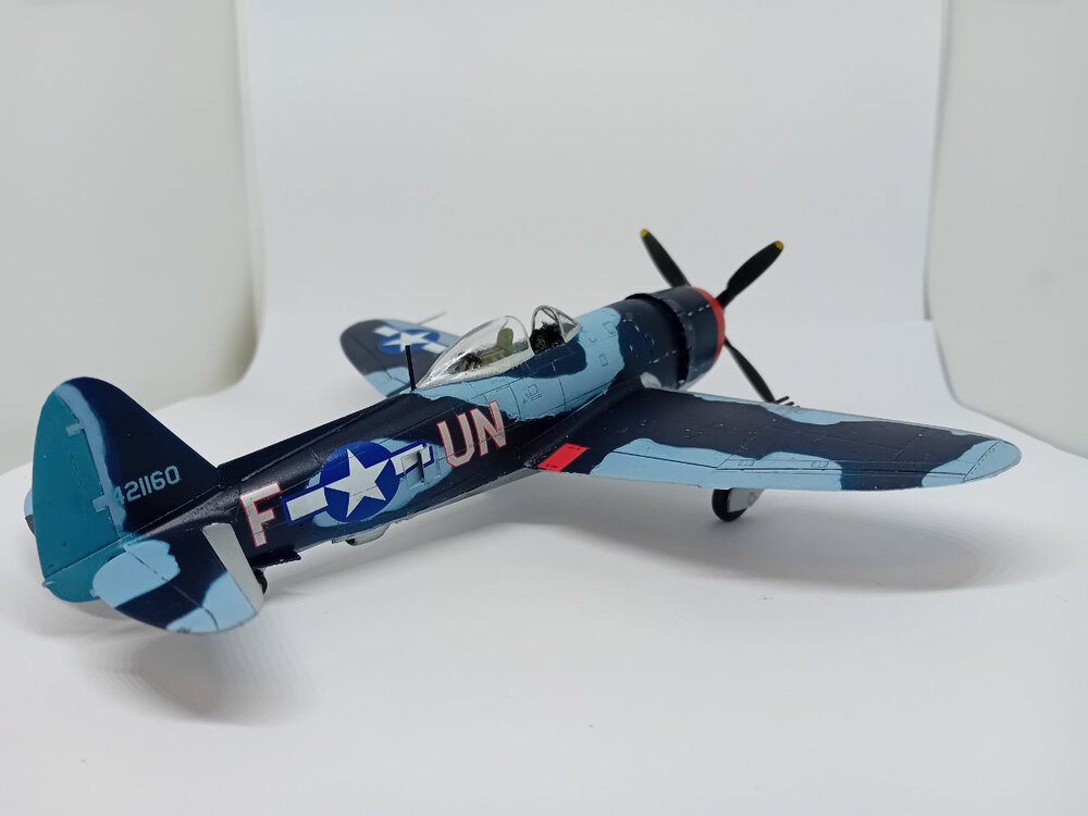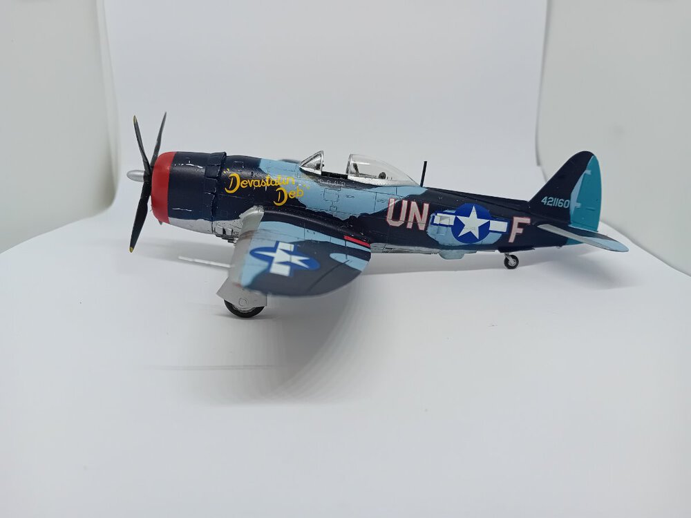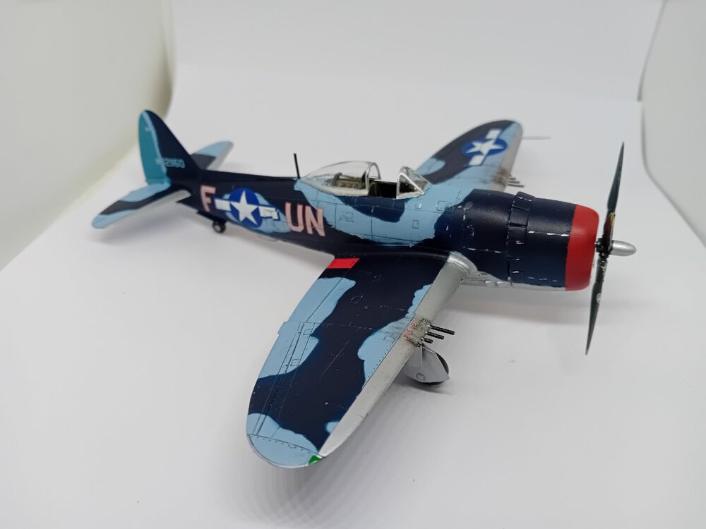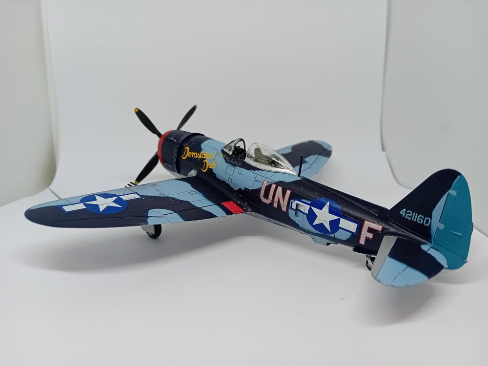 Samolot , na którym dwoch.pilotów uzyskało zwycięstwa nad Me-262 . John C. Fahringer i George Bostwick, obaj latali w 63 dywizjonie USAAF. Modelik Revella dobrze składalny, tylko trochę trzeba obrobić części z nadlewek. I pylony do zbiorników/bomb pod skrzydłami nie bardzo pasują do profilu skrzydła, ja w ogóle z nich zrezygnowałem, ale jak by komuś zależało, to trzeba popracować nad nimi. Reszta pasuje, choć słyszałem, że zdarzają się spore różnice jakości pomiędzy poszczególnymi zestawami. I nie mam pojęcia dlaczego niektórych zdjęć nie mogę dodać do galerii inaczej niż odwrócone "do góry kołami" Także sorry za ewentualny wytrzeszcz oczu,.9 punktów