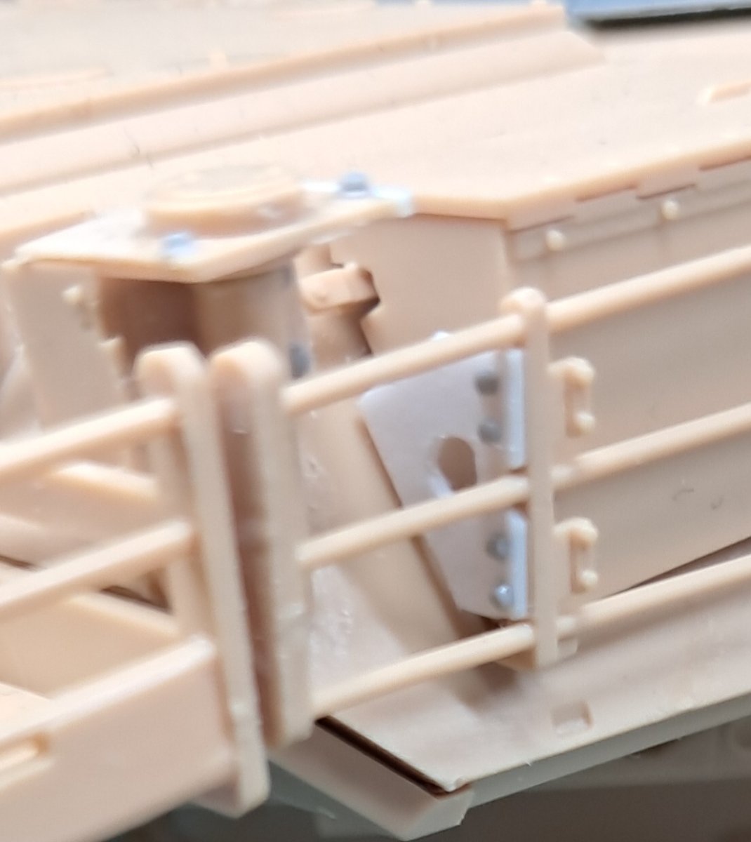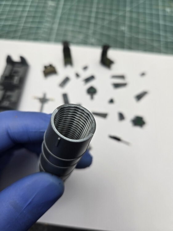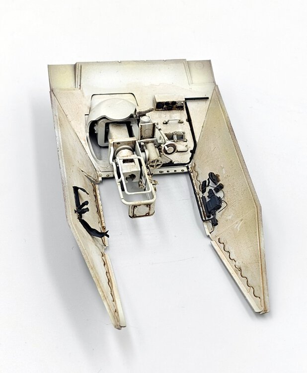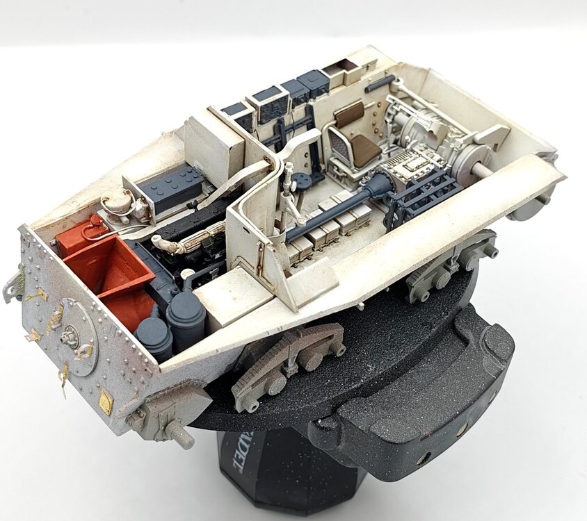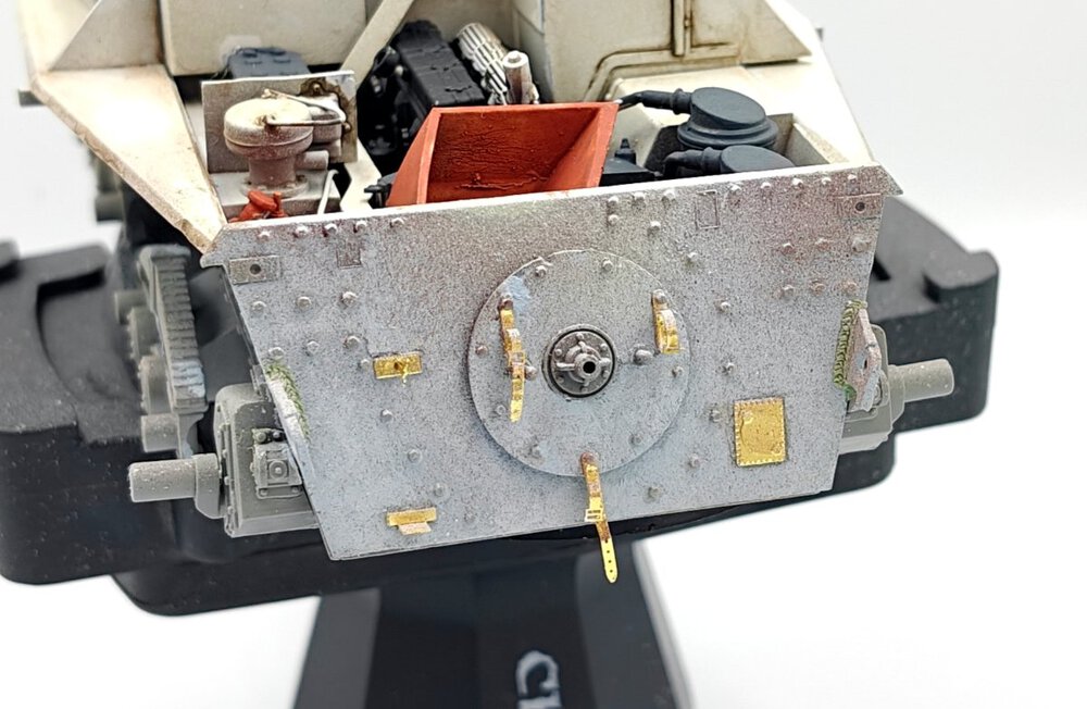 Z duszą na ramieniu, ale wypadałoby podzielić się postępami. Po pierwsze postanowiłem skorzystać z tej rady: Więc ograniczyłem się do dorobienia kilku przewodów + czegoś co ma być zniszczonymi statywami do amunicji w miejscu gdzie prawdopodobnie doszło do eksplozji. Wnętrze będzie niespecjalnie widoczne więc postanowiłem potraktować je podobnie jak przy sklejaniu- jako poligon doświadczalny i materiał do przypomnienia sobie pewnych technik. Na razie po dwóch washach a detale nie ruszone oprócz podstawowych kolorów- pewnie w tygodniu będę się bawił dalej i do końca tygodnia chciałbym zamknąć gada i móc się skupić na przeróbkach na zewnątrz. Zakładam (albo i mówiąc wprost: wiem na pewno) że kolory kilku elementów nie do końca pokrywają się z rzeczywistością ale nie wiem na ile chce mi się z tym cokolwiek robić. Niezależnie od wnętrza zacząłem sobie dłubać tylną płytę. Trochę mgiełki przy malowaniu wnętrza przeniosło się na nią stąd dziwny wygląd na zdjęciu. Widać że trochę zmodyfikowałem wygląd napinaczy, żeby przypominały bardziej odpowiednią wersję. Brakuje jeszcze śrub wpuszczonych w pancerz z frezem na śrubokręt- pamiętam o nich. Jeśli chodzi o centralny właz okrągły to umieściłem nity jak były w modelu Takoma- oczywiście powinno być ich więcej i gęściej rozmieszczonych. Nie wiem czy będę to ruszał, waham się. W kwestii wielkości śrub- wiem że powinny być 3 różne wielkości a są 2. Założyłem, nie wiedzieć czemu, że w jednym z zamówionych zestawów śrub przyjdą takie 0,6 mm. Nic takiego się nie wydarzało, najmniejsze jakie doszły to 0,8 mm które miałem już zamontowane wiec nie chciało mi się ich zmieniać na większe, zresztą nawet 0,8 mm są w mojej ocenie za duże. Nie jestem jakoś wybitnie zadowolony z geometrii, pomimo zakupu suwmiarki i prób dokładnych pomiarów. Na żywo w oczy kole mniej Tak że no cóż- powoli do przodu6 punktów