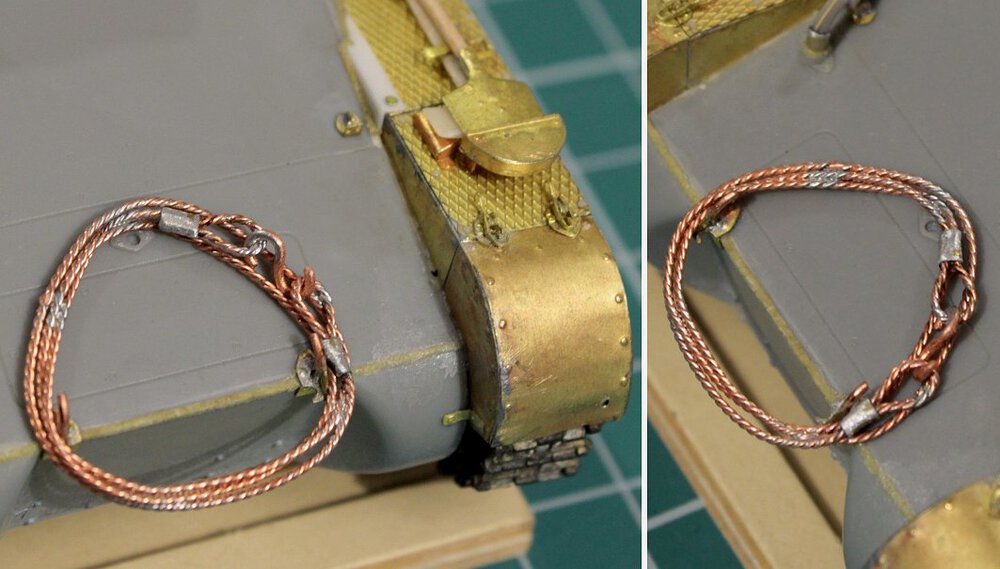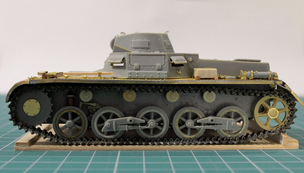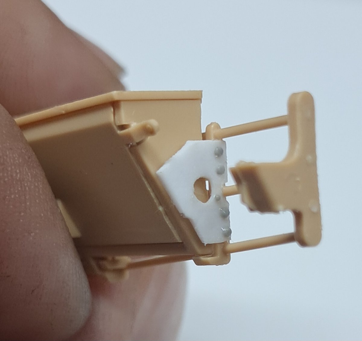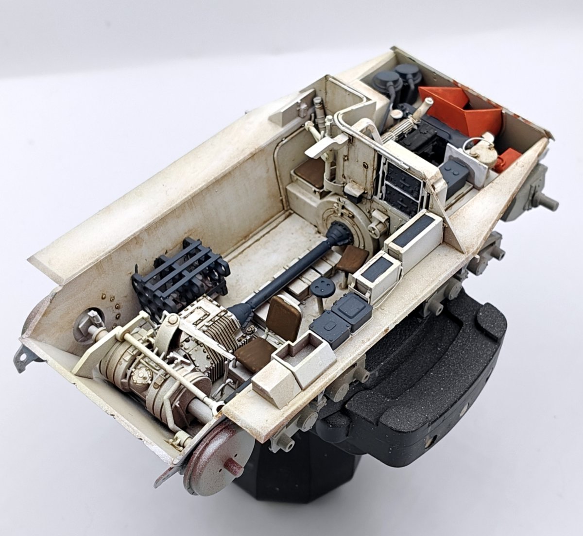 Z duszą na ramieniu, ale wypadałoby podzielić się postępami. Po pierwsze postanowiłem skorzystać z tej rady: Więc ograniczyłem się do dorobienia kilku przewodów + czegoś co ma być zniszczonymi statywami do amunicji w miejscu gdzie prawdopodobnie doszło do eksplozji. Wnętrze będzie niespecjalnie widoczne więc postanowiłem potraktować je podobnie jak przy sklejaniu- jako poligon doświadczalny i materiał do przypomnienia sobie pewnych technik. Na razie po dwóch washach a detale nie ruszone oprócz podstawowych kolorów- pewnie w tygodniu będę się bawił dalej i do końca tygodnia chciałbym zamknąć gada i móc się skupić na przeróbkach na zewnątrz. Zakładam (albo i mówiąc wprost: wiem na pewno) że kolory kilku elementów nie do końca pokrywają się z rzeczywistością ale nie wiem na ile chce mi się z tym cokolwiek robić. Niezależnie od wnętrza zacząłem sobie dłubać tylną płytę. Trochę mgiełki przy malowaniu wnętrza przeniosło się na nią stąd dziwny wygląd na zdjęciu. Widać że trochę zmodyfikowałem wygląd napinaczy, żeby przypominały bardziej odpowiednią wersję. Brakuje jeszcze śrub wpuszczonych w pancerz z frezem na śrubokręt- pamiętam o nich. Jeśli chodzi o centralny właz okrągły to umieściłem nity jak były w modelu Takoma- oczywiście powinno być ich więcej i gęściej rozmieszczonych. Nie wiem czy będę to ruszał, waham się. W kwestii wielkości śrub- wiem że powinny być 3 różne wielkości a są 2. Założyłem, nie wiedzieć czemu, że w jednym z zamówionych zestawów śrub przyjdą takie 0,6 mm. Nic takiego się nie wydarzało, najmniejsze jakie doszły to 0,8 mm które miałem już zamontowane wiec nie chciało mi się ich zmieniać na większe, zresztą nawet 0,8 mm są w mojej ocenie za duże. Nie jestem jakoś wybitnie zadowolony z geometrii, pomimo zakupu suwmiarki i prób dokładnych pomiarów. Na żywo w oczy kole mniej Tak że no cóż- powoli do przodu6 punktów