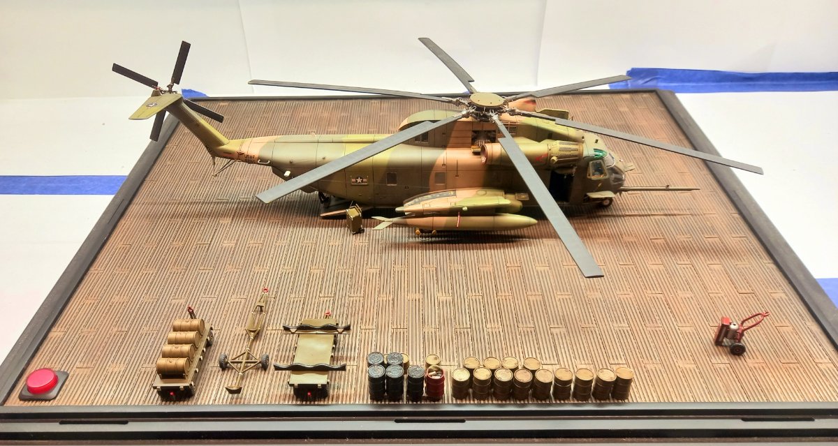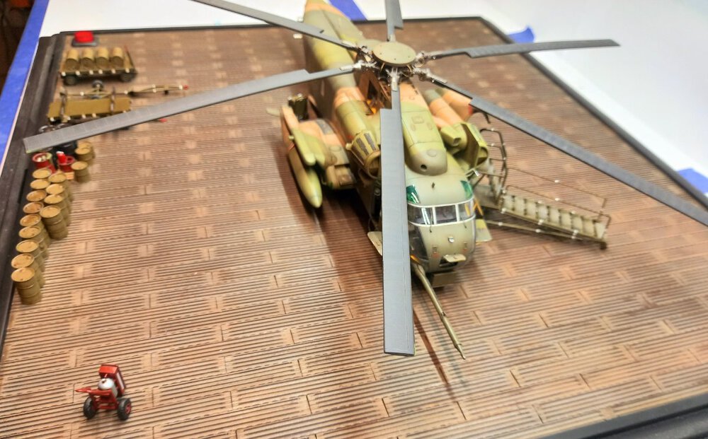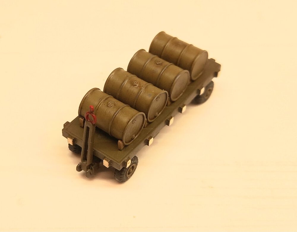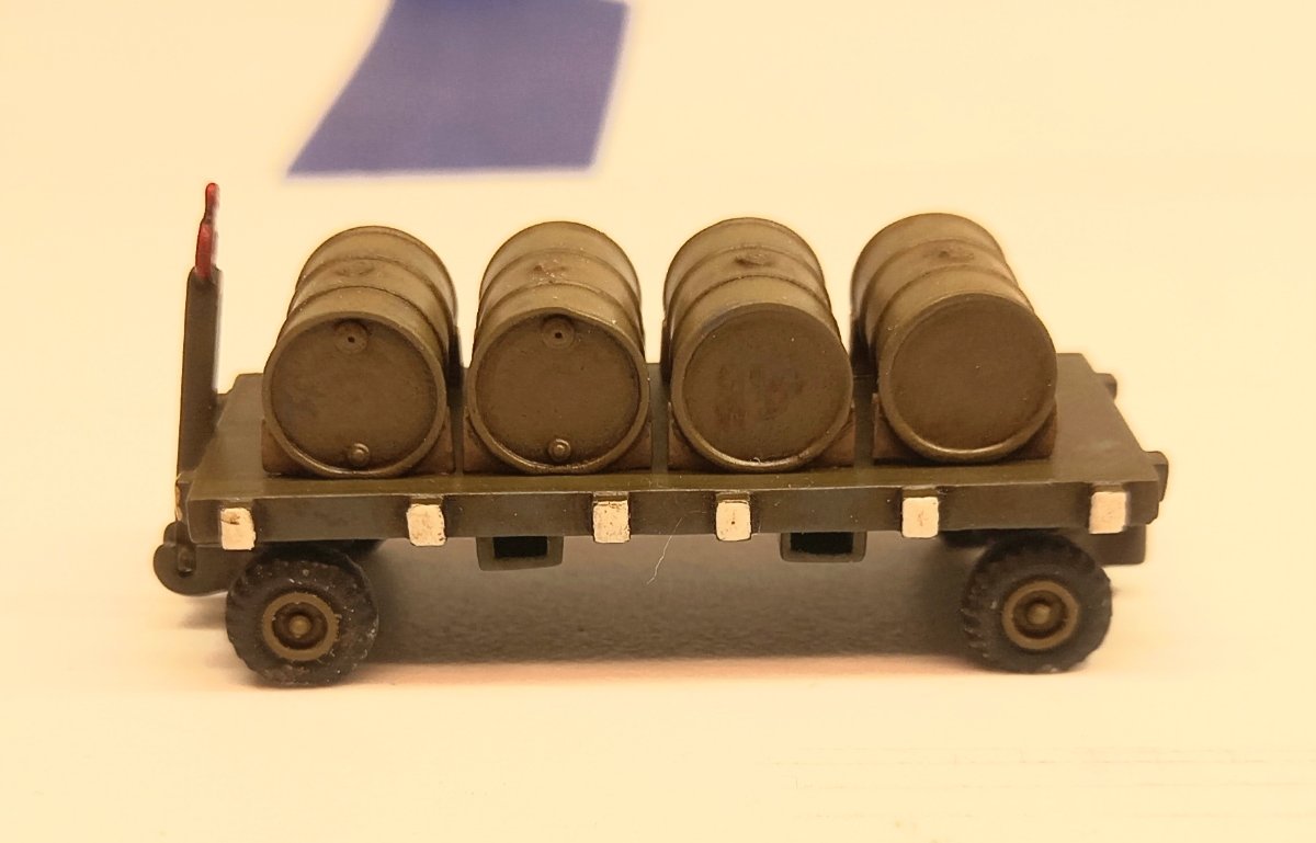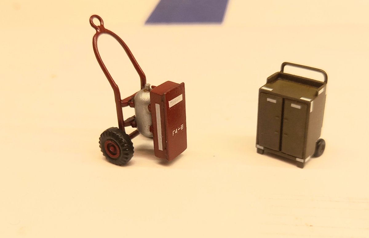 W czasie gdy wash na figurkach dosychał, zająłem się ponownie sprzętem lotniskowym. Postanowiłem dodać jeszcze wózek do transportu zbiorników . Przerobiłem też standardową przyczepę (taką samą jak ta z beczkami) dodając stelaż do przewozu zbiorników. Przyszedł też czas na ostateczne zmontowanie podestów B1 i C1 po uprzednim dorobieniu instalacji hydraulicznej do podnoszenia podestu. Złożyłem też przyczepę z beczkami, gaśnicę i szafkę narzędziową. A oto cały inwentarz przymierzony do dioramy:8 punktów