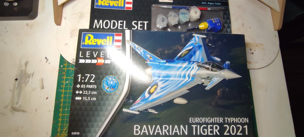 Witam Na półce leżał i na mnie patrzył eurofighter. No to tygrysa na półkę i wracamy do lotnictwa. Eurofighter będzie w malowaniu Bavarian Tiger z 2021 roku. Mam kilka fotek na których będę się wzorował: I żeby nie było, fota pudełka: Proszę się nie martwić, przed dotknięciem pudełka wyczytałem wszystkie (no prawie wszystkie) podstawowe informacje na temat tego odrzutowca. Na razie skończone siedzenie pilota: