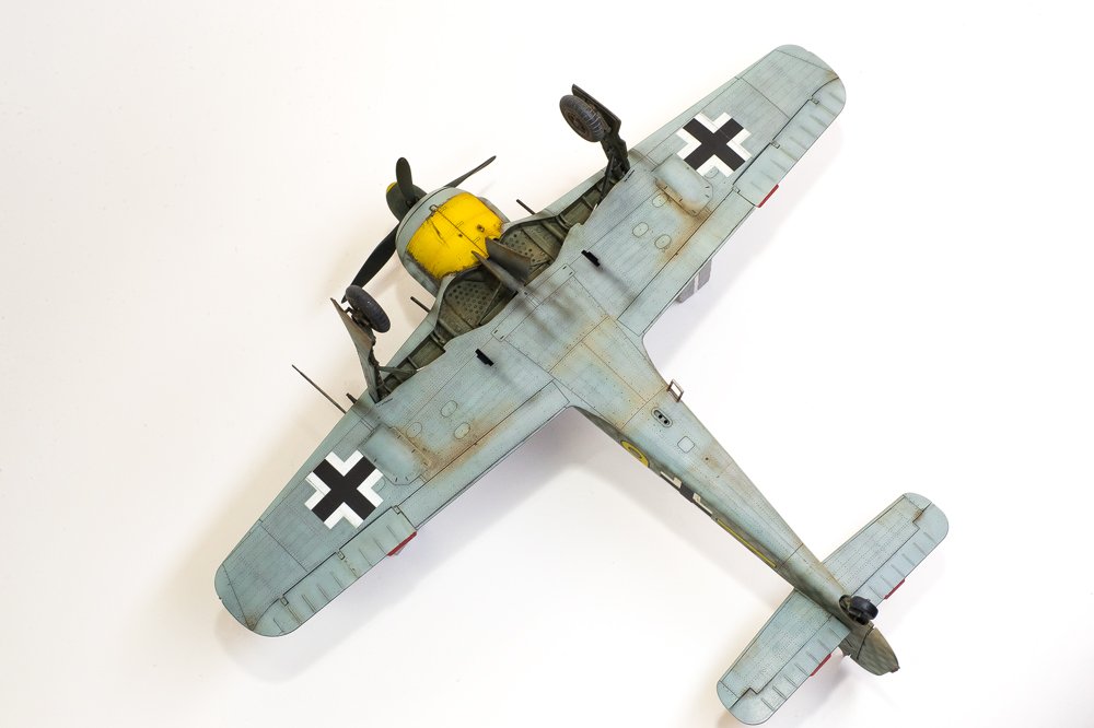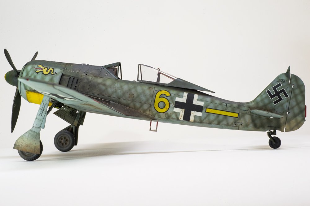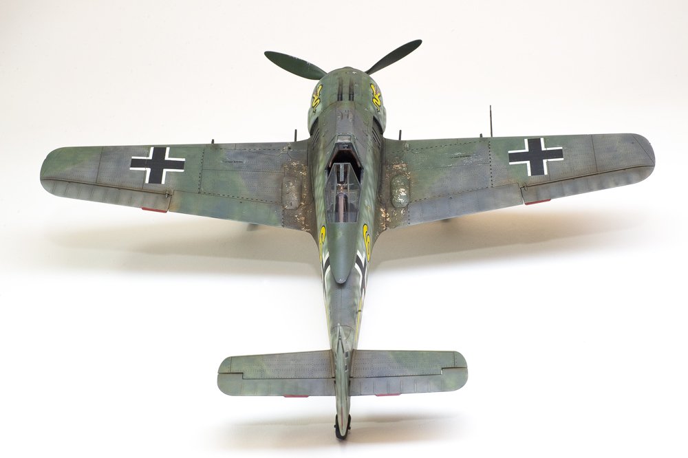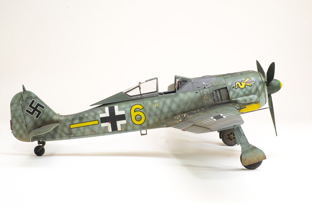 Po dwóch latach udało się zakończyć budowę. Bardzo dobrze pracowało mi się z tym modelem. Jak już wcześniej w temacie pisałem bardzo mnie dziwi taka mała ilość warsztatów i galerii w internecie. Warsztat tyle trwał że już nie pamiętam co tam dodawałem do modelu. Na pewno przewody przy goleniach i lufy wymieniłem na igły iniekcyjne. Co dziwne przez ten czas nie ułamałem rurki pitota jaka jest na stałe odlane ze skrzydłem Malowany Vallejo, brudzony olejami, kredkami i trochę pigmentami. Maszyna w malowaniu samolotu z 5./JG 301. Padło na nie, raz że bardzo mi się podoba połączenie kolorów kamuflażu z żółto czerwonymi pasami, dwa że już mam jedną krótkonosą fokę z tej jednostki. Zapraszam do galerii. I ze wspomnianą krótkonosą Fw