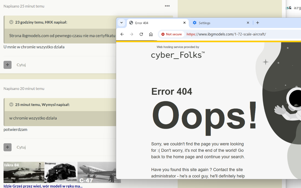HKK Napisano 3 godziny temu Share Napisano 3 godziny temu (edytowane) 48 minut temu, Marek K napisał: Może Cię nie lubią. https://ibg.com.pl/kategoria-produktu/modele/samoloty/?filter_skala=1-72&query_type_skala=or Na 3 kompach nie mam problemu. Przeczytaj dokładnie mój post. ibg.com.pl działa i ma certyfikat (do kwietnia) Sprawdź ibgmodels.com Edytowane 3 godziny temu przez HKK Cytuj Odnośnik do komentarza Udostępnij na innych stronach More sharing options...