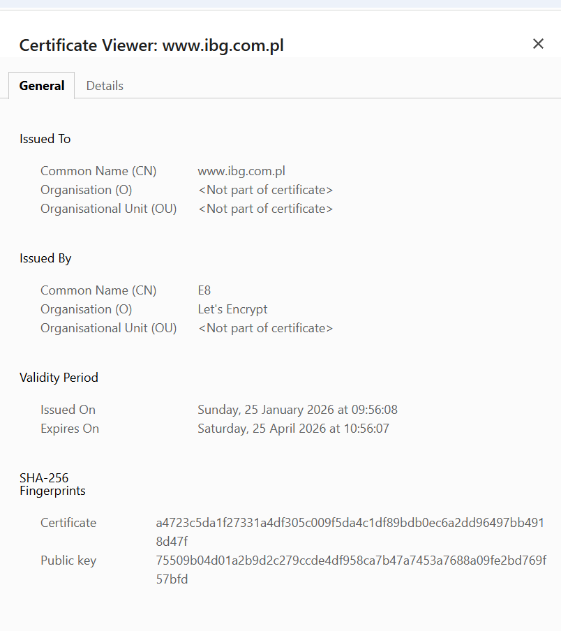 HKK Napisano 4 godziny temu Share Napisano 4 godziny temu (edytowane) Po domyślnym protokole https (bezpiecznym) nie działa. Muszę wpisać "na siłę" http:// Strona najwyraźniej nie ma ważnego certyfikatu Strona sklepu ibg.com.pl ma certyfikat: Ale wykupiony tylko na bieżący kwartał. Oszczędności? Jeśli tak, to trochę słabo. Edytowane 4 godziny temu przez HKK Cytuj Odnośnik do komentarza Udostępnij na innych stronach More sharing options...