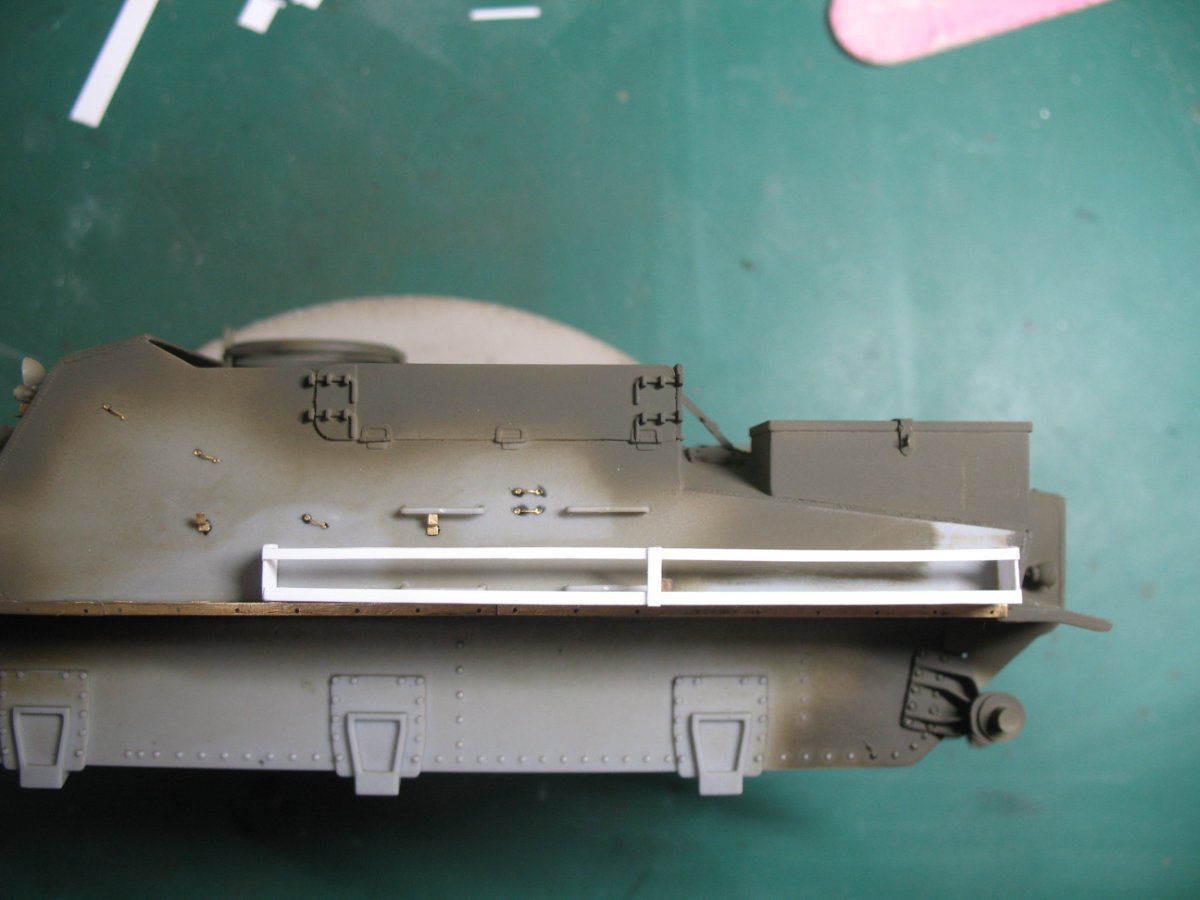 Lipstein Napisano 23 Stycznia Autor Share Napisano 23 Stycznia (edytowane) Mam gdzieś takie dystynkcje... W zestawie blaszek są elementy do złożenia ostróg na gąsienice, ale że oczy i ręka już nie te, pociąłem jakieś złomowe części z M10, oszlifowałem i pomalowałem Dark Iron. Ze zdjęć wynika, że były to odlewane stalowe lub staliwne elementy, więc nie będę szaleć z blaszkami. Mam problem: kierowca po obcięciu obu rąk nijak nie zmieści się między burtą kadłuba a osłoną działa. Edytowane 24 Stycznia przez Lipstein Cytuj Odnośnik do komentarza Udostępnij na innych stronach More sharing options...