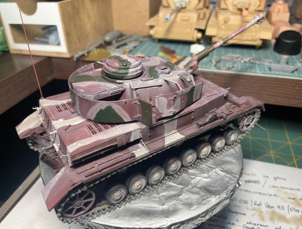 Tyle na wczoraj bo już suchych pędzli brakło. Dziś zrobiłem jeszcze koła. Kwestia czy to zostawiać na tej warstwie czy coś jeszcze działać ale muszę i tak narazie uporać się z całością i rozkminić temat lakieru na tym. Na kopułce dowódcy przy rantach są jakby albo “kanałki na wodę” albo tam było płasko. Nie wiem czy to poprawiać, jeszcze nie patrzyłem na zdjęcia. Został babol z budowy albo to celowy zamysł Bordera w co śmiem wątpić. Na wieży ogólnie nie ma także jeszcze brązu więc ostatecznie kolory mocno tam się zmienią. Jak na takie pierwsze podejście do malowania kamuflażu pędzlem całkiem fajnie się to czuję.