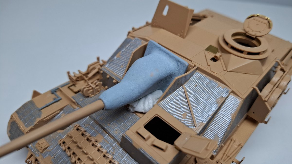 Zimmerit nałożony. Góra tylnej burty była pod Nibelunga, czego wcześniej nie zauważyłem,  ale że elementy nie są wymiarowe udało się to bezboleśnie zrobić na Kruppa. W zasadzie bez kleju. Miejscami tylko lekko po krawędziach. Mam nadzieję,  że nie odpadnie. Skrobiąc uszkodzenia, widziałem że różnie to trzyma. Może przed malowaniem przejadę jeszcze lekko klejem.