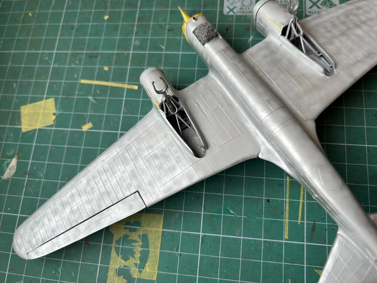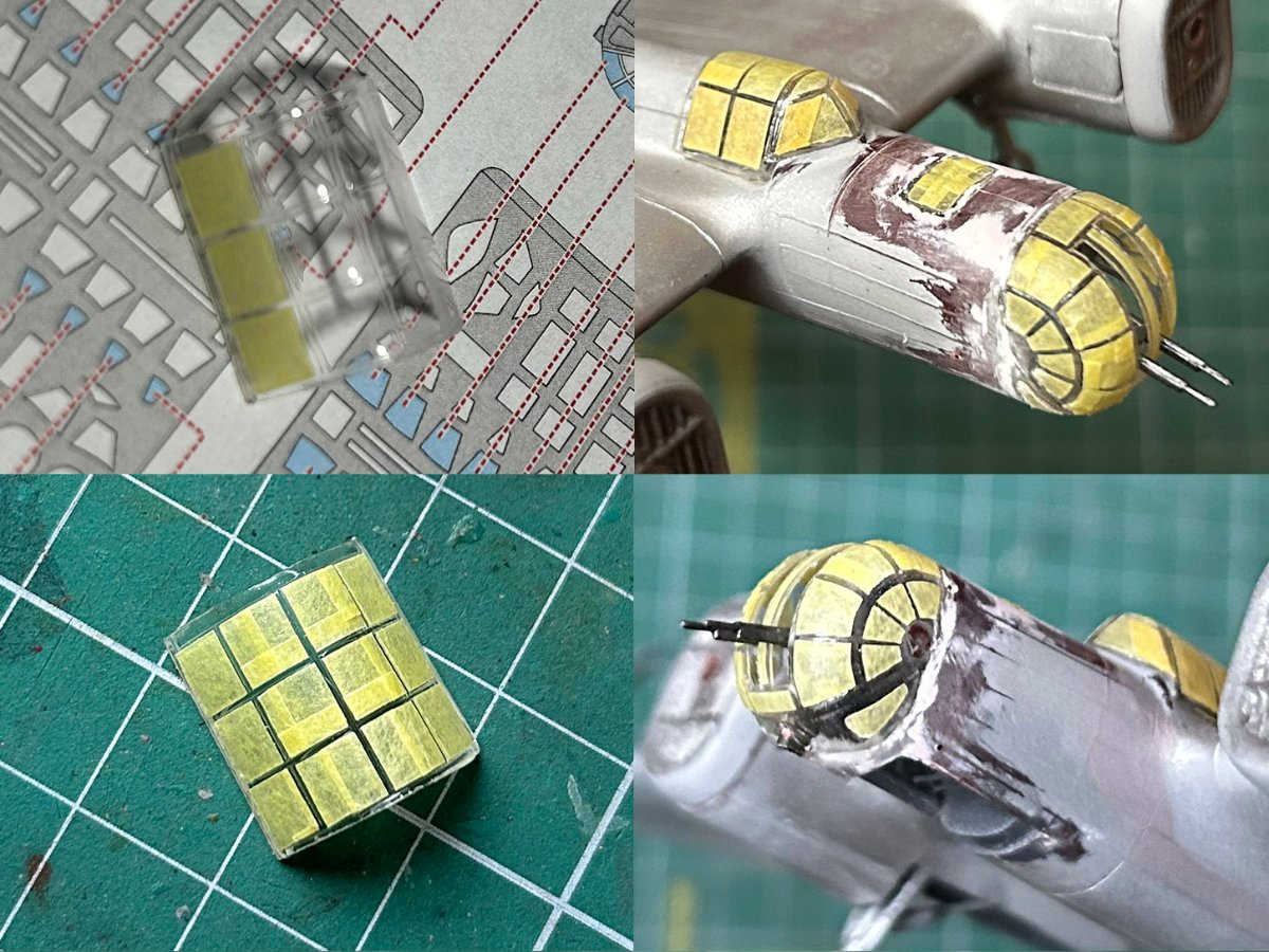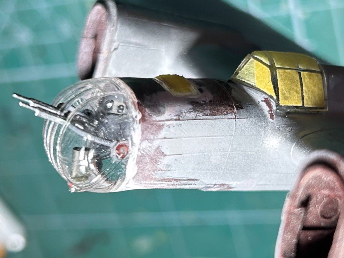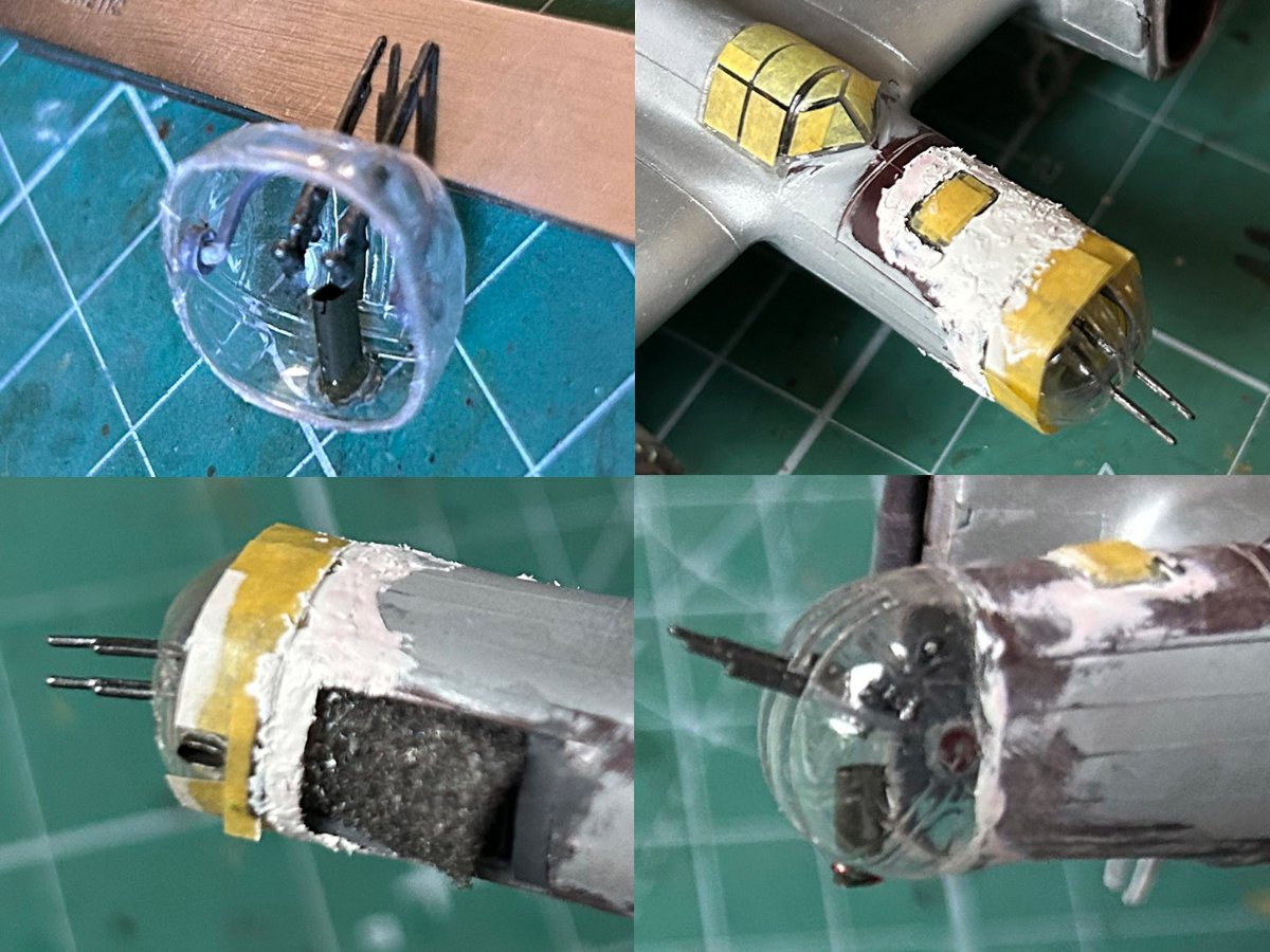Zamontowałem karabiny maszynowe i wyrzutnik łusek w kokpicie nawigatora. Skleiłem owiewkę kabiny (żywicą dwuskładnikową) i dopasowałem ją do kadłuba (szpachlówką Tamiya). Nie ma nic do pokazania, ale zajmuje to dużo czasu. :stolek: