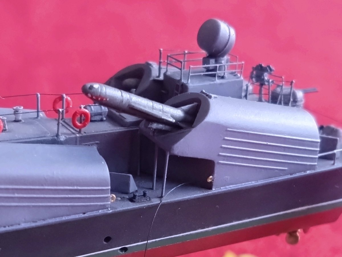 Na rufie, ponad działkiem znajduje się wyrzutnia Fasta. Śmieszna sprawa, bo to po prostu stelaż na wyrzutnie Strieła (takie sowieckie manpadsy -stingery). Mniej śmieszny był montaż tego ustrojstwa, bo składało się na niego z 10 miniaturowych blaszek. Projekt zakrawał o sadyzm, kilka elementów odpuściłem. Nie chciałbym powtarzać tego doświadczenia. Relingi w okolicach dały mi w kość. Wszędzie indziej mogłem nawiercić otworki, aby zakotwiczyć słupki. Tymczasem ten wąski, mały pokład między kontenerami pocisków tworzy blaszka fototrawiona. Tu niestety, nie było szans wywiercenia otworów. W rezultacie, podczas naciagania relingów (są zrobione z elastycznej linki Uschi fine) słupki-druciki kilkakrotnie mi się położyły. Trzeba było całość odklejać i zaczynać od początku. Bluzgów poleciało sporo. I sporo farfocli kleju zostało, co poradzić...