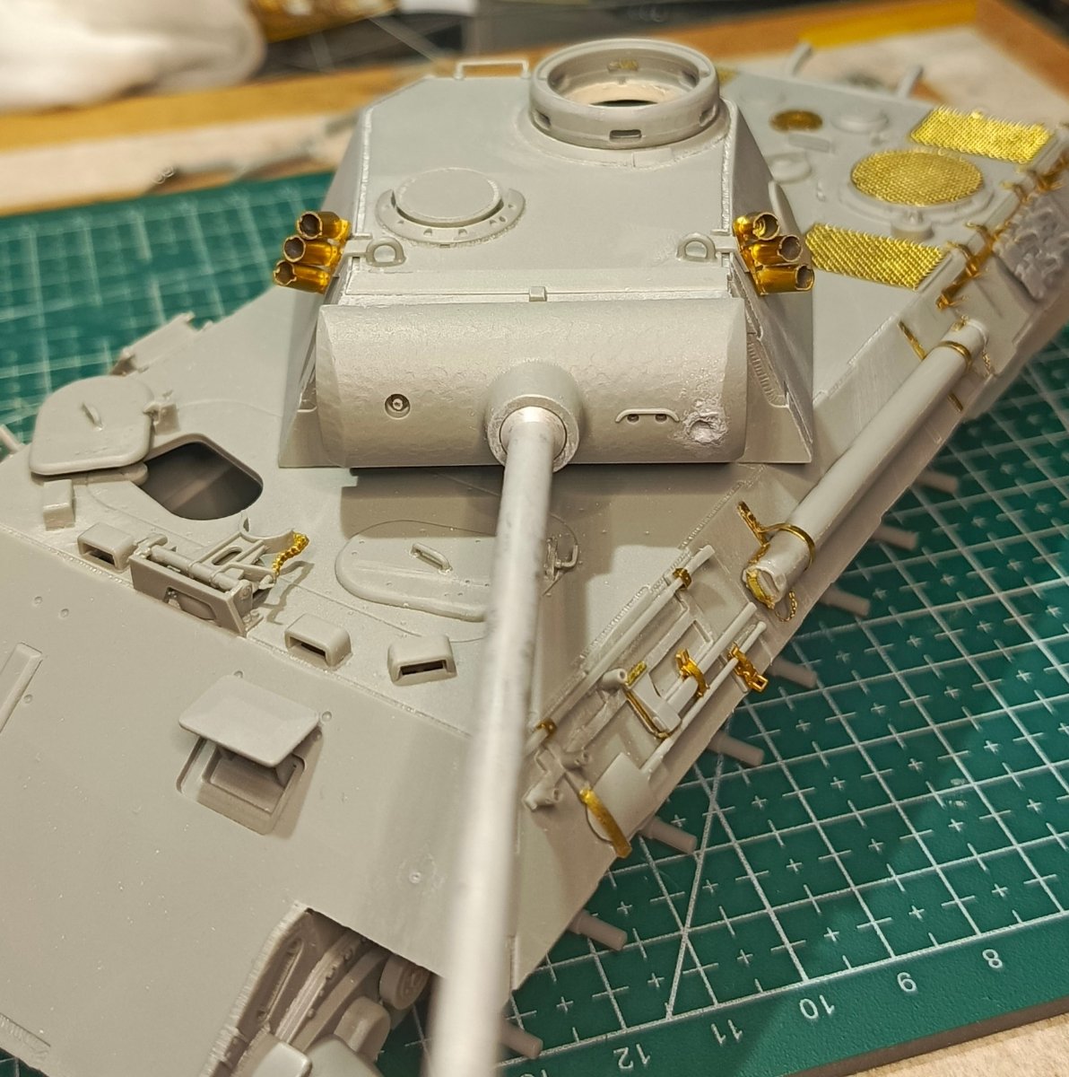 Macisso Napisano 8 Kwietnia Autor Share Napisano 8 Kwietnia Czołem. Woda w Wiśle płynie nieubłaganie i sporo już jej ubyło od ostatniej aktualizacji. Prace z dużymi przerwami trwają. Kończę uzbrajanie wieży. Zostało wykonać okablowanie do granatów dymnych. W międzyczasie dotarły klamry od Abera i zaczęła się gimnastyka. Nim udało się złożyć pierwszą, zdążyłem 3 razy zarzucić projekt Na szczęście każda kolejna wychodzi lepiej i ładnie się otwierają/zamykają. Naturalnie trafiły na model. Poprawiłem kilka niedociągnięć, dodałem kilka detali i powoli pantera zaczyna wyglądać jak gotowy czołg. Walka z nitami w kołach trwa. Zostało do zrobienia 5 kół, czyli bliżej niż dalej. Otwartą pozostaje kwestia zasobnika (osłony/skrzyni) na narzędzia (młot i jakaś rura) na prawej burcie czołgu. Czy dłubać to samemu, czy to idzie gdzieś kupić jako dodatek? Pozdro i na łączach. Ps. Uprzedzając... Gąsienice na burcie będą obrobione 2 Cytuj Odnośnik do komentarza Udostępnij na innych stronach More sharing options...