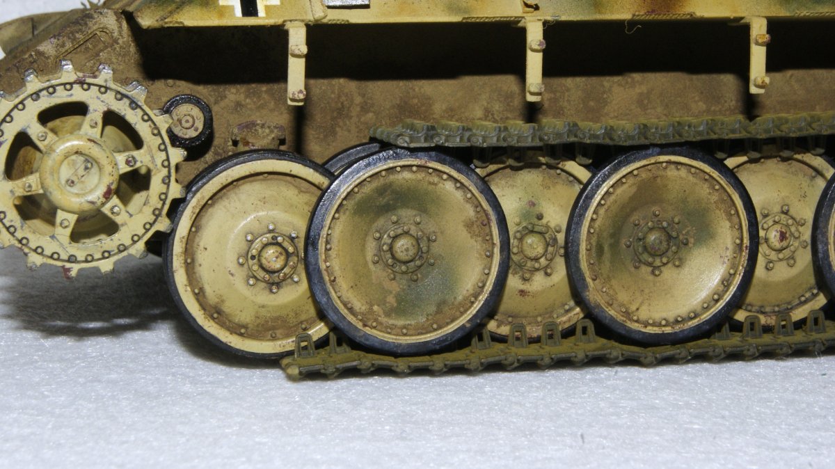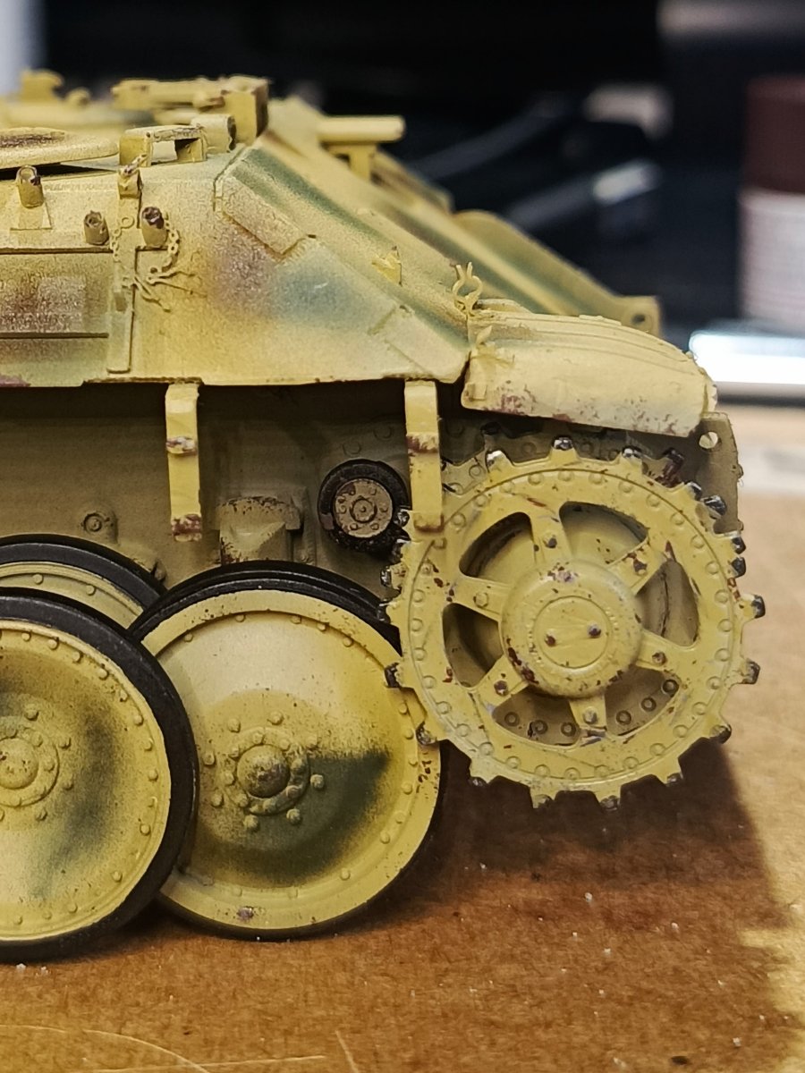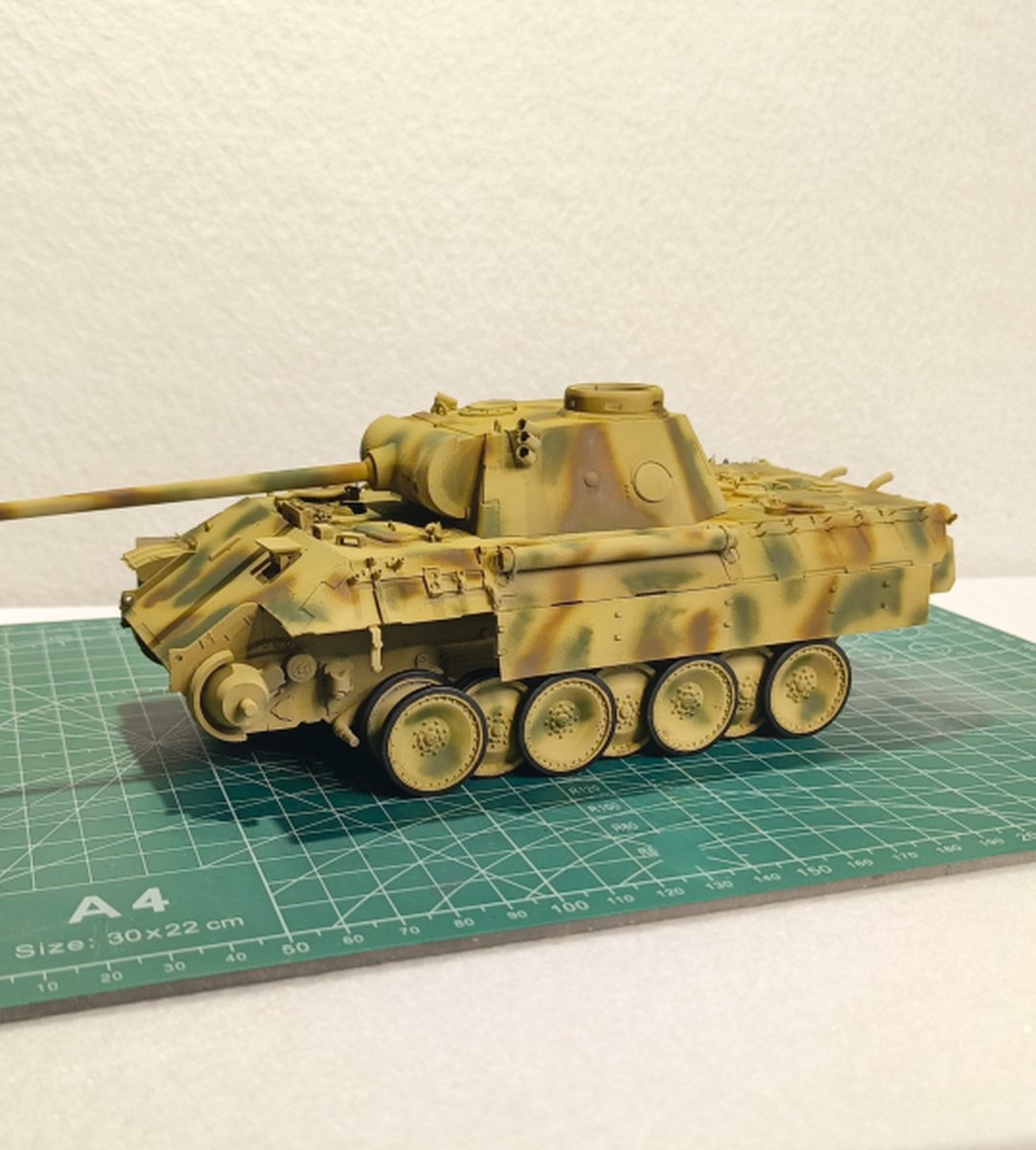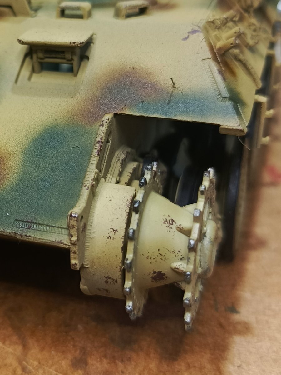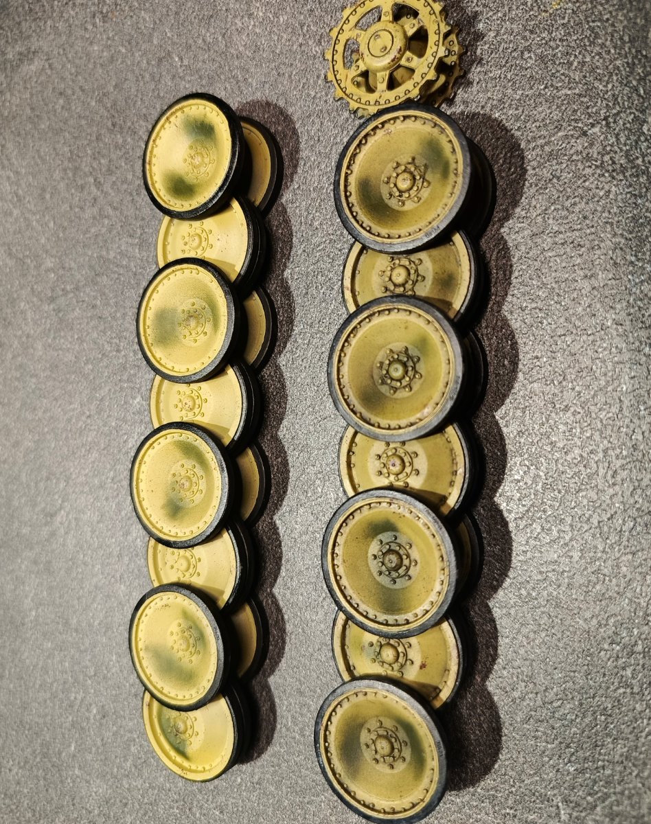 Macisso Napisano 4 Października Autor Share Napisano 4 Października Dzień dobry szanownym kolegom i koleżankom. Sezon koncertowy dobiegł końca, zatem mogę wrócić do porzuconego wiosną projektu Z nieukrywaną radością zabrałem się do malowania kół jezdnych a następnie kamuflażu na czołg. Dokładna opcja malowania nie jest mi znana, ale na bazie wiedzy którą udało mi się posiąść, zdecydowałem się na kamo położone finalnie na maszynę. Z racji że nie było "z góry" ustalonego wzoru, tak jak pancerniacy niemieccy w 43' i ja pozwoliłem sobie na sporą dawkę inwencji twórczej. Mam niestety braki sprzętowe i już wiem, że do takiego mazania z "wolnej ręki" potrzebuje kupić lepszy (bardziej dokładny) aerograf. Nauka nie idzie w las Niestety czeka mnie niedługo tygodniowy wyjazd, ale obiecuję ruszyć mocno z tematem po powrocie. Chciałbym w tym roku skończyć nie tylko czołg, ale i dioramę. Ps. Po kilku miesiącach przerwy (panterka nawet nie wychodziła z pudła) w klejenia, przyznaję że ilość detali i stosunkowo niezła jakość pracy zrobiła na mnie całkiem niezłe wrażenie. Niewątpliwie jest to zasługa wielu z Was, zatem jeszcze raz dziękuję za motywację i wskazówki Na łączach! 2 Cytuj Odnośnik do komentarza Udostępnij na innych stronach More sharing options...