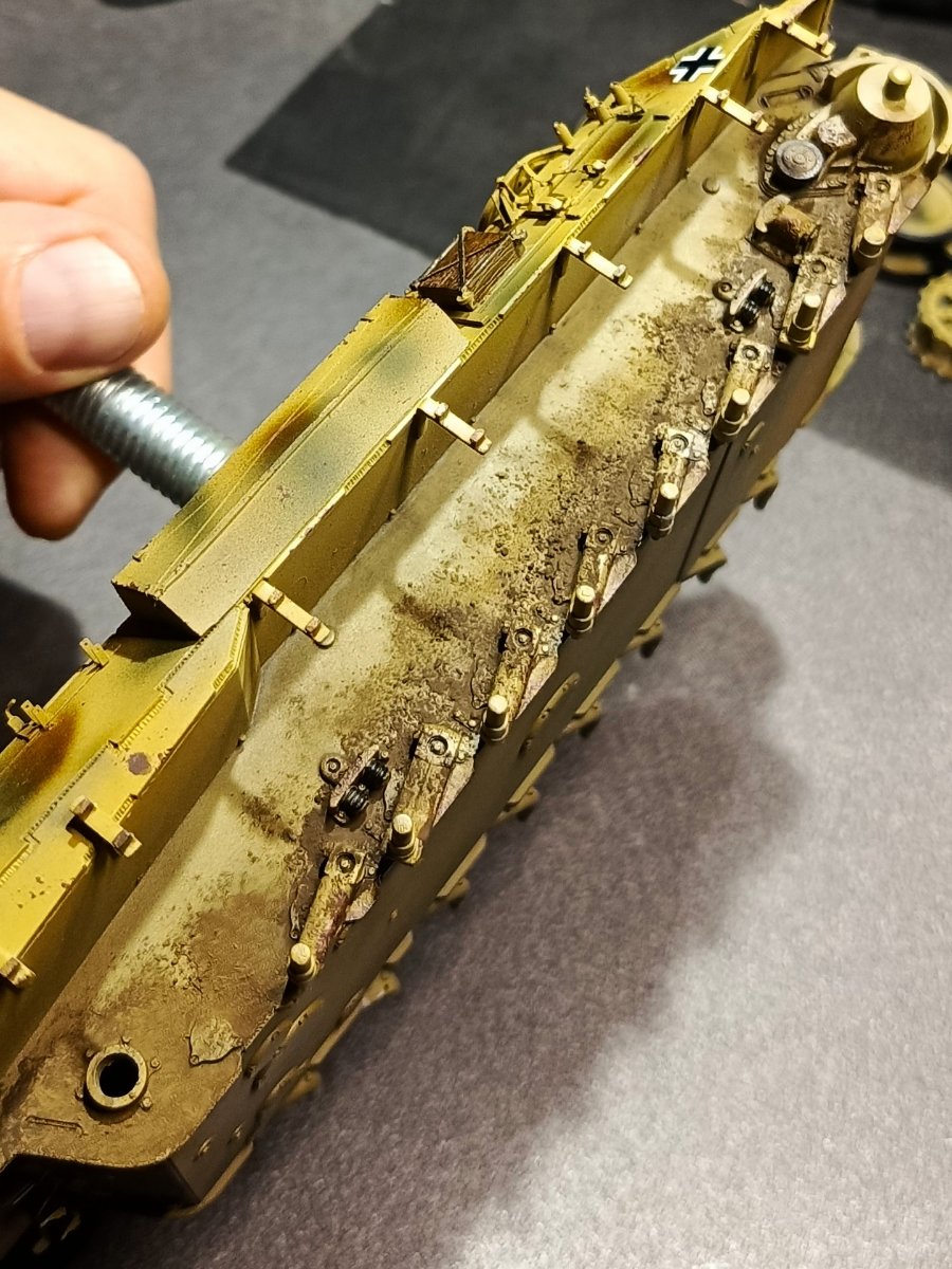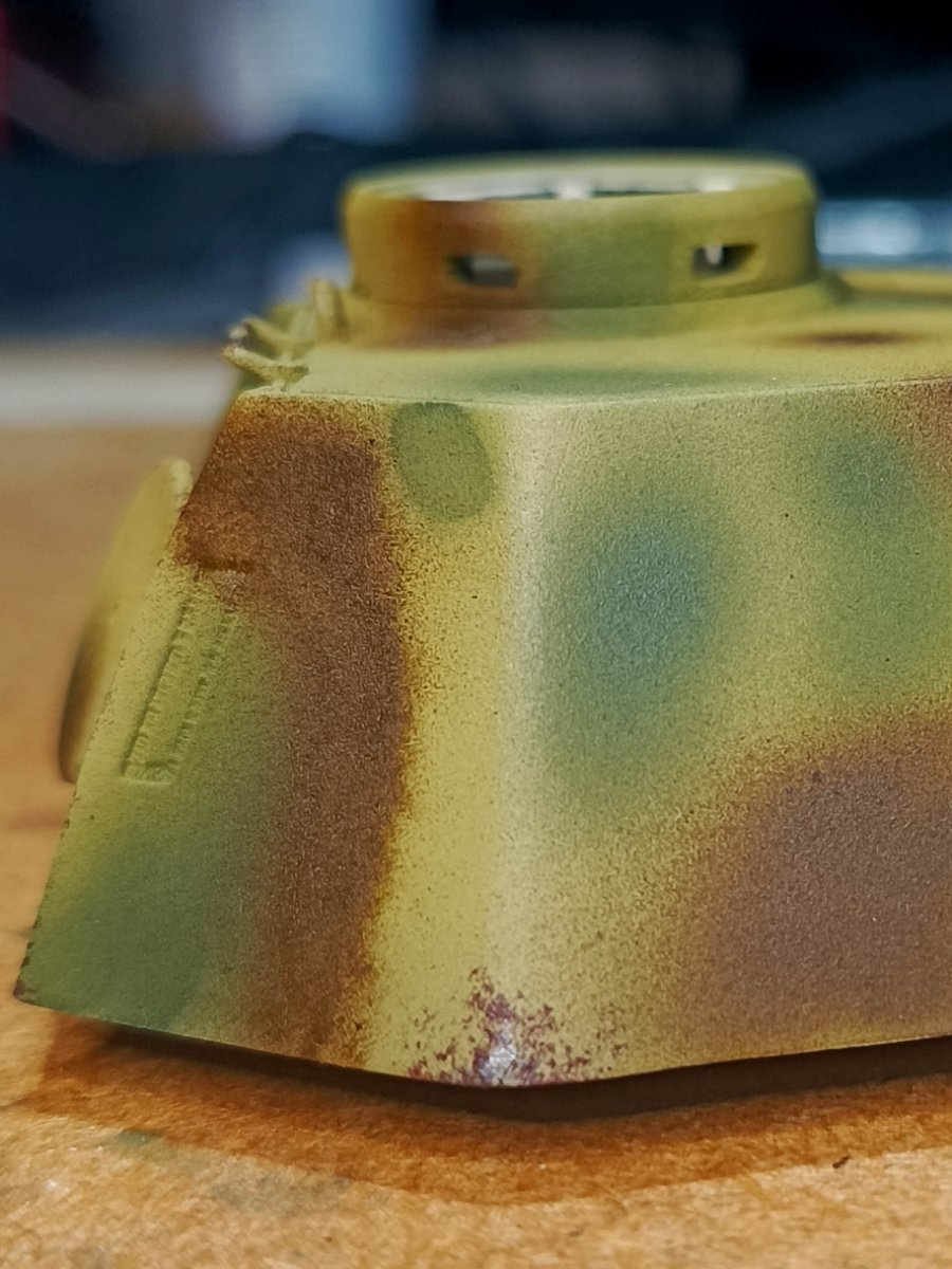 Macisso Napisano 8 Października Autor Share Napisano 8 Października (edytowane) Cześć! Mały update z racji, że wyjazd przesunął mi się o dzień. Na kadłub nałożyłem washe, ziemię i ukończone fragmenty gąsienic na burtach. Całość nabiera wyrazu i ładnie się ze sobą "stapia". Zdjęcia bezlitośnie wyraźne, zatem kilka drobiazgów do poprawki się pokazało. Nie mniej na żywo jest całkiem ładnie. Do usłyszenia! Edytowane 8 Października przez Macisso 1 Cytuj Odnośnik do komentarza Udostępnij na innych stronach More sharing options...