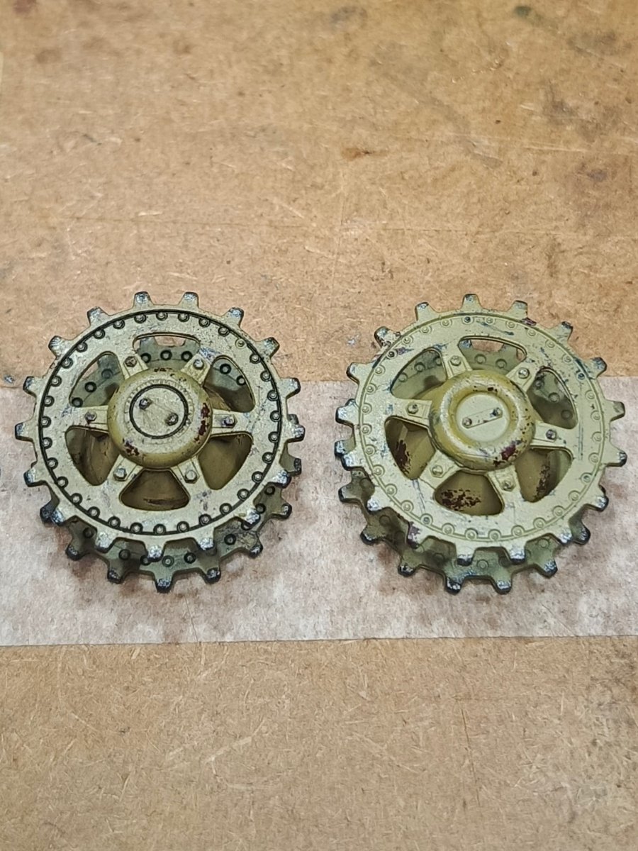 Macisso Napisano 6 Października Autor Share Napisano 6 Października @patrykdniestety, jak pisałem już troszkę wyżej, malowanie nie wyszło do końca dobrze. Na następny projekt zakupię precyzyjny aerograf, bo w tej chwili używam czegoś z początków mojego modelarstwa, czyli z prehistorii W międzyczasie lekko pchnąłem temat dalej. Na start wash kół jezdnych i napędowych: Lewe po washu Drewniany klocek pod podnośnik nabrał wyrazu. Z racji, że plastik był zupełnie płaski, dorobiłem fakturę drewna czubkiem skalpela. Reszta to farba i washe Na koniec lekki test brudzenia ziemią na burcie. Lekko dopieszczę i będzie ładnie. Fajnie, że nie będzie tego widać po nałożeniu napędu Niestety teraz wyjazd, zatem słyszymy się za jakieś dwa tygodnie. Pozdrowienia! Cytuj Odnośnik do komentarza Udostępnij na innych stronach More sharing options...