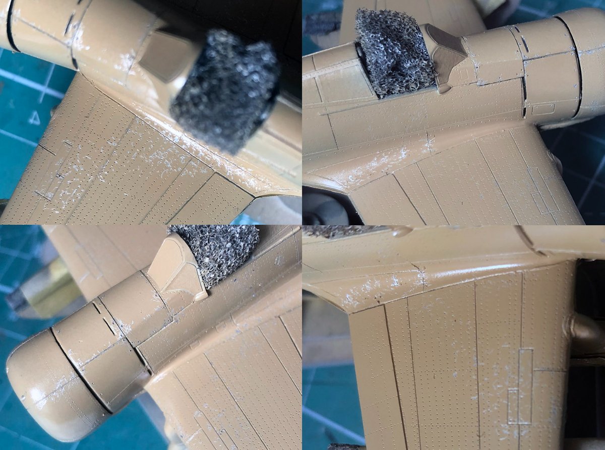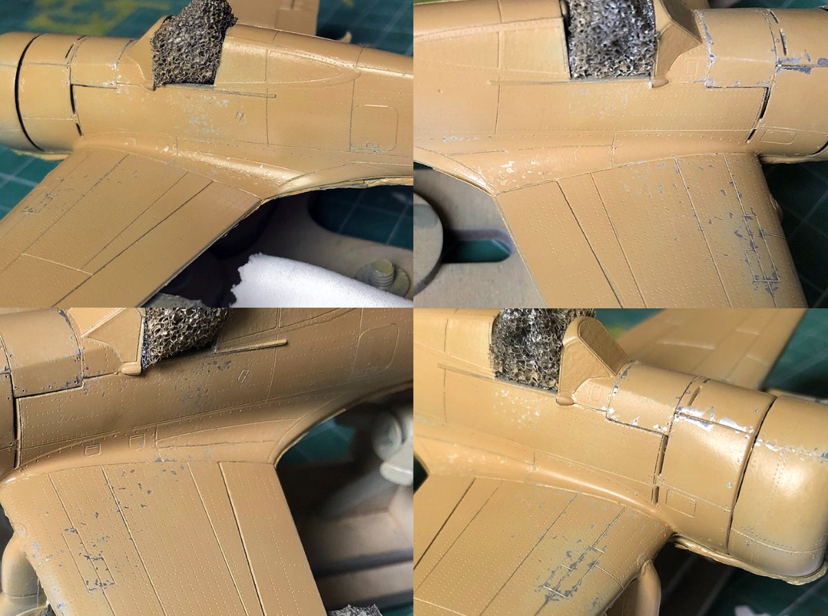 JollyMonk Napisano 18 Września Autor Share Napisano 18 Września Witajcie wszyscy! W lakierni trwają ciekawe prace: po zamaskowaniu spodu, na miejsca podatne na otarcia nałożono Vallejo Chipping Medium, a następnie (po kilku dniach schnięcia) na całą górną powierzchnię nałożono farbę piaskową Light Earth ARCUS E390s (seria RAF). Farbę rozcieńczono oryginalnym rozcieńczalnikiem w stosunku 1:3 i, moim zdaniem, nałożono ją wystarczająco cienko, aby uniknąć uszkodzenia nitów i drobnych elementów. Eksperymentowałem z tworzeniem odprysków zaostrzoną wykałaczką zaraz po nałożeniu farby. Bardzo mi się to spodobało: tworzyło dość cienkie, naturalnie wyglądające rysy. Nie poprzestałem jednak na tym i po 4-5 dniach schnięcia spróbowałem jeszcze raz popracować nad odpryskami. Płyn do usuwania odprysków Vallejo jest rozpuszczalny w wodzie i przeznaczony do stosowania z farbami akrylowymi. Byłem ciekaw, jak poradzi sobie z emalią po wyschnięciu. Powiem tak: woda, którą nałożyłem, prawdopodobnie nie wniknęła w szkliwo, a raczej w powstałe wcześniej rysy, a środek do usuwania odprysków zadziałał dobrze (mam nadzieję, że tłumaczenie jest jasne i zrozumiałe). Farba jednak odeszła w większych kawałkach niż rysy i wyglądała bardziej jak ogołocony japoński samolot. Dodam też, że wyschnięta emalia dobrze się szlifuje i poleruje. W niektórych miejscach udało mi się ją zeszlifować do plastiku: bez problemu – część pokryje się innym kolorem, a resztę mogę poprawić. 5 Cytuj Odnośnik do komentarza Udostępnij na innych stronach More sharing options...