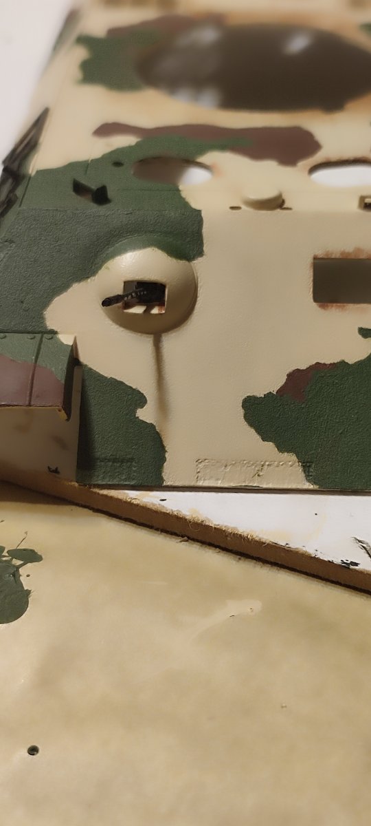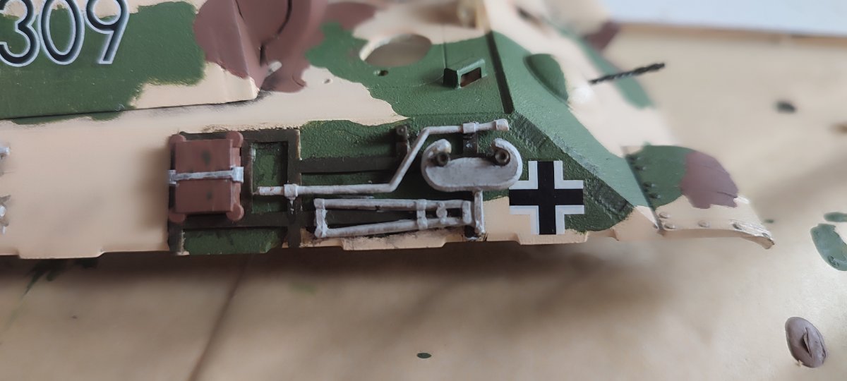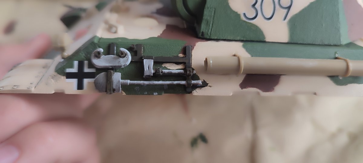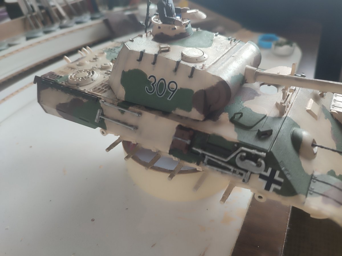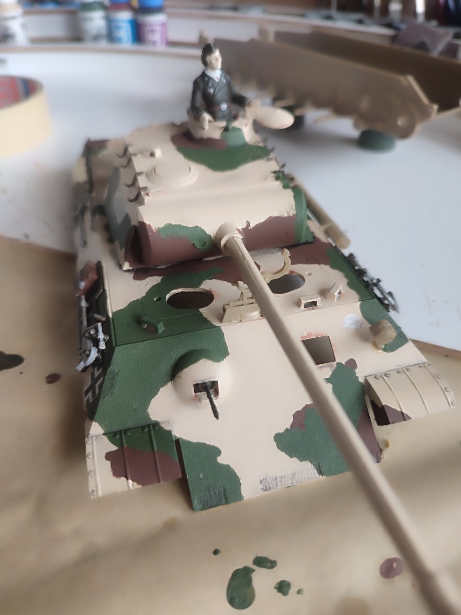 Coś tam podłubałem w naszej maszynie, żeby wzbogacić populację panter o kolejne 1. W międzyczasie poczytałem trochę rysów historycznych i tzw. "wojennych opowieści", i muszę wam powiedzieć że mój poziom zainteresowania tym pojazdem, wzniósł się na kolejny poziom. Wyczytałem, że dodatkowy ekwipunek w tych czołgach, taki jak siatki maskujące itp. wożono na tyle czołgu w takich jakby pokrowcach. Postanowiłem spróbować swych sił w tym temacie, i zrobiłem to z chusteczki higienicznej. "Uformowałem" ją w odpowiedni kształt, przykleiłem i pokropiłem to klejem, dzięki czemu to stwardnieje i łatwiej to będzie pomalować.1760184726018870248162857663904.thumb.jpg.9826e0c4a3f39589e259c2acf8e27601.jpg