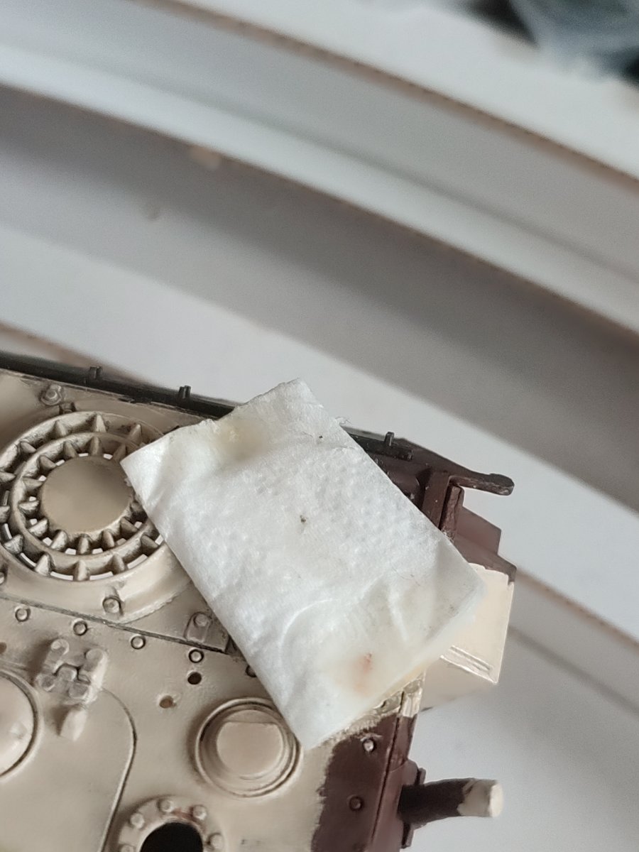 Ja to robię tak: nalewam trochę washa do piątej zakrętki, i mieszamy go z odrobiną wody. Później go nakładam (dosyć grubo) na czołg, po czym szybko moczę pędzel w wodzie i większość tego washu ścieram