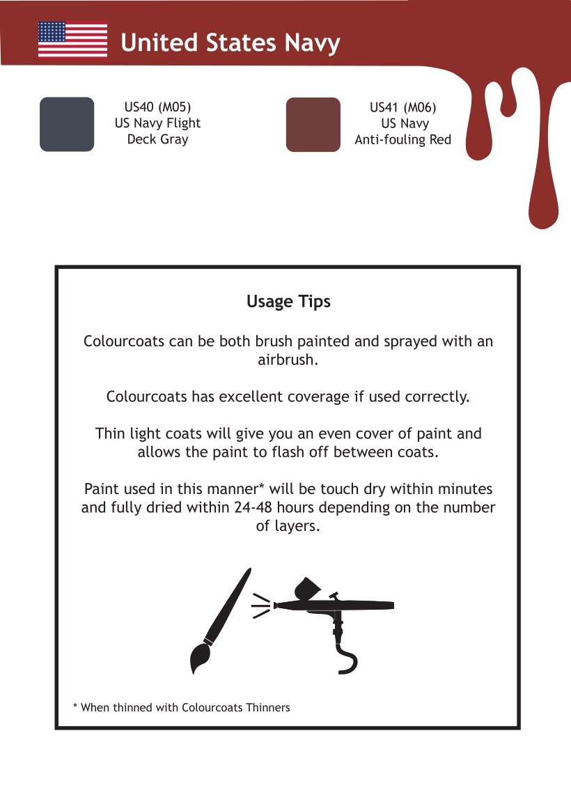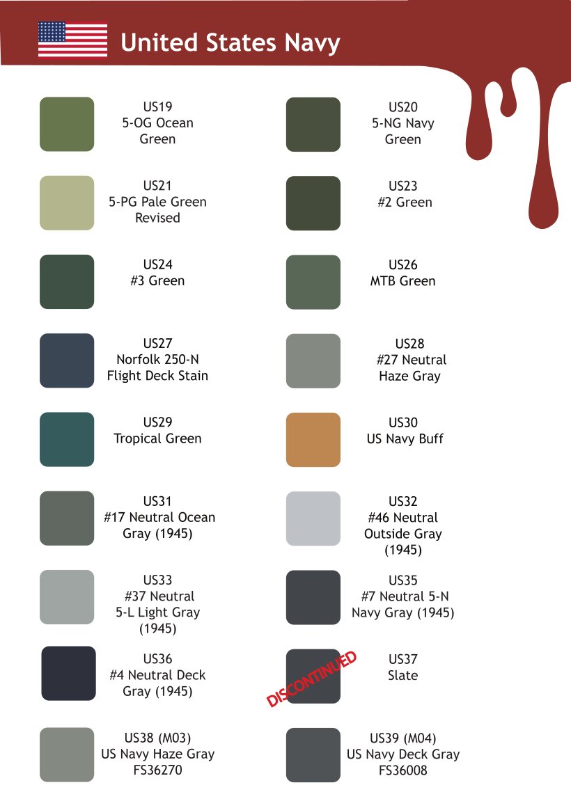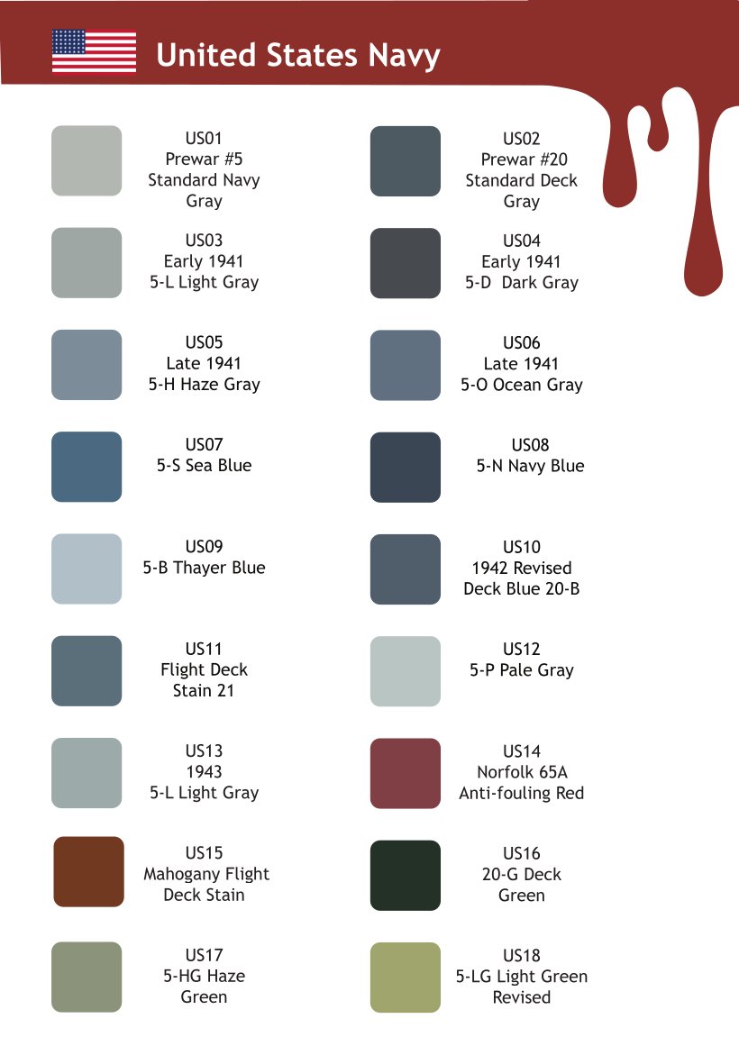 Kingfisher Napisano 25 Października Share Napisano 25 Października (edytowane) Poniżej dokładne formuły dot. mieszania farb USN. Widać ile pasty barwiącej 5-TM wchodziło do 5 (i 20) galonów białej farby 5-U i jakie były różnice pomiędzy poszczególnymi farbami. (na zielono zaznaczyłem najbardziej popularne kolory, które były produkowane z tej mieszanki). Niestety, jak już pisałem wcześniej, nie wiadomo jaka była dokładna receptura farby 5-TMa. Pomimo tego, informacje te były dla mnie pomocne przy tworzeniu własnej palety barw. Name Navy designation 1929 Munsell value Reflectivity Gloss Formulation Base (White) 5-U N 10/0 75 3 Pre-mixed; alkyd paint medium Thayer Blue 5-B 5B 8/2 50 3 1 pint Blue Tinting Material 5-BTM per 5 gal 5-U Pale Gray 5-P 5PB 8/1 55 1 pint Tinting Material 5-TMa per 20 gal 5-U Standard Navy Gray 5 10B 6.5/1.5** 44,00% 44 Pre-mixed; linseed-oil base Light Gray (early) 5-L 2PB 6.7/0.4* 40,00% 8 9 oz Tinting Material 5-TM per 5 gal 5-U Light Gray 5-L 5PB 7/2 35,00% 3 1 pint Tinting Material 5-TMa per 5 gal 5-U Light Gray (late) 5-L (#37) N 7/0 37,00% Premixed Haze Gray 5-H 5PB 6/2 28,00% 3 2 pints Tinting Material 5-TMa per 5 gal 5-U Haze Gray (late) 5-H (#27) N 6/0 27,00% Premixed Ocean Gray (early) 5-O 3PB 4.3/1.4* 16,00% 1 60 oz Tinting Material 5-TM per 5 gal 5-U Ocean Gray 5-O 5PB 5/2 17,00% 3 5 pints Tinting Material 5-TMa per 5 gal 5-U Ocean Gray (late) 5-O (#17) N 5/0 17,00% Premixed Sea Blue 5-S 5PB 4/4 11,00% 3 10 pints Tinting Material 5-TMa per 5 gal 5-U Navy Blue 5-N (5-NB) 5PB 3.4/3 9,00% 4 15 pints Tinting Material 5-TMa per 5 gal 5-U Navy Gray 5-N (#7) N 3.4/0 7,00% Premixed Dark Gray 5-D N 3/0** 6,00% 1 Premixed: 26.2 lb lampblack in 100 gal alkyd paint medium Dark Gray (conversion) 5-D 5PB 2.7/0.8* ? ? 1.25 lb Black Paste 5-BP per 5 gal #5 Std Navy Gray Dull Black 82 (#13) N 2.5/0 3,00% 1 Premixed Deck Blue 20-B 5PB 3/4 5,00% 11 20 pints Tinting Material 20-TM per 5 gal 20-U Deck Gray 20 (#4) N 3/0 4,00% 14 Premixed Flight Deck Stain (early) 250 5PB 3/2** Premixed Flight Deck Stain (mid) 21 5PB 4.5/3** Premixed Flight Deck Stain (late) 21 5PB 3/4** Premixed Edytowane 25 Października przez Kingfisher Cytuj Odnośnik do komentarza Udostępnij na innych stronach More sharing options...