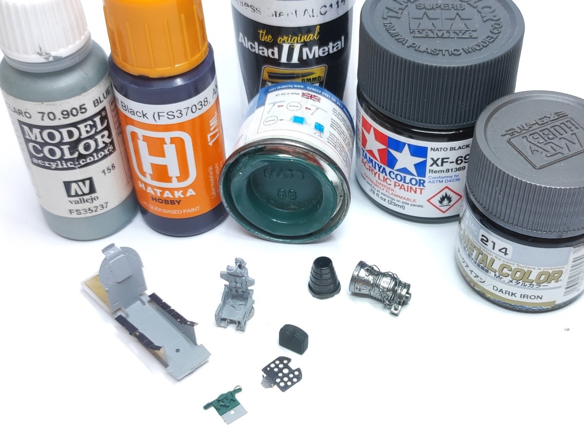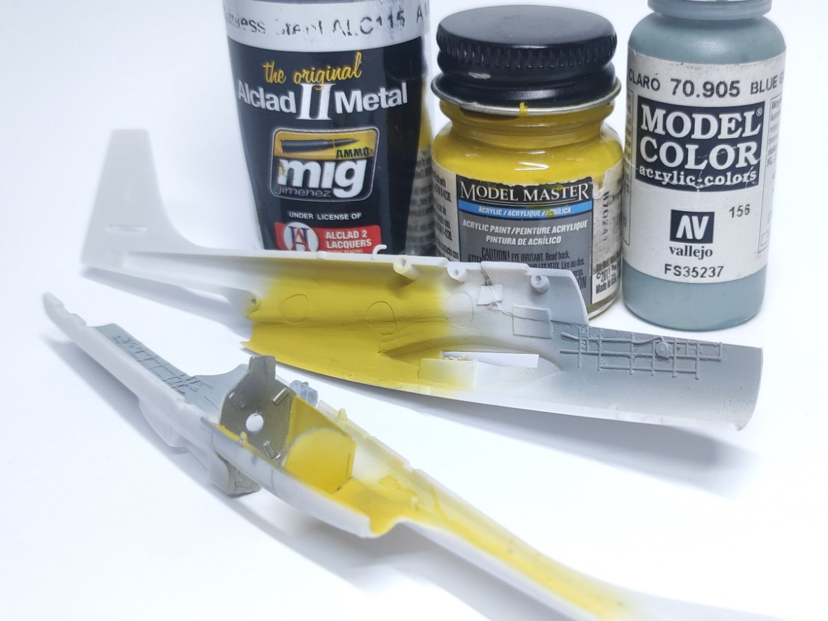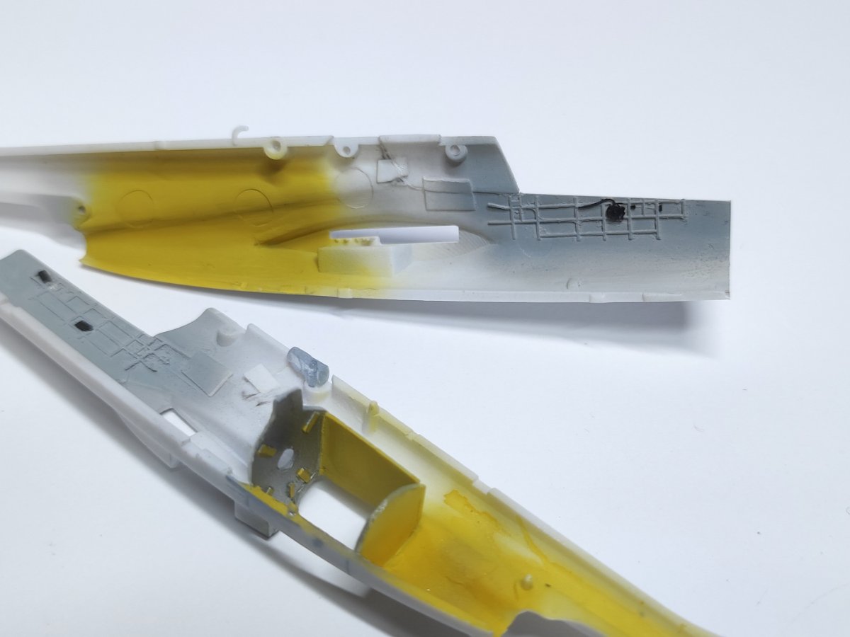 Moses Napisano 31 Grudnia 2025 Autor Share Napisano 31 Grudnia 2025 (edytowane) Wziąłem się za malunki. Najpierw trzeba było jednak przygotować części do tego. Najpierw wszystkie elementy fototrawione oraz druciki pokryłem trzema warstwami Tamiya Metal Primera. Środek ten ma na celu zwiększyć przyczepność farby do metalowych elementów. Następnie pokryłem części szarym Surfacerem 1500. Na koniec aerografem naniosłem kolory bazowe. Edytowane 31 Grudnia 2025 przez Moses 3 Cytuj Odnośnik do komentarza Udostępnij na innych stronach More sharing options...