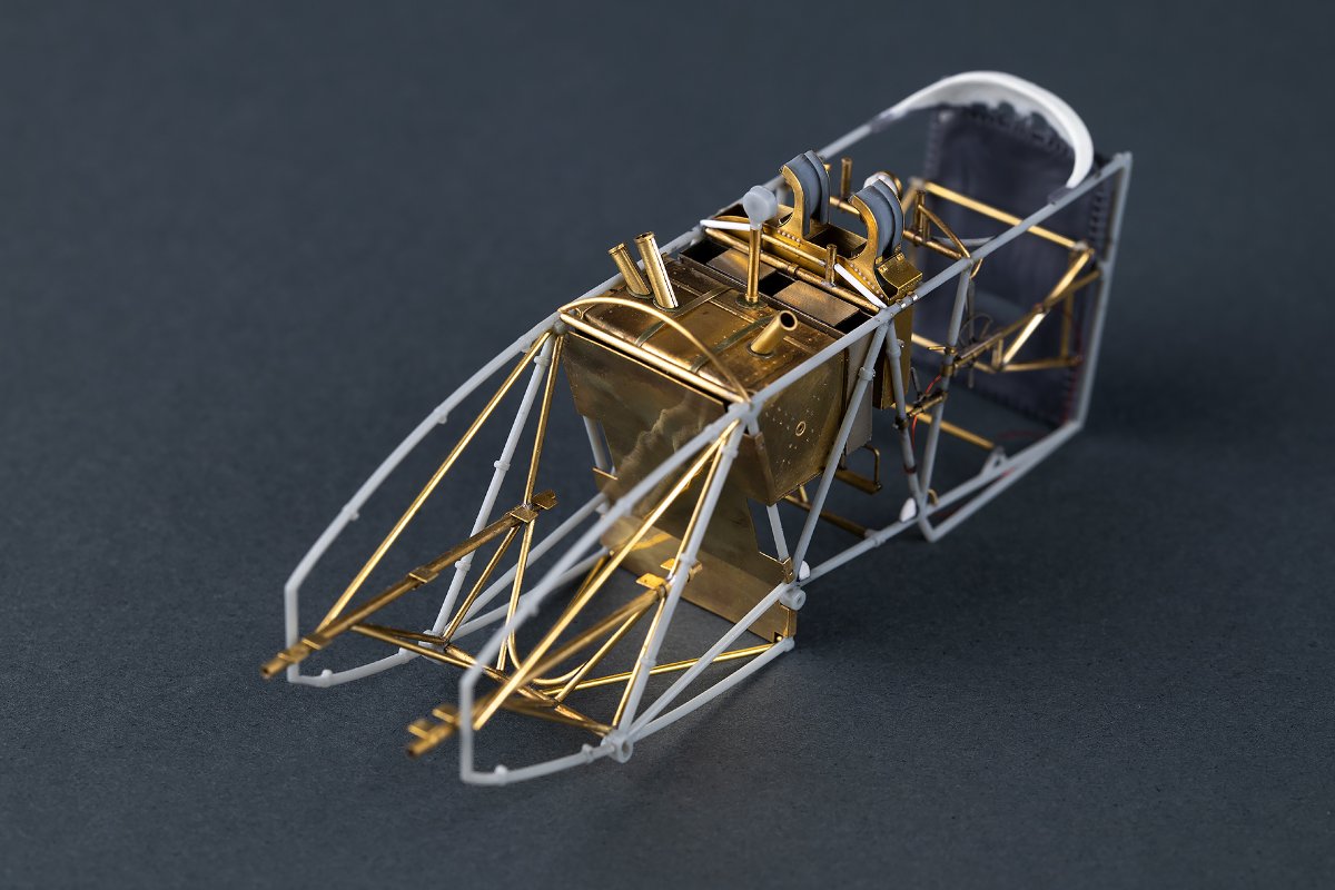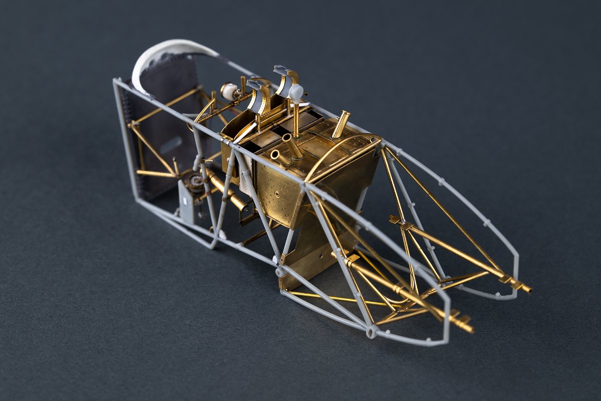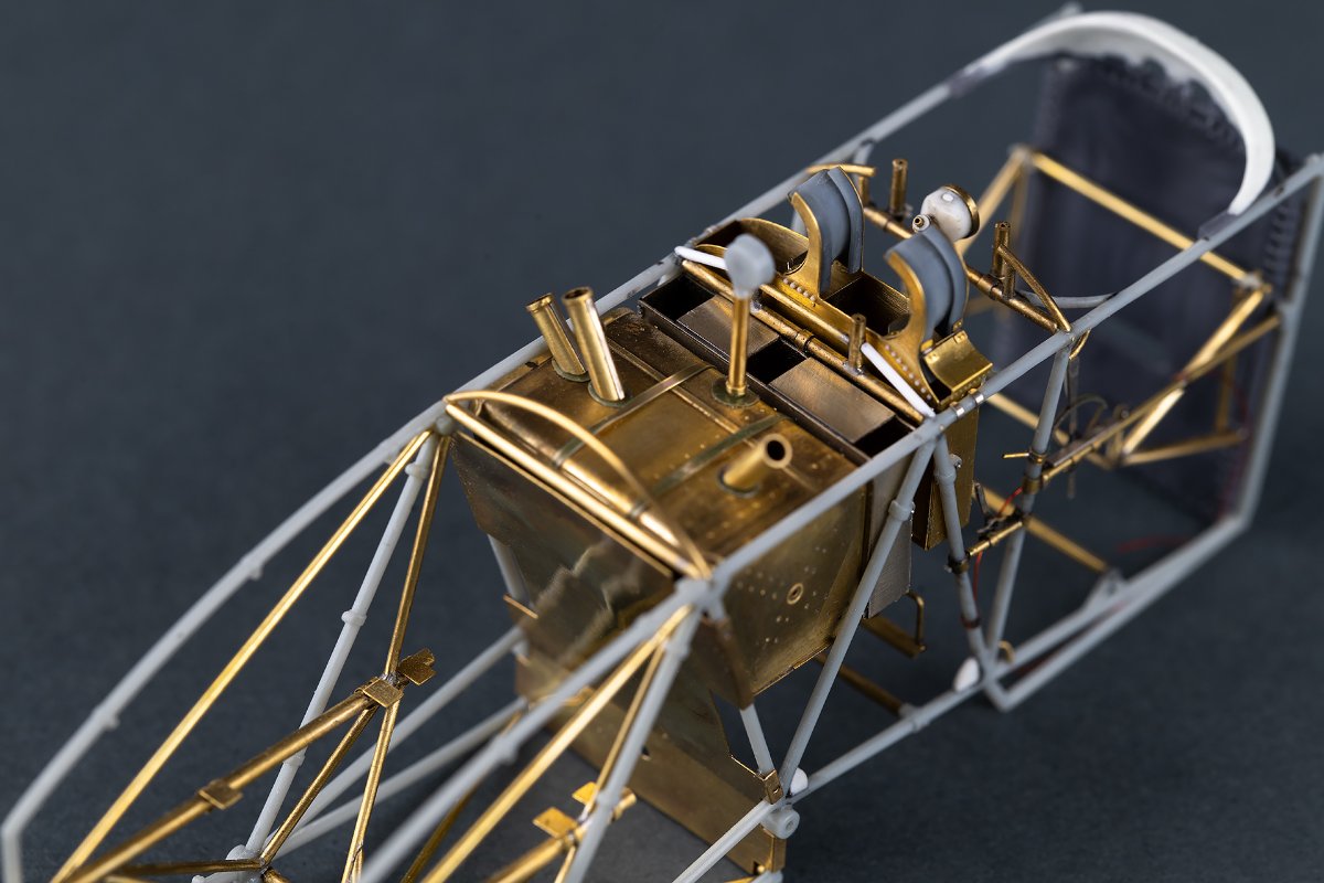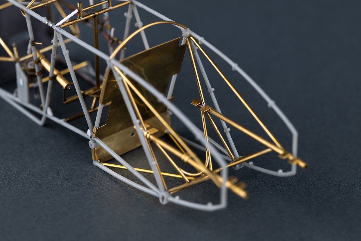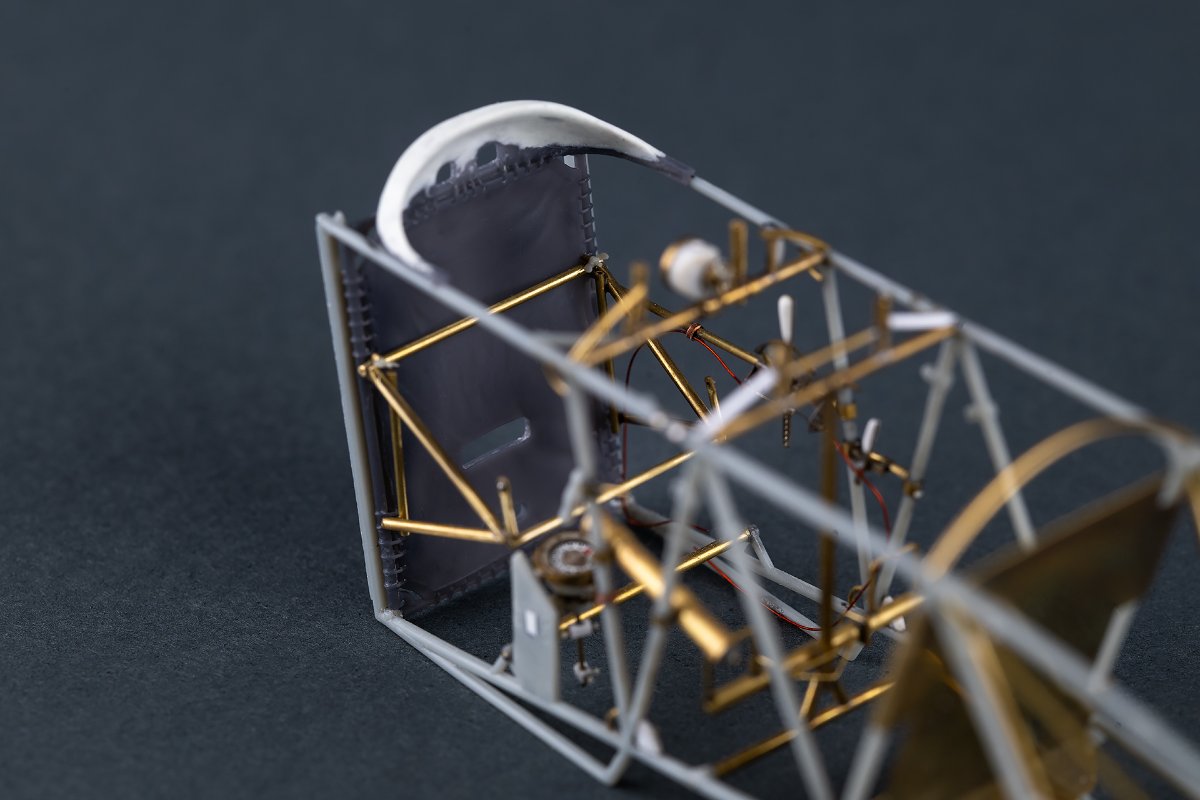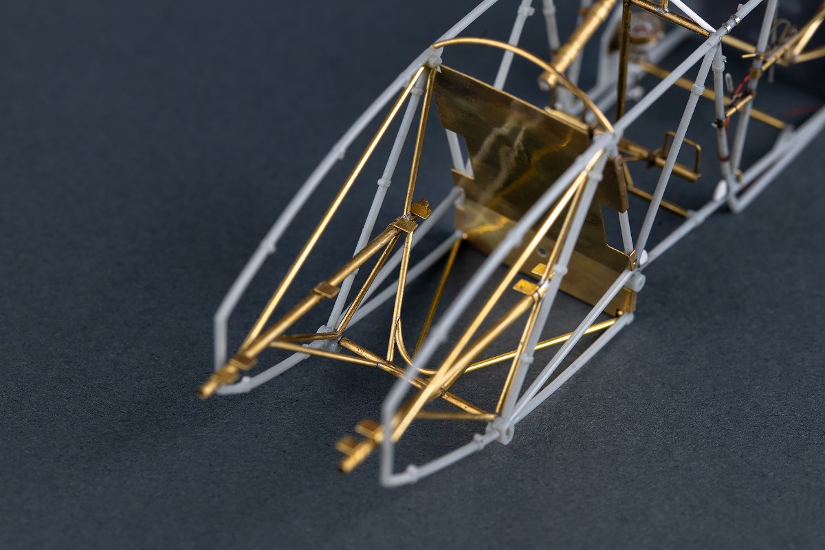 Albatros Napisano Niedziela o 22:28 Autor Share Napisano Niedziela o 22:28 (edytowane) Dziękuję wszystkim bardzo za miłe słowa i cieszę się, że się podoba. @greatgonzo myślę, że znów mocno nadinterpretujesz i nadbudowujesz moje słowa i w zasadzie na każde stwierdzenie z ostatniego posta mam kontrargument, ale wydaje mi się, że to wątek warsztatowy i chyba część osób jest już zmęczona dyskusją filozoficzną i dzieleniem każdego włosa na czworo, a mnie samego duch modelarstwa zaczyna straszyć po nocach więc może dyskusję filozoficzną kontynuujmy w innym wątku, aby nie gmatwać warsztatu Więc na ten moment dość już teorii i przejdźmy do praktyki i warsztatu. Po zakończeniu MiGa zabrałem się nieśpiesznie z powrotem do pracy i oto efekty, jakie przez te kilka miesięcy udało mi się osiągnąć. W pierwszej kolejności chciałem zająć się wręgą z naciągniętym płótnem za fotelem pilota. Na poprzednich zdjęciach widać, jak wygląda część zestawowa, od początku chciałem ją wymienić, ponieważ wydawała mi się zbyt płaska, uproszczona. Ja chciałem zaakcentować, że mamy do czynienia z płótnem, a ponadto podkreślić sznurowane mocowanie płótna do konstrukcji, zrobić je bardziej ażurowe. Problem polegał na tym, że w konstrukcji modelu ten element ma duże znaczenie, aby utrzymać wszystko w kupie i geometrii. Nie bardzo chciałem ją wykonywać od podstaw, bo było tutaj zbyt wiele zmiennych, dlatego wyjściem wydał mi się druk 3d. Poprosiłem o pomoc @Sasiniz Ace Projekt Studio, znając Jej znakomite zestawy z działu pancernego, i po wymianie maili, wiadomości i rysunków Ala wykonała kawał świetnej roboty. Początkowo chciałem mieć wydruk tylko wręgi i płótna, a linkę zaplatać sam. Jednak Ala tak świetnie zaprojektowała całość, że uznałem, że nie ma co wyważać już otwartych drzwi. Kolejnym problemem była konstrukcja górnej części wręgi. W Fokkerze D.VII górna część tej wręgi była wykonywana na dwa sposoby - tak jak w części zestawowej, był półokrągły pałąk i między nim rozpięte płótno. Całość była lekko cofnięta i schowana pod górnym pokryciem kadłuba. Jednakże w Fokkerze w Knowlton - a po dokładnym przestudiowaniu zdjęcia w 382/18 również - zastosowano nieco inne rozwiązanie. Płótno w górnej części nie było rozpięte między rurkami wręgi, a przymocowane do otoku włazu do kokpitu, tworząc coś w rodzaju "kołnierza" dookoła tylnej części włazu. Po długich przymiarkach Ala pięknie zaprojektowała i taką wersję, która wydawała się pasować idealnie. Niestety nie byłem w stanie wysłać jej całego kokpitu, a tylko połówki kadłuba i po wstępnym montażu już do kokpitu okazało się, że jednak "kołnierz" jest zbyt cofnięty i nie przylega do włazu. Odpuściłem na razie kolejne poprawki u Ali, i samemu spróbowałem - na bazie wydruku - poprawić kołnierz "dorzeźbiając" go z Tamiya Epoxy Putty Smooth. Na ten moment wygląda nieźle, muszę położyć podkład, aby sprawdzić powierzchnię i potem już wyrzeźbić fałdy i pomarszczenia. Zdjęcia Fokkera D.VII z Knowlton z charakterystycznym "kołnierzem" dookoła włazu do kokpitu. Na zbliżeniu zdjęcia 382/18 widać, że najprawdopodobniej ten element jest rozwiązany tak samo. Dodatkowo na tym zdjęciu widać, że płotno jest gładkie, bez nadrukowanej lozenge. Zgadza się to ze stwierdzeniem Achima Engelsa w [A4], że pierwsze partie Fokkerów nie miały płótna z lozenge wewnątrz, było one wykorzystywane dopiero w późniejszych egzemplarzach. Na zdjęciu widać piękne wydruki od @Sasini, również mała, półokrągła wręga z płótnem montowana do przedniej części ramy, nad płytę oddzielającą przedział silnikowy od zbiornika paliwa. Odkryłem jednak jeszcze jedną informację, która rzuca światło na ewentualne uszkodzenia samolotu, które zaszły już w trakcie walki, a których na zdjęciach nie widać (obszar ten jest w głębokim cieniu). Wusthoff opisuje: "[...] Teraz próbowałem wszystkiego, żeby ponownie uruchomić silnik, ale na próżno – zbiornik paliwa został przebity, a przewód do zbiornika awaryjnego najwyraźniej się zatkał. Huk – kula trafiła w zbiornik paliwa, z którego natychmiast buchnął płomień. Po krótkim namyśle postanowiłem odpiąć się i wyskoczyć z płonącego samolotu. Wolałem życie i zdrowie niż śmierć w płomieniach. Gdy się odpinałem, ogień zgasł z powodu pionowego lotu nurkowego i silnych podmuchów wiatru. Benzyna się wypaliła – szczęście, które towarzyszy lataniu. [...]" [A5] Z tego fragmentu wspomnień Wusthoffa wyciągam dwa wnioski - po pierwsze na kadłubie w okolicach zbiornika paliwa, w kierunku kokpitu (i być może w spodniej części górnego centropłata) musiały pozostać ślady ognia - jakieś osmalenia na górnej blaszanej osłonie. Pożar nie mógł być duży, bo samolot by po prostu eksplodował (zbiornik paliwa jest też bardzo blisko zasobnika z amunicją do MG 08/15), jak również udało się go ugasić w locie nurkowym. Nie mógł się też bardzo rozprzestrzenić, bo ogień szybko zająłby łatwopalne płótno. Na zdjęciach nic takiego nie widać, więc pożar miał stosunkowo mały zasięg, ograniczony do bezpośredniego sąsiedztwa zbiornika paliwa. Niemniej zamierzam uwzględnić ślady tego zdarzenia na moim modelu - a taki mały kawałek płótna w bezpośrednim sąsiedztwie zbiornika raczej na pewno został przynajmniej nadpalony. Z wielkim żalem zrezygnowałem z montażu wydrukowanej już części i wykonałem ten element z rurek, a nad wypalonymi resztkami płótna będę się zastanawiał (być może @Sorispomoże ). Wręga ze stelażem na fotel pilota - wykonanym z rurek, śruby motylkowe od Taurus Models. Dość karkołomnym pomysłem była za to koncepcja wykonania od podstaw z rurek mosiężnych konstrukcji łoża silnika. Do ostatniej chwili nie byłem pewi