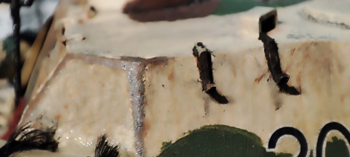 - Plandeki/siatki na wieży - ich tam nie było, bo nie miały się na czym trzymać. Nie ma tam żadnych elementów, do których można przypiąć troki.  Dodatkowo widać, że zlał Ci się klej pod nimi...