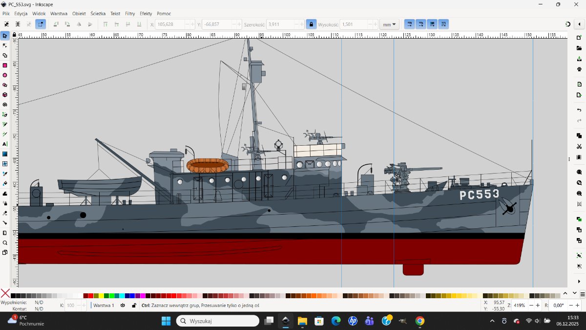 Kingfisher Napisano 6 Grudnia 2025 Share Napisano 6 Grudnia 2025 (edytowane) 2 godziny temu, socjo1 napisał: Flotylla rośnie , to cieszy! A najbardziej ucieszy, jak mam się uda w komplecie dopłynąć do mety Rozpocząłem od zrobienia sobie rysunku PC-ta w wektorach w 1/350. W powiększeniu, jest git ale w oryginalnej wielkości jest to strasznie małe i nie wiem czy nie polegnę w kwestii kamuflażu. Ale, mam alternatywną opcję PC-472 która jest łatwiejsza w malowaniu. Choć w tej opcji trzeba skonstruować cały ten kanadyjski radar i to coś (???) co stoi na mostku zamiast Oerlikona. Zobaczymy jak to będzie na mecie. Może się doczłapie pod koniec przyszłego roku, jako największy maruder Edytowane 6 Grudnia 2025 przez Kingfisher Cytuj Odnośnik do komentarza Udostępnij na innych stronach More sharing options...