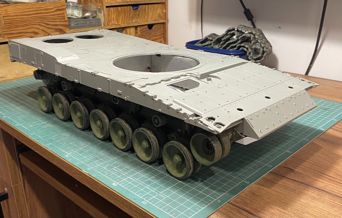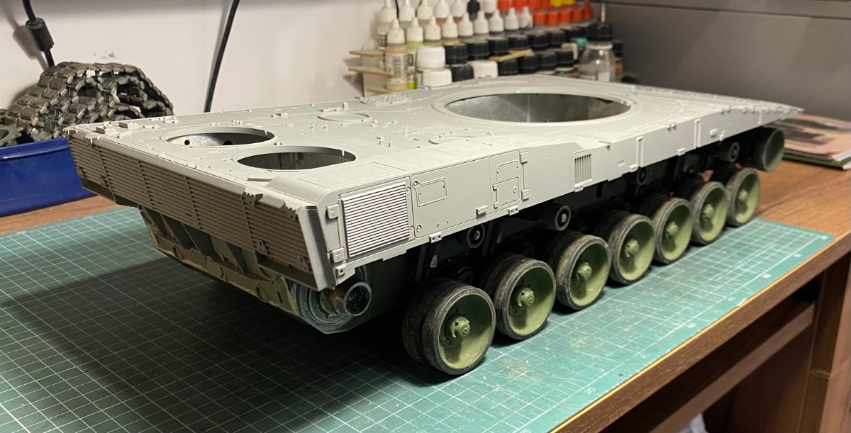 Na warsztat trafia Leopard 2A7V od  Das Werk. Jako, że zasadniczo (może niektórzy wiedzą) zajmuję się modelami RC w skali 1:16, niniejsza budowa bazuje na używanym już metalowym podwoziu i trakcji. Wcześniej śmigała na tym wersja A5 w barwach naszej 34 Brygady Kawalerii Pancernej. Obecnie ten model jest jako statyk do gabloty i do niego poszła wanna i trakcja z modelu Das Werk. Było trochę rzeźbienia na wymiarach metalowej wanny jest szersza o 1 mm i dłuższa o  2 mm w stosunku do DW. W skali 1:35 byłoby to niedopuszczalne, ale w 1:16 ginie 😉  Podzielę się z Wami budową modelu, natomiast bez część RC. Może dodam tylko, że to ta sama wanna i bajery, co na tym filmie:
