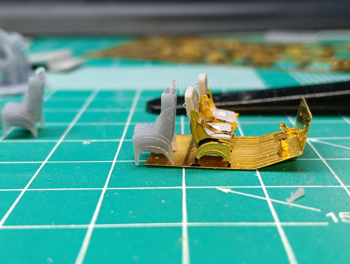 Vieh_san Napisano Wtorek o 22:35 Autor Share Napisano Wtorek o 22:35 Zaczynam standardowo od kokpitu. Podłogę należy spiłować i rozciąć 5mm od stopnia, ale przedtem przygotowanie foteli i podłogi z blaszki. Jamki skurczowe w fotelach zalepione, z tyłu na oparciu miały wypukłe kwadraciki, które miały reprezentować kieszenie. Mało je przypominały, więc użyłem chusteczki zanurzonej w wikolu do uformowania nowych. Fotele przykleiłem i następnie będę się zabierał za pasy. Trochę na zdjęciu krzywo wyszły, ale już jest poprawione. 5 Cytuj Odnośnik do komentarza Udostępnij na innych stronach More sharing options...