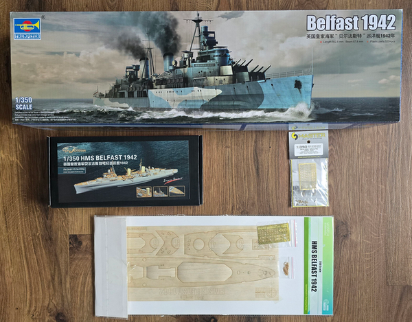 4. Zestaw Trumpeter Belfast 05334 plus waloryzacja Flyhawk FH350117 plus pokład Wood Hunter W35014 plus działka Oerlikon 20mm Master SM-350-050. Cena 600PLN, wysyłka IP 20PLN.