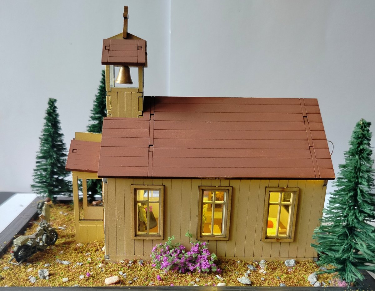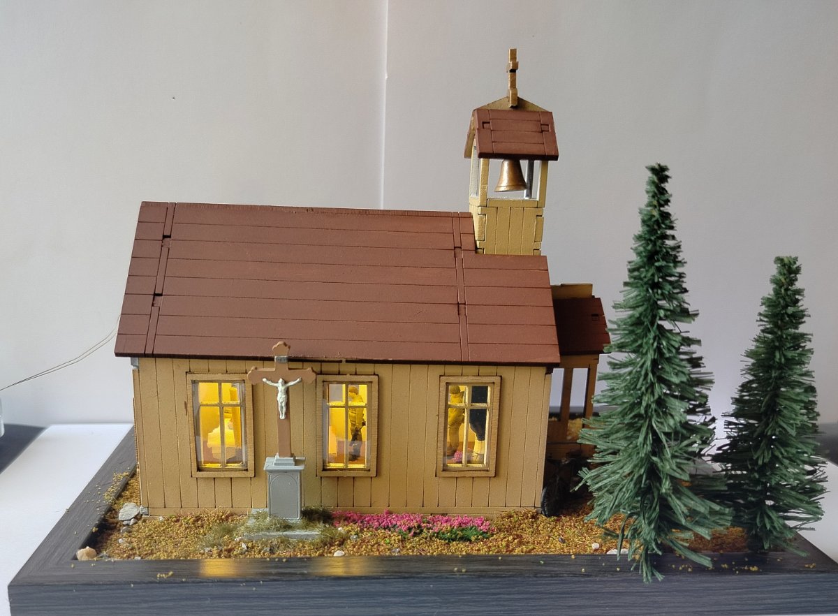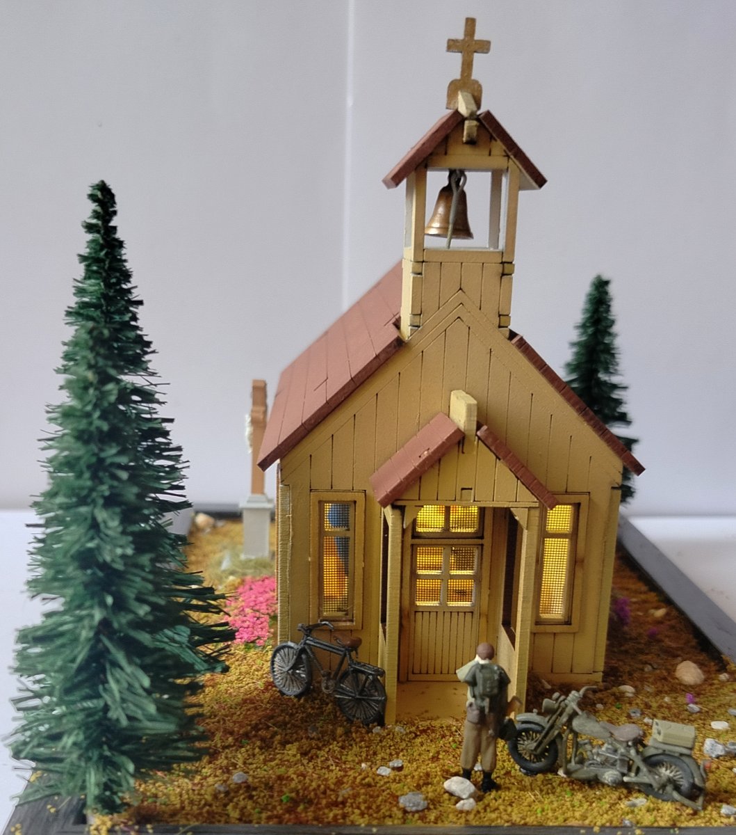 nowicjusz2001 Napisano 7 Grudnia Share Napisano 7 Grudnia Opis: Sam kościół jako taki to drewniane puzzle 3D. Bardzo dobrze ze sobą wzajemnie spasowane. Klejone klejem typu wikol. Problem polega na tym, że w środku pierwotnie było totalnie pusto. Wnętrze całkowicie zrobione w zasadzie od podstaw: Figurka NMP metalowa , pomalowana akrylami AK 3G . Trzy drewniane ławki stworzone z przyciętych patyków do mieszania kawy. Paschał to odpowiednio przycięta wykałaczka. Ołtarz drewno z obrusem z chusteczki. Mszał i lekcjonarz rzeźba w glince z Action. Krzyż Baloton Models . Tabernakulum przerobiona skrzynia z zapasów. Oświetlenie LED za 5 zł (pierwszy raz w życiu) Dwa obrazy: naklejki z dociętymi patyczkami drewna. Dzwon wydruk 3D od Maciej Andryszak plus lina holownicza z zapasów, montowane na pojedynczym zszywaczu. Na zewnątrz: Drzewa ze sklepu modelarskiego. Ziemia i kwiaty zamówione na Aliexpress. Krzyż Baloton Models (ten sam model co w środku). Rower z tego co pamiętam IDAP technologu. Motocykl Harley WLA od Academy. Modlący się żołnierze FC ModelTrend - dobrze, że trzech jest w środku bo produkt conajmniej dyskusyjnej jakości. Genialne inaczej podpory, utrudniające prawidłowe usunięcie figurek i taki sobie detal. Żołnierz robiący facepalm najlepiej to podsumowuje - poziom figurek. Przy następnym takim przedsięwzięciu wezmę uwagi zaznaczone w warsztacie są cenne. P.S generalnie ten dach przylega akurat kabelek lekko go podniósł. 1 Cytuj Odnośnik do komentarza Udostępnij na innych stronach More sharing options...