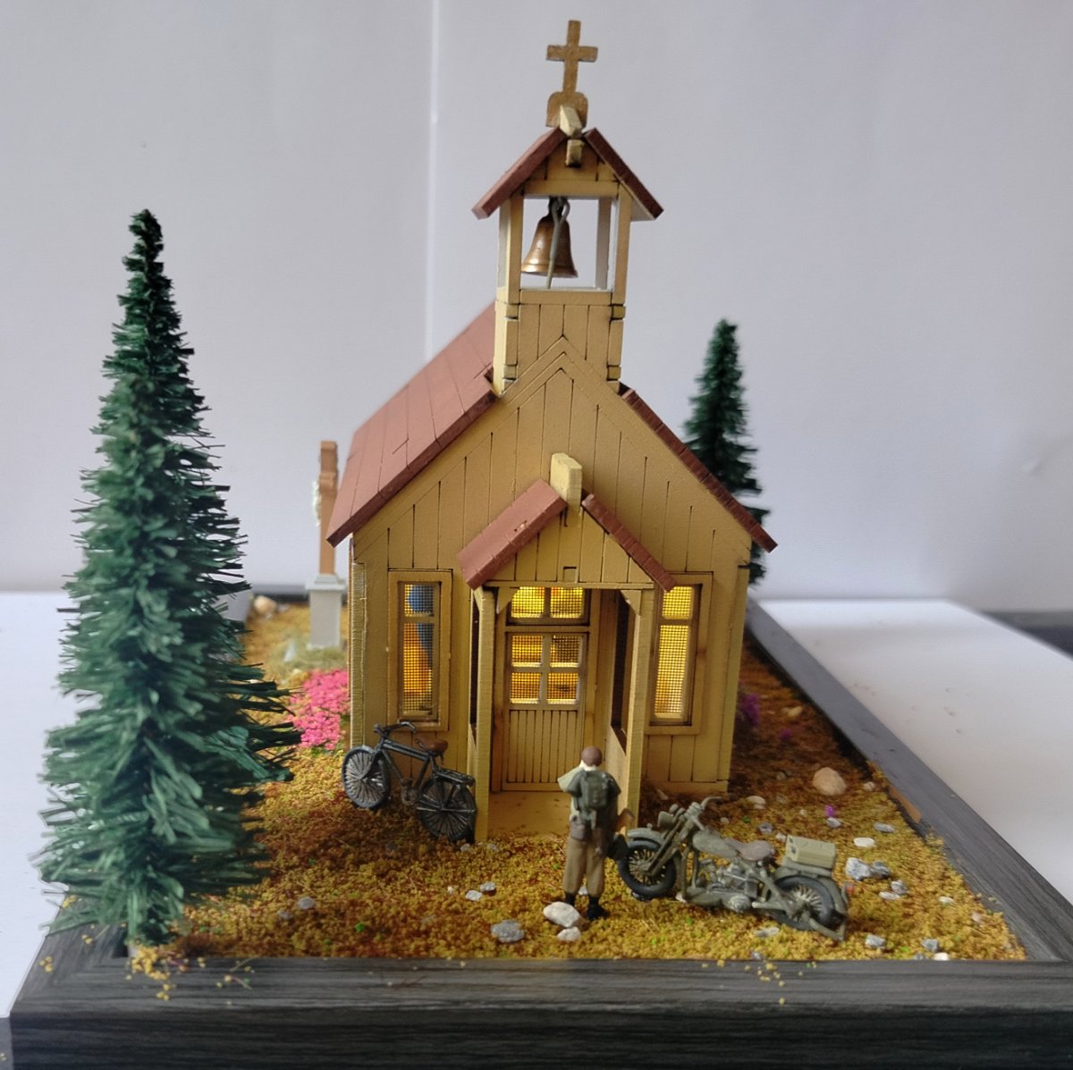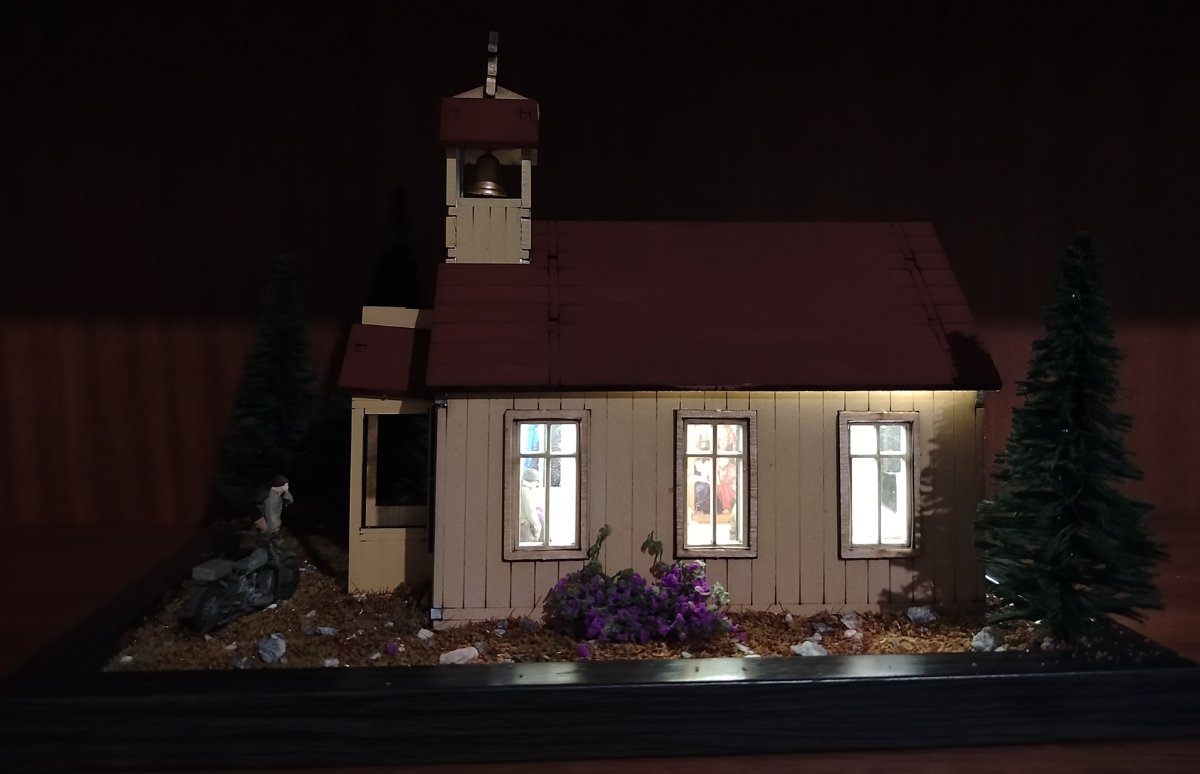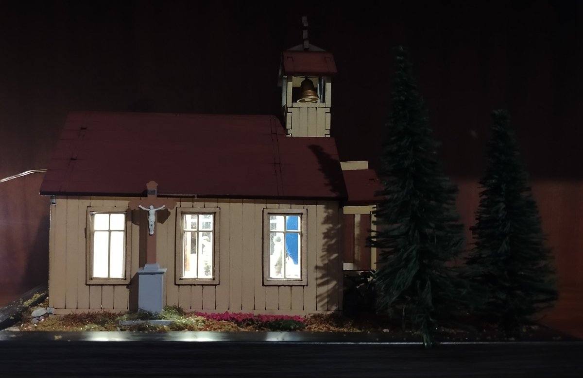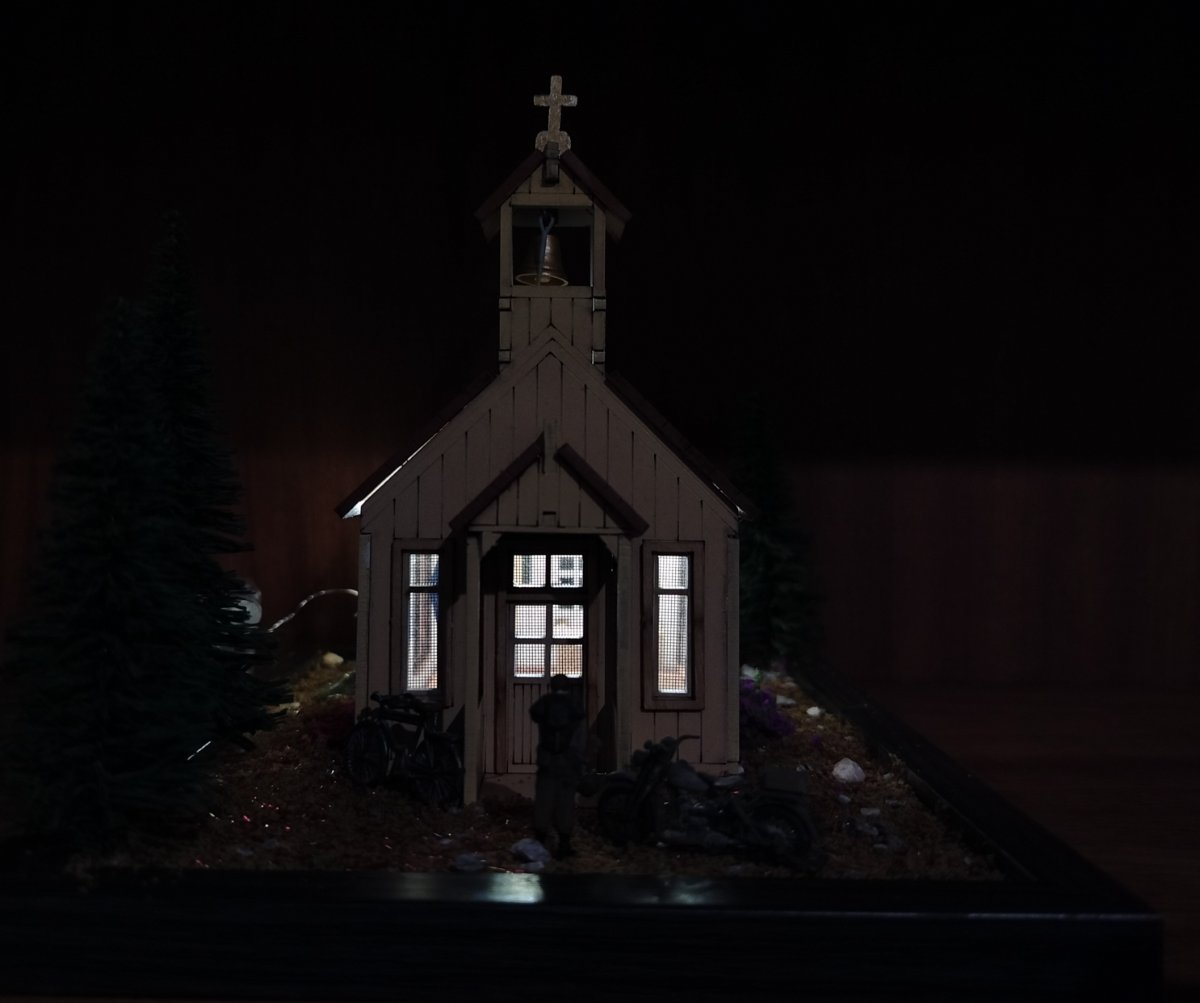 nowicjusz2001 Napisano 7 Grudnia Share Napisano 7 Grudnia Opis: Sam kościół jako taki to drewniane puzzle 3D. Bardzo dobrze ze sobą wzajemnie spasowane. Klejone klejem typu wikol. Problem polega na tym, że w środku pierwotnie było totalnie pusto. Wnętrze całkowicie zrobione w zasadzie od podstaw: Figurka NMP metalowa , pomalowana akrylami AK 3G . Trzy drewniane ławki stworzone z przyciętych patyków do mieszania kawy. Paschał to odpowiednio przycięta wykałaczka. Ołtarz drewno z obrusem z chusteczki. Mszał i lekcjonarz rzeźba w glince z Action. Krzyż Baloton Models . Tabernakulum przerobiona skrzynia z zapasów. Oświetlenie LED za 5 zł (pierwszy raz w życiu) Dwa obrazy: naklejki z dociętymi patyczkami drewna. Dzwon wydruk 3D od Maciej Andryszak plus lina holownicza z zapasów, montowane na pojedynczym zszywaczu. Na zewnątrz: Drzewa ze sklepu modelarskiego. Ziemia i kwiaty zamówione na Aliexpress. Krzyż Baloton Models (ten sam model co w środku). Rower z tego co pamiętam IDAP technologu. Motocykl Harley WLA od Academy. Modlący się żołnierze FC ModelTrend - dobrze, że trzech jest w środku bo produkt conajmniej dyskusyjnej jakości. Genialne inaczej podpory, utrudniające prawidłowe usunięcie figurek i taki sobie detal. Żołnierz robiący facepalm najlepiej to podsumowuje - poziom figurek. Przy następnym takim przedsięwzięciu wezmę uwagi zaznaczone w warsztacie są cenne. P.S generalnie ten dach przylega akurat kabelek lekko go podniósł. 1 Cytuj Odnośnik do komentarza Udostępnij na innych stronach More sharing options...
