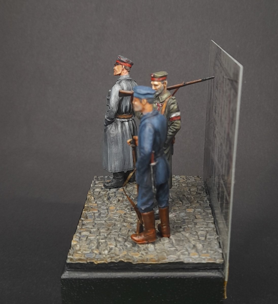 Trzej powstańcy wielkopolscy stoją na poznańskiej ulicy, w tle Hotel Bazar, z balkonu którego JE Pan Premier Ignacy Jan Paderewski swoim płomiennym przemówieniem porwał patriotyczny tłum do walki.