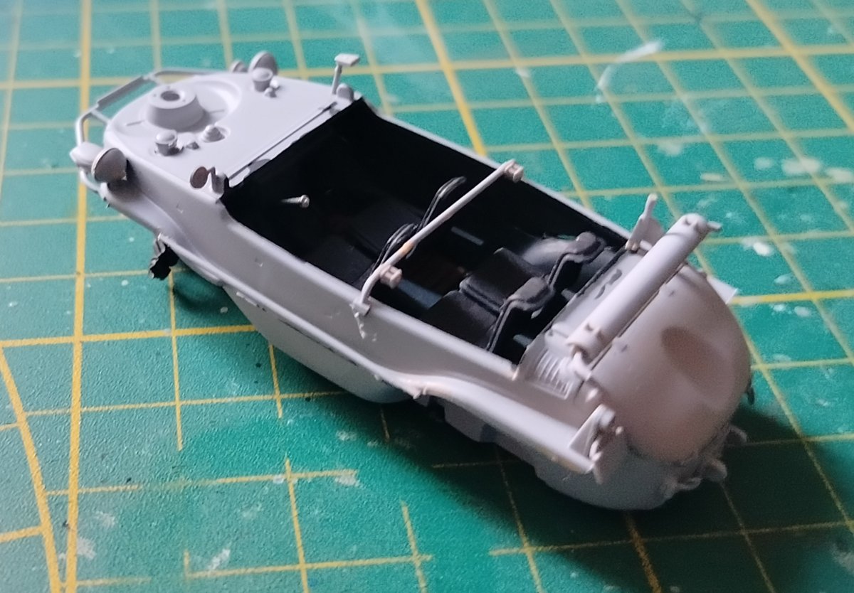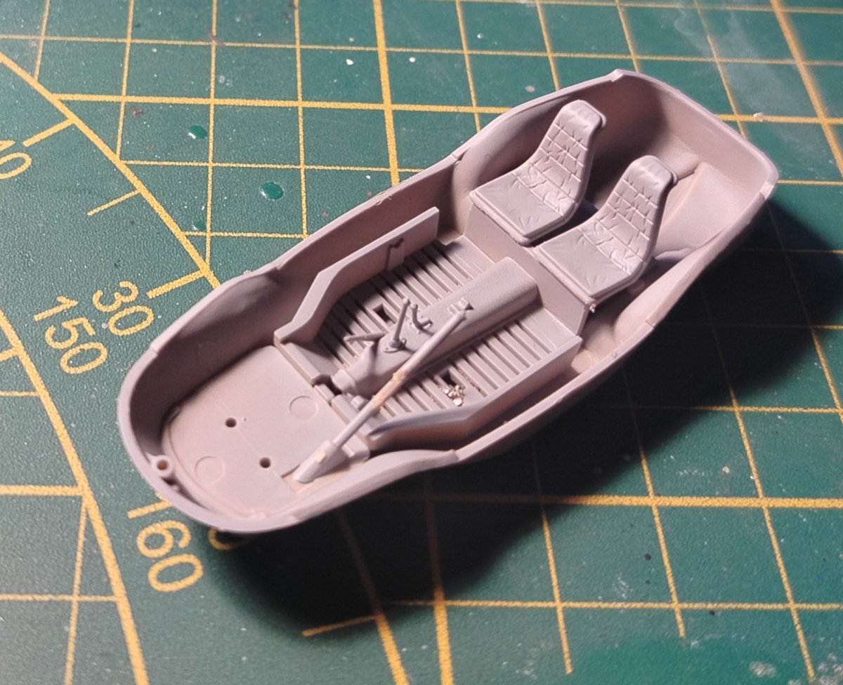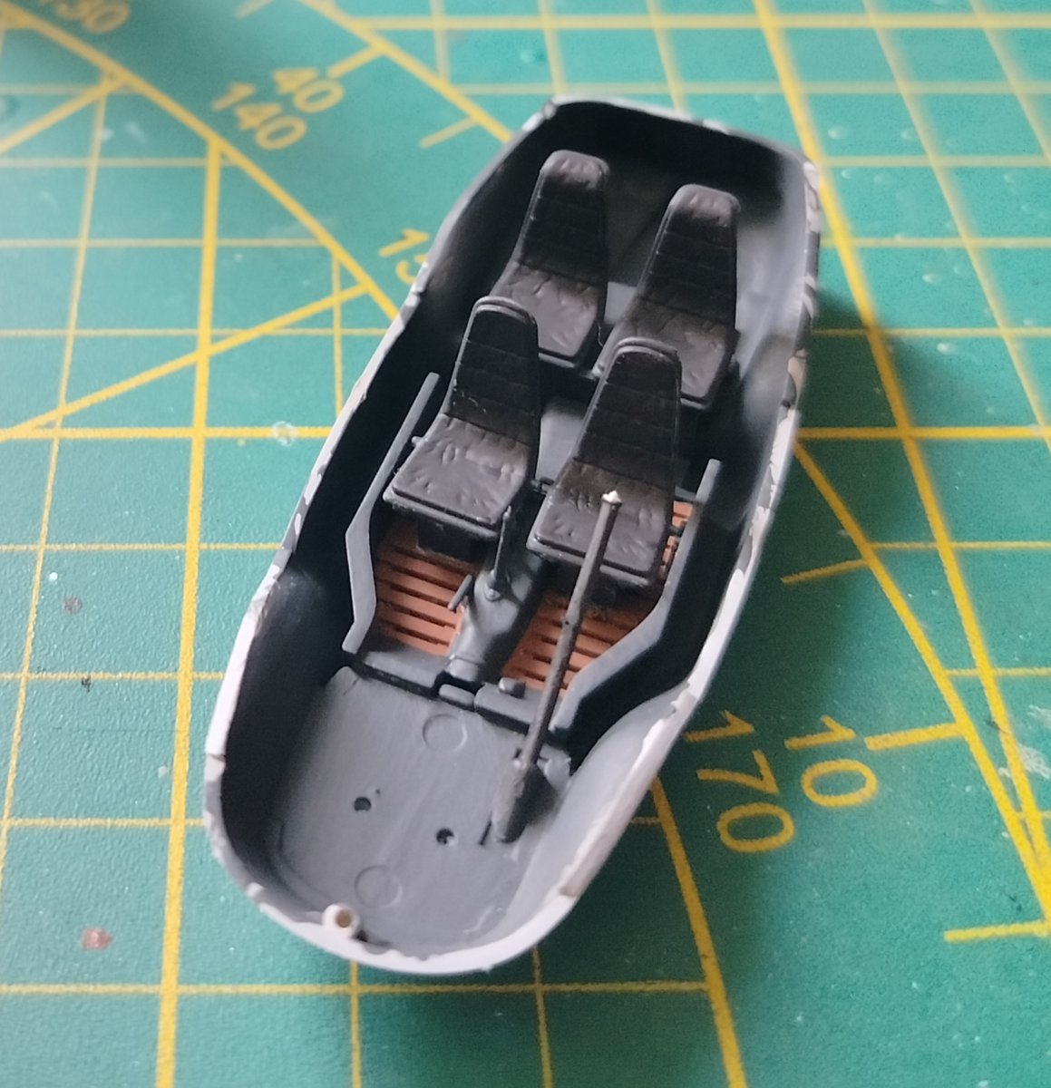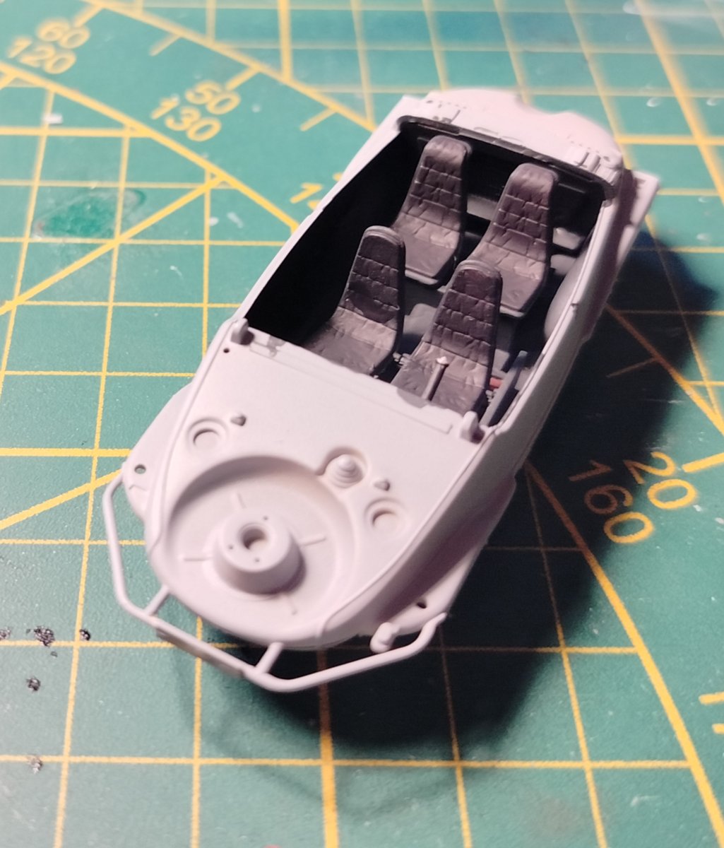 nowicjusz2001 Napisano 3 Stycznia Autor Share Napisano 3 Stycznia Etap budowy wnętrza za mną. W sumie nie działo się tu nic nadzwyczajnego. No może oprócz tego, że mocowanie przednich foteli najpierw zamontowałem odwrotnie niż trzeba. Kierownicę zamontuję później. Użyte kolory: Główny kolor AK11025 German Grey Skóra na fotelach AK11026 Tenebrous Grey Podłoga (ta drewniana) AK1106 Mahogany Brown Kilka elementów AK11029 Black I teraz ciekawostka dozownik podstawowej farby zgromadził jakimś cudem sporo farby, która zaschnęła w coś na wzór gęstego błota. Normalnie wystarczy użyć szpilki. Tym razem musiałem zdjąć "dziubek". Gluta w środku potraktowałem kilka kroplami AK11505 Perfect Cleaner - specyfik do czyszczenia aero i pędzli. Spisał się na . 1 Cytuj Odnośnik do komentarza Udostępnij na innych stronach More sharing options...