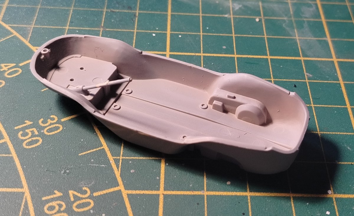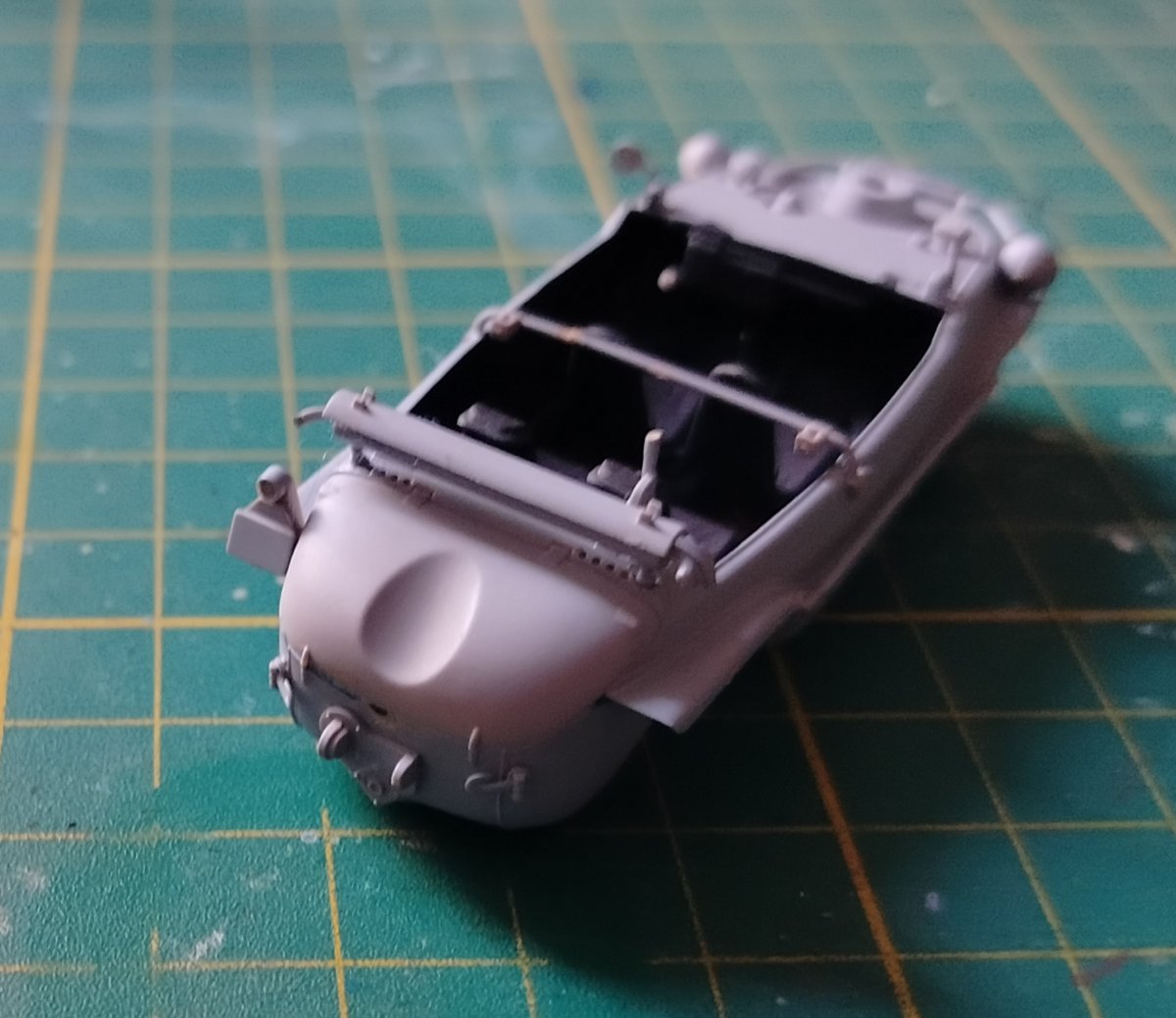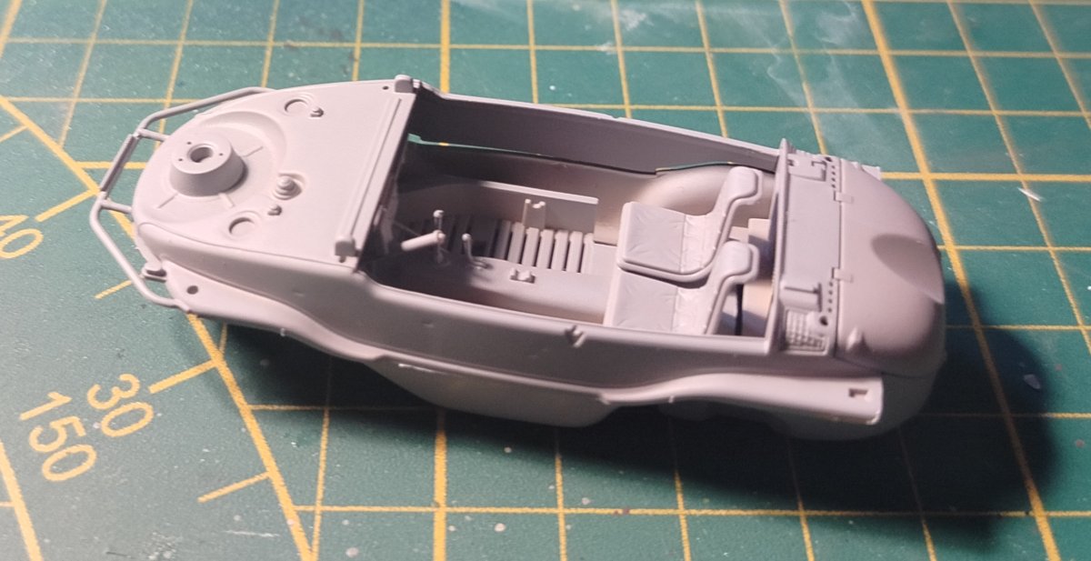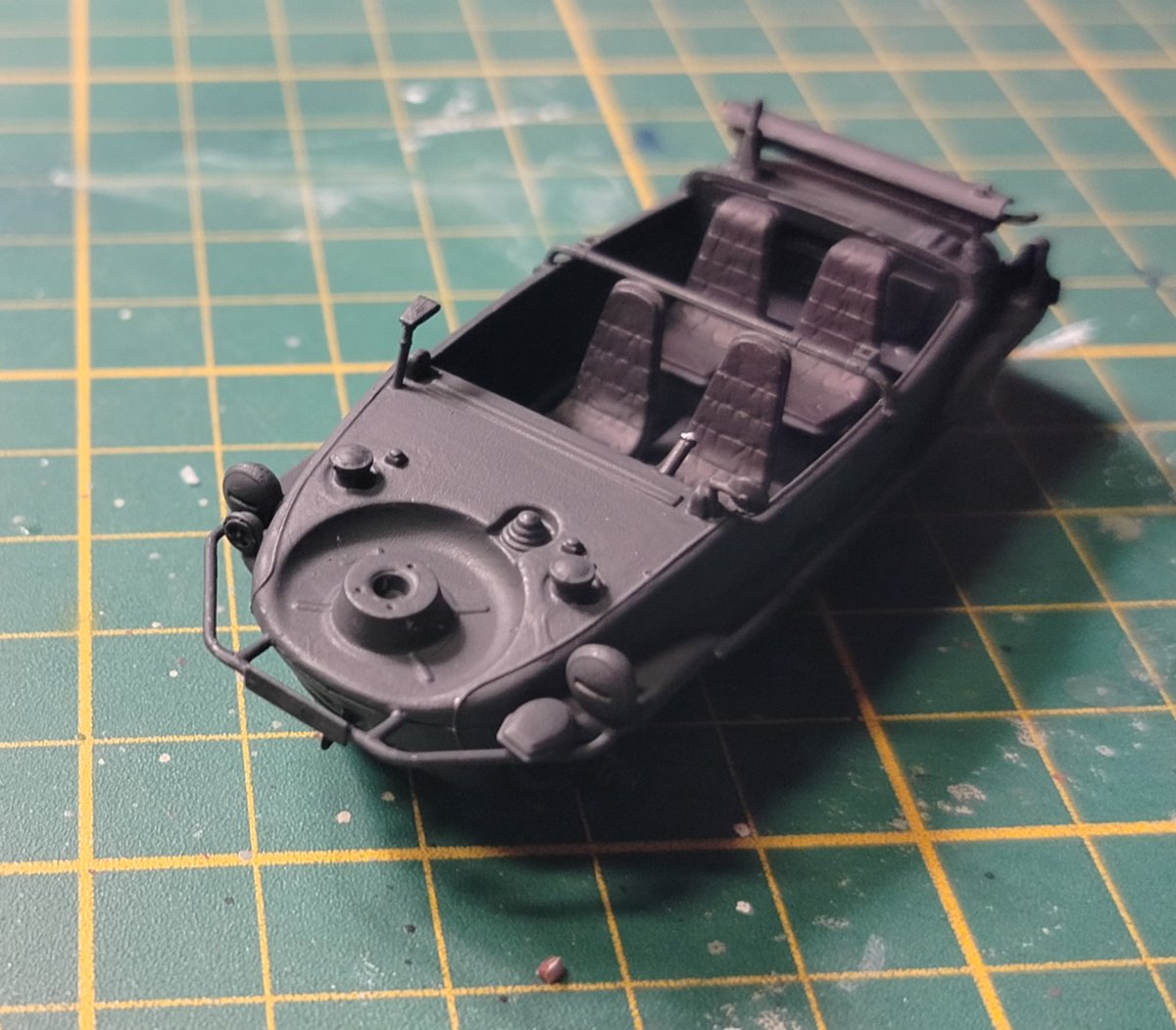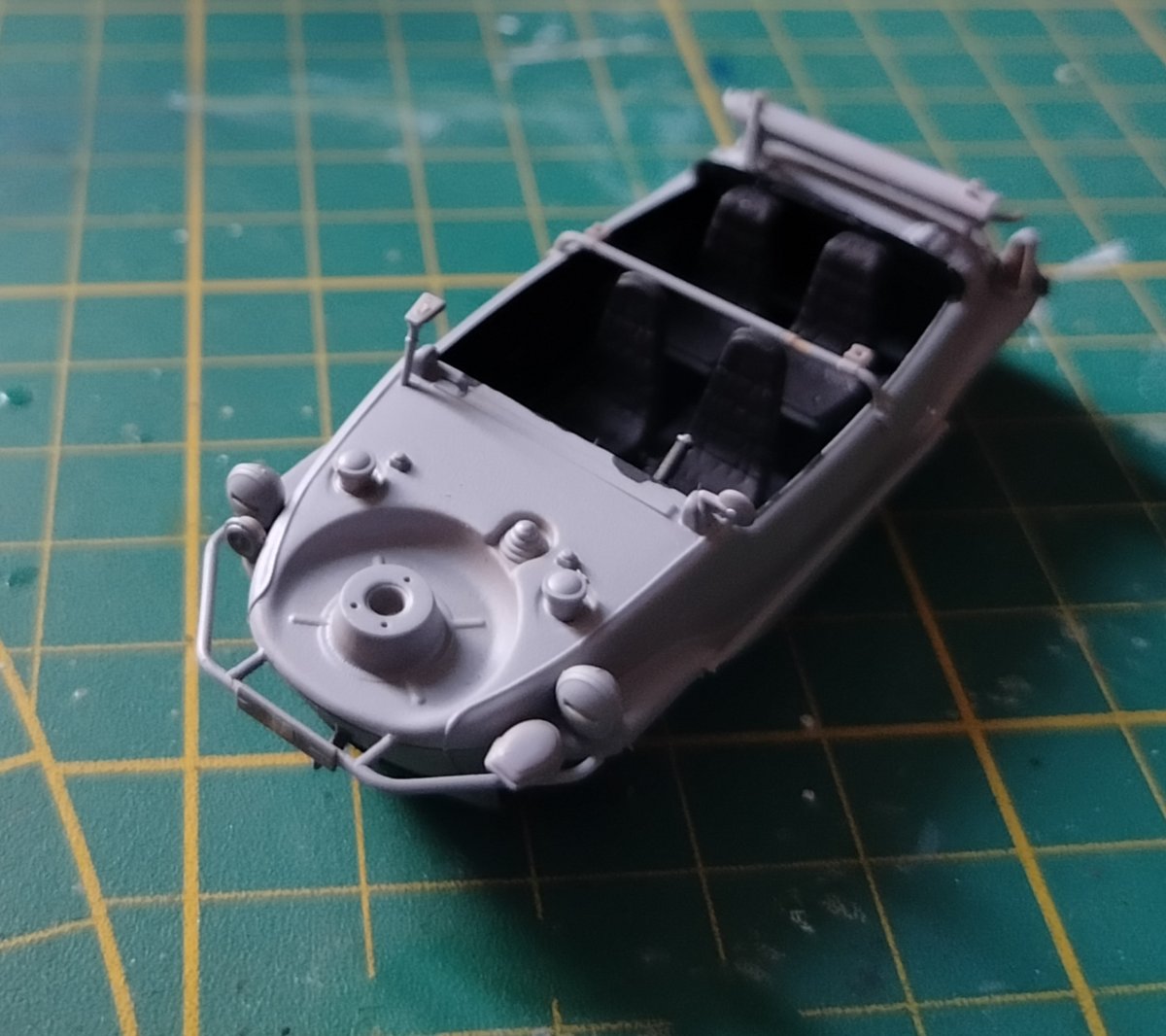 nowicjusz2001 Napisano 3 Stycznia Autor Share Napisano 3 Stycznia Etap budowy wnętrza za mną. W sumie nie działo się tu nic nadzwyczajnego. No może oprócz tego, że mocowanie przednich foteli najpierw zamontowałem odwrotnie niż trzeba. Kierownicę zamontuję później. Użyte kolory: Główny kolor AK11025 German Grey Skóra na fotelach AK11026 Tenebrous Grey Podłoga (ta drewniana) AK1106 Mahogany Brown Kilka elementów AK11029 Black I teraz ciekawostka dozownik podstawowej farby zgromadził jakimś cudem sporo farby, która zaschnęła w coś na wzór gęstego błota. Normalnie wystarczy użyć szpilki. Tym razem musiałem zdjąć "dziubek". Gluta w środku potraktowałem kilka kroplami AK11505 Perfect Cleaner - specyfik do czyszczenia aero i pędzli. Spisał się na . 1 Cytuj Odnośnik do komentarza Udostępnij na innych stronach More sharing options...