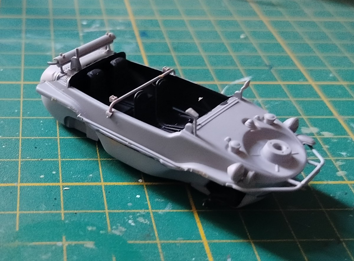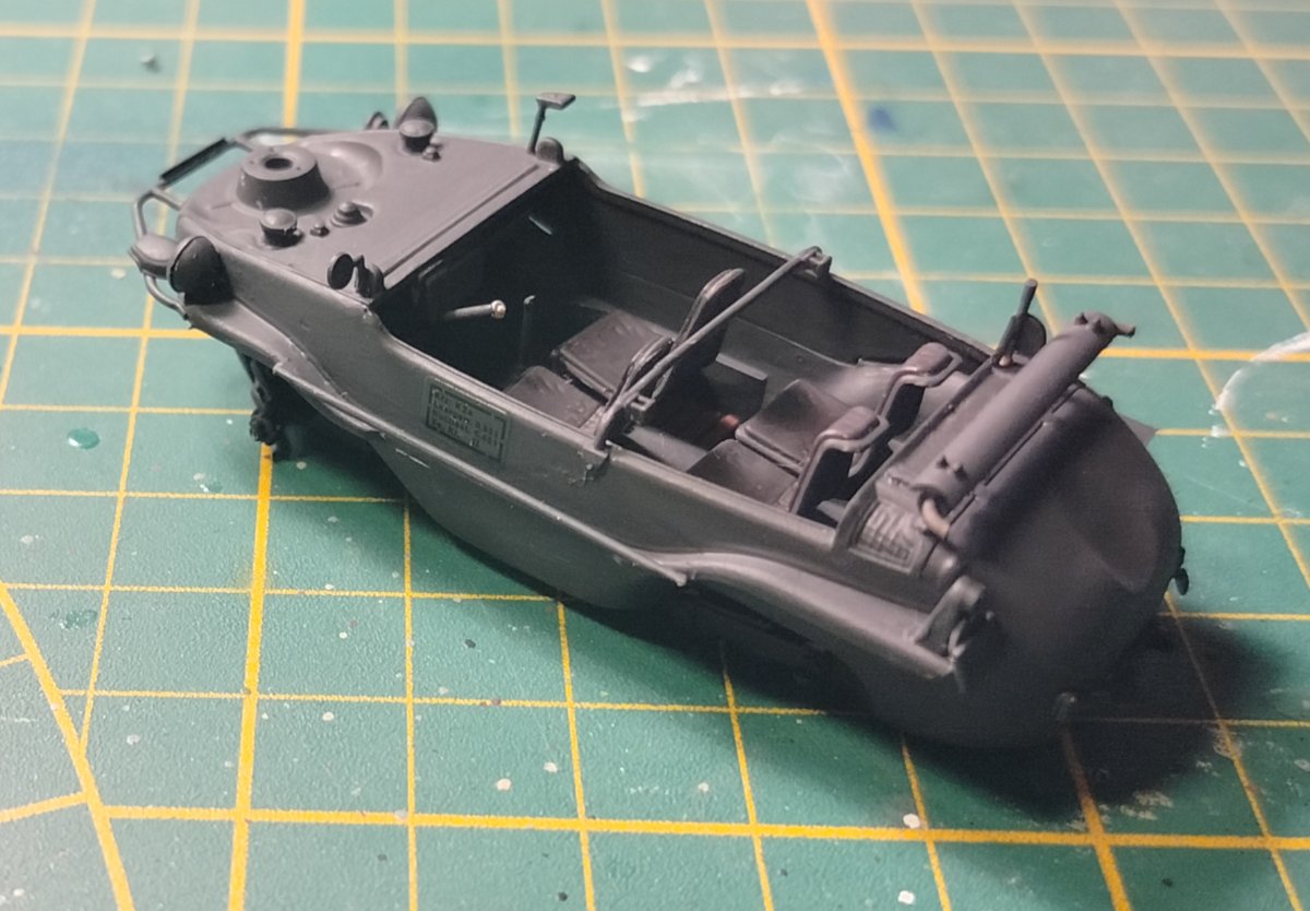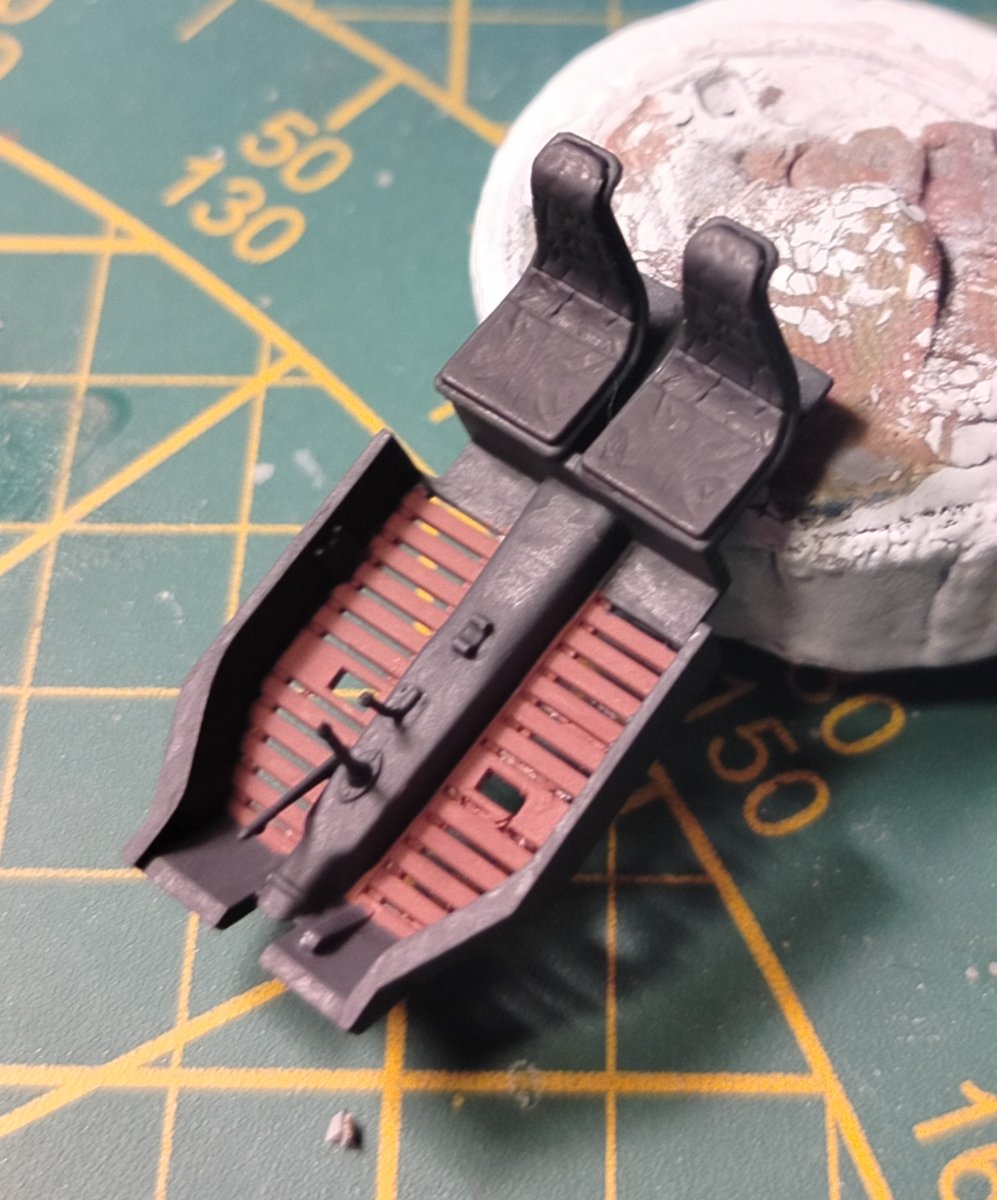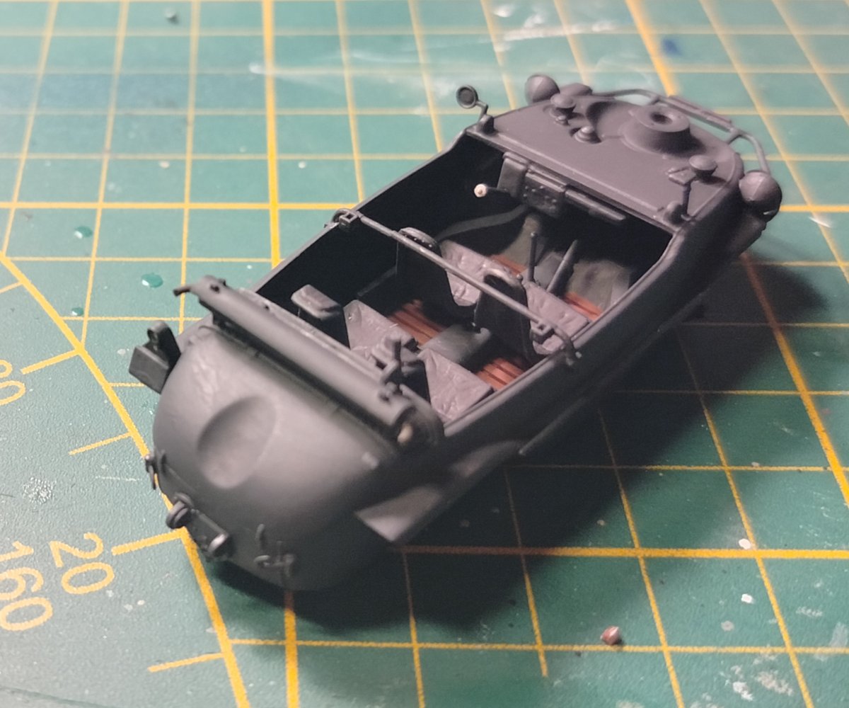 nowicjusz2001 Napisano 3 Stycznia Autor Share Napisano 3 Stycznia Etap budowy wnętrza za mną. W sumie nie działo się tu nic nadzwyczajnego. No może oprócz tego, że mocowanie przednich foteli najpierw zamontowałem odwrotnie niż trzeba. Kierownicę zamontuję później. Użyte kolory: Główny kolor AK11025 German Grey Skóra na fotelach AK11026 Tenebrous Grey Podłoga (ta drewniana) AK1106 Mahogany Brown Kilka elementów AK11029 Black I teraz ciekawostka dozownik podstawowej farby zgromadził jakimś cudem sporo farby, która zaschnęła w coś na wzór gęstego błota. Normalnie wystarczy użyć szpilki. Tym razem musiałem zdjąć "dziubek". Gluta w środku potraktowałem kilka kroplami AK11505 Perfect Cleaner - specyfik do czyszczenia aero i pędzli. Spisał się na . 1 Cytuj Odnośnik do komentarza Udostępnij na innych stronach More sharing options...