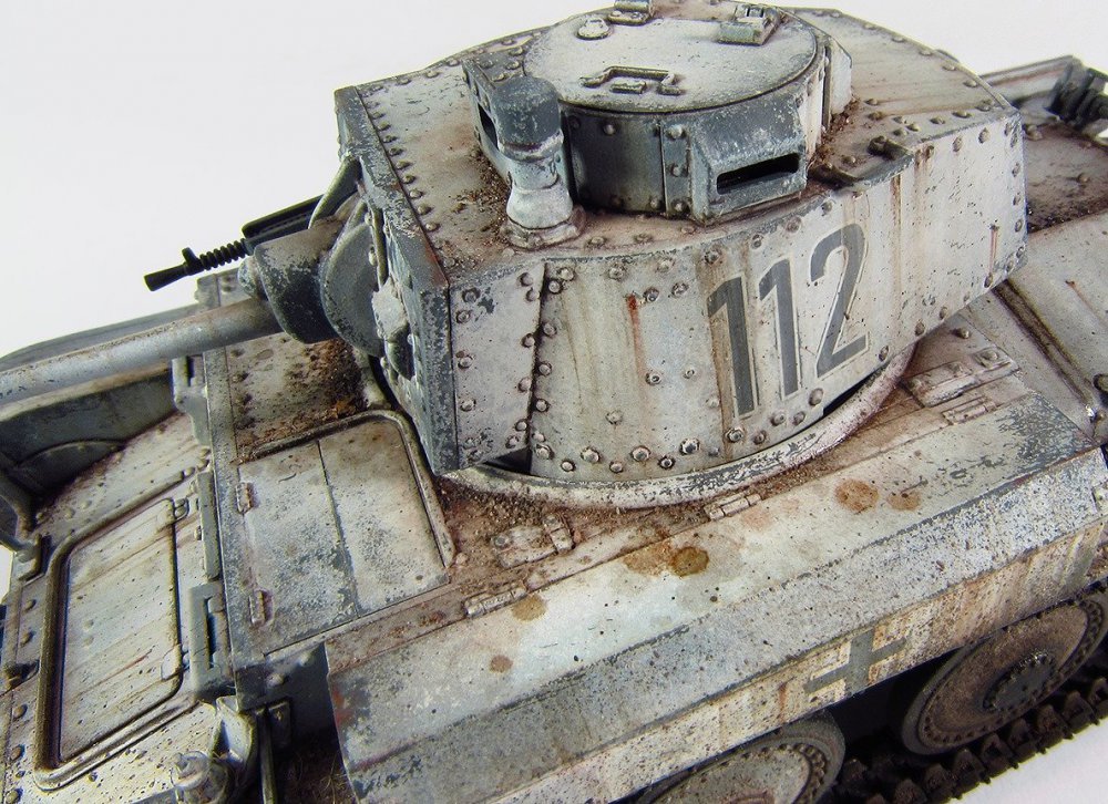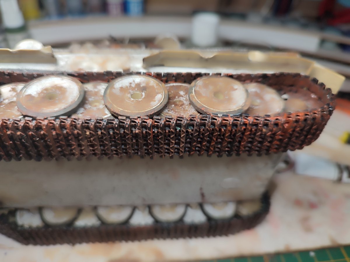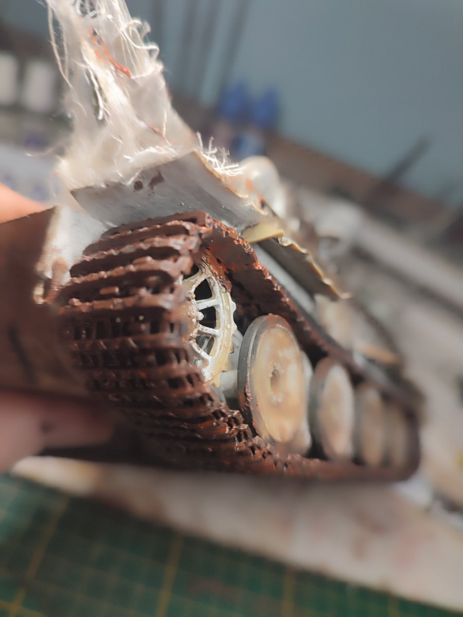 Mariusz 72 Napisano 17 Lutego Share Napisano 17 Lutego (edytowane) Niestety nie widziałem. Skoro ten model tak upaprałeś to gąsienice też by wypadało. Proponuje weź ciemnobrązową farbkę olejną lub jakiś akryl i d e l i k t n i e rzadką farbą na krawędziach porób rdze. Na koniec gęstą farbą punktowo możesz trochę mocniej. Powinno mu trochę pomóc... Masz pomieszane kolory na tym modelu. Gdyby to co u Ciebie jest brązowe (chyba miała to być rdza) było w kolorze panzegrau to by ten model wyglądał ok. Czyli... jakbyś wziął farbę ciemno-szarą i zamalował te jasne brązy, a potem ciemną brązową zrobił rdzę na krawędziach to by było poprawnie. Pozdro Tu przykład. Zobacz jak to gość zrobił i wszystko jest bardzo drobniutkie. Trzeba drobić... Edytowane 17 Lutego przez Mariusz 72 1 Cytuj Odnośnik do komentarza Udostępnij na innych stronach More sharing options...
